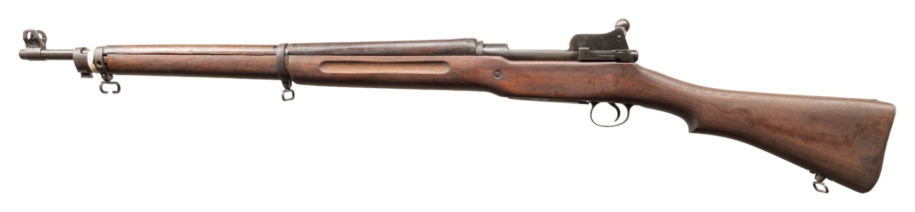 RIFLE. Cal. 30-06. S# 890784. Bbl. 26". Bbl. is marked behind front sight "E / flaming bomb / 10-17". Ladder rear sight graduated to 1,600 yards. Blade front sight w/ protective ears. Receiver is marked on left rail w/ "flaming bomb". Bolt marked only w/ "flaming bomb / 9". Bolt shroud, cocking piece, sight ladder & bolt stop marked "E". Sight slide is marked "W". Walnut stock set. Replacement buttstock is marked "W" at stock tip. Stock has notably thin finish. Handguards appear to be original. Upper band retaining screw is not present. CONDITION: buttstock has light wear & scattered handling marks. Handguards show moderate wear & handling marks. Front handguard has long scratch in the top. Metal retains 75% of its arsenal rework Parkerized finish w/ thinning & light wear. Extractor is broken, extractor claw is not present. Dark bore w/ worn lands. (25-5153/RW). CURIO. $250-350.