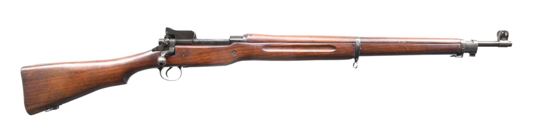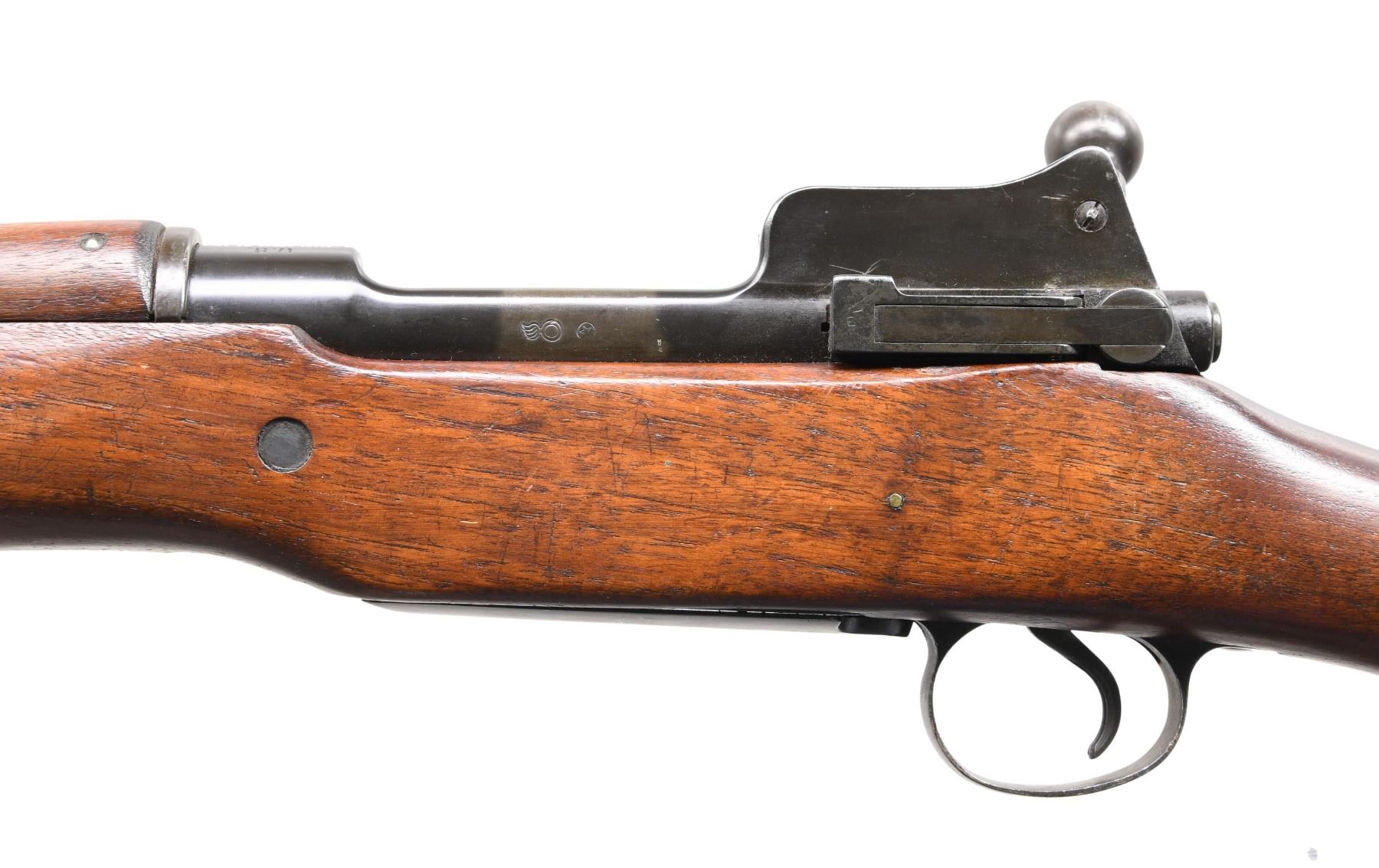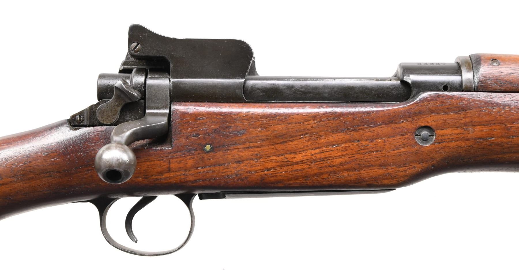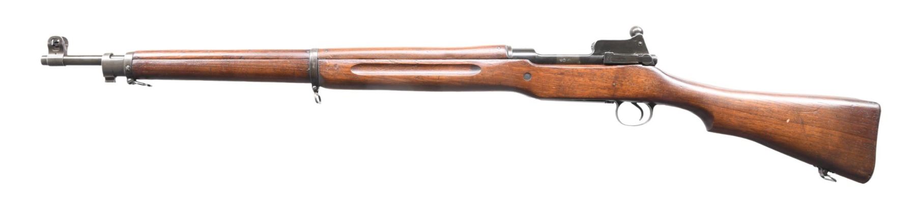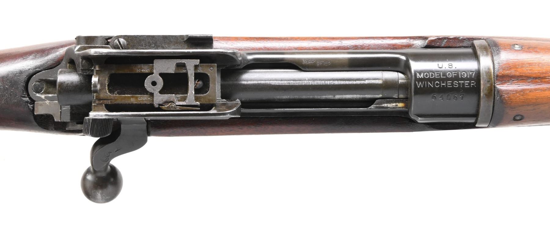RIFLE. Cal. 30-06. S# 64067. Bbl. 26". Barrel is marked behind front sight "E", a flaming bomb, and "5-18". Ladder aperture rear sight. Ladder is marked "W"; sight spring is marked "E". Blade front sight. Sight base marked "E".Receiver has the encircled star to the right of the eagle acceptance mark. This is reported to be present on early Winchesters due to interchangeability issues. The bolt handle and shroud are marked "E". Cocking piece is "W". Bolt release is 'E'. Walnut stock set. Stock is marked "E" at the forend tip. CONDITION: stock set has a nice original finish with moderate wear and handling marks. The receiver has most of its original blue finish; the balance of the parts has a mix of blue and early parkerized finishes. Follower has been modified to allow the bolt to close on an empty magazine. Bore with sharp lands has a small degree of frosting. (24-3905/RW). CURIO. $800-1,200.
