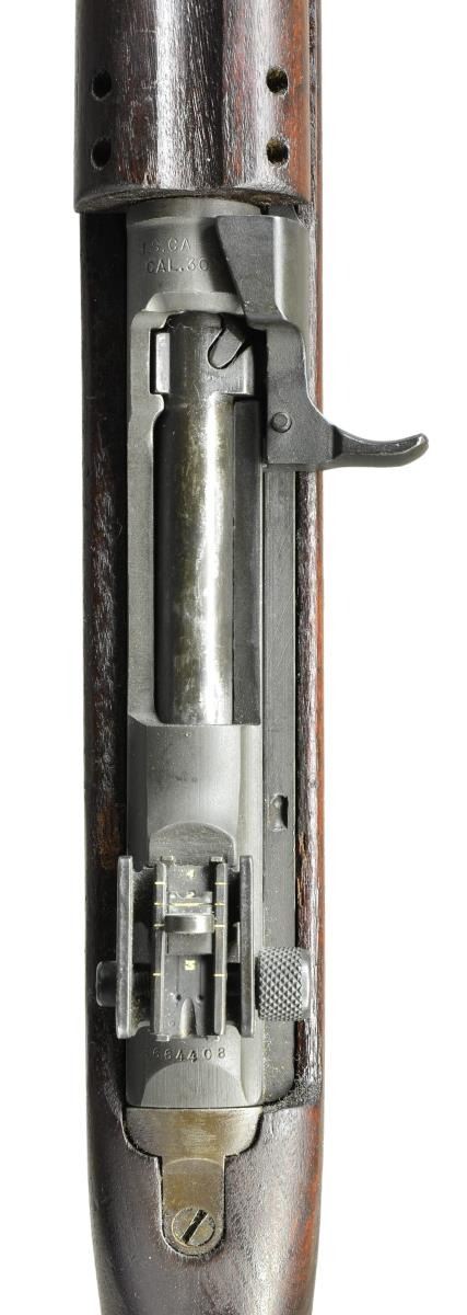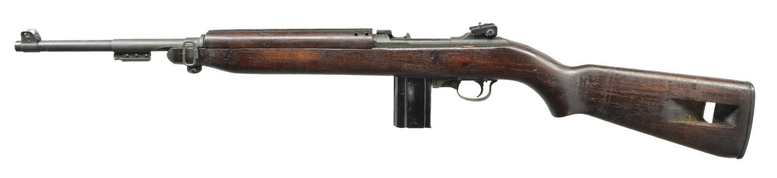 Cal. 30 Carb. S# 3664408. Bbl. 18". Bbl. marked behind front sight "IBM" "CORP" "3-43" "flaming bomb". Stamped adj. rear sight. Front band w/ bayonet lug marked "MMQ". Straight cut slide marked "PI". Rnd. bolt marked "AI". Stamped trigger housing marked w/ "5". Rotary safety. Mag. catch marked "CC". Straight cut hammer marked "HI". Walnut stock set. Low wood oval cut buttstock marked on left side in front of sling slot "STD PROD RWH". Encircled "P" at end of pistol grip. Buttstock marked on right side in white "12" "1075". 4 Rivet handguard marked "IO". MAGS: 1-15 rd. marked "AI". CONDITION: stock set finish appears to be original w/ added finish which has wear, flaking & staining. Metal has 85% original parkerized finish w/ light wear & scattered handling marks. Very good shiny bore. (22-1894/RW). CURIO. $600-900.