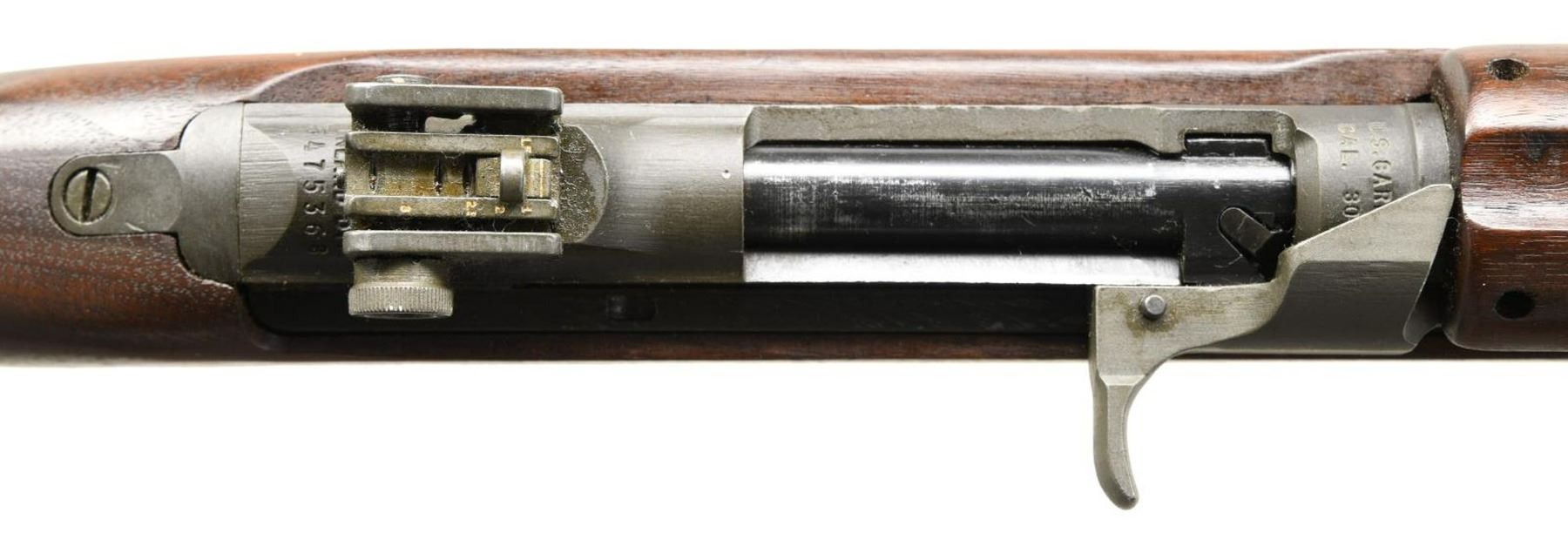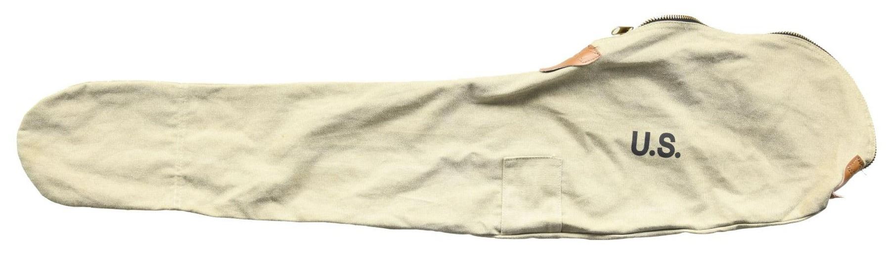 Cal. 30 Carb. S# 5475368. Bbl. 18" marked behind front sight "INLAND MFG. DIV. GENERAL MOTORS 8-44. Milled adjustable rear sight marked "PI". Blade front sight w/ protective ears. Sight base is marked "N". Carbine has a very good appearance as arsenal reworked. Bbl. band w/ wire type swivel has illegible triangular marking. 6 o'clock slide marked "PI". Rnd. bolt marked "IO". Milled trigger housing marked "INLAND". Push button safety. Mag. catch marked "EI". Straight cut hammer marked "H". Oval cut low wood buttstock marked on right side of butt w/ crossed cannons. Marked in sling slot "IO". Replacement stock w/ no visible proof mark. Buttstock has area of thin finish in cheek area likely from removal of arsenal rework. Marking for rivet handguard "HI". MAGS: 1 detachable 15 rd. marked "IA". UNATTACHED ACCESSORIES: reproduction gray/green canvas carrying case w/ zipper closure marked "U.S." in very good condition. CONDITION: stock set has very light wear & tiny handling marks w/ legible markings. Metal retains 90% arsenal rework parkerized finish w/ light high point wear. Very good shiny bore. (23-2604/RW). CURIO. $700-1,100.