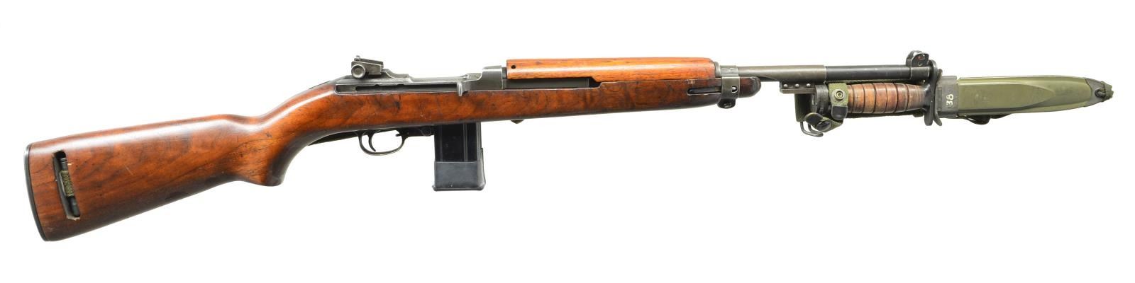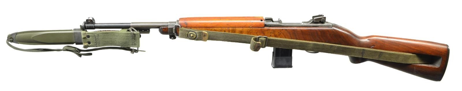 Cal. 30 Carb. S# 4774848. Bbl. 18". Adj. aperture rear sight. Blade front sight w/ protective ears. Bbl. marked behind front sight w/ “INLAND MFG DIV.”, “GENERAL MOTORS” & “1-44”. Quality Hardware marked receiver drilled at forward left side w/ 2 screws for scope mt. Band & bayonet lug marked “AMCO”. Straight slide marked “IO”. Detachable recoil spring housing. Flat bolt. Bolt markings appear “II N”. Milled trigger guard marked “W ROTARY SAFETY”. Mag. catch marked “PI”. Straight hammer marked “H”. Unmarked oval cut low wood walnut stock. 2 Rivet walnut handguard marked “IO”. Green web sling. MAGS: 1-15 rd. w/ rubber dust cover. UNATTACHED ACCESSORIES: 6 5/8" blade US M4 carbine bayonet. Crossguard marked "US M4" "flaming bomb" "Imperial". Leather washer handle US M8 A1 plastic scabbard also marked "PWH" "38" rack # in white. Bayonet in very good condition. Scabbard has light wear & staining. CONDITION: buttstock has arsenal rework type finish w/ wear, dents, scratches & handling marks throughout. Left side on top has been inletted for scope mt. Handguard has arsenal rework finish w/ lg. missing chip on top right. Metal has thinning original finish w/ light wear & scattered handling marks. Top of bolt has been polished bright. Very good shiny bore. (22-129/RW). CURIO. $500-700.