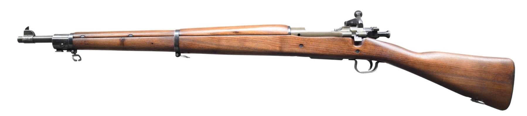 RIFLE. Cal. 30-06. S# 3941599. Bbl. 24". Marked behind front sight "RA / flaming bomb / 9-43". Aperture rear sight graduated to 800 yards. Blade front sight. All visible parts markings are "R". All stamped furniture including fine checkered trap buttplate & large bow trigger guard. Walnut stock set. Straight grip stock w/ two recoil bolts. CONDITION: stock set has professional looking refinish w/ little loss of wood except a notable rounding of the cutoff recess. Metal retains 75% of its thinning original wartime finish. Very good shiny two-groove bore. (25-3317/RW). CURIO. $700-1,000.