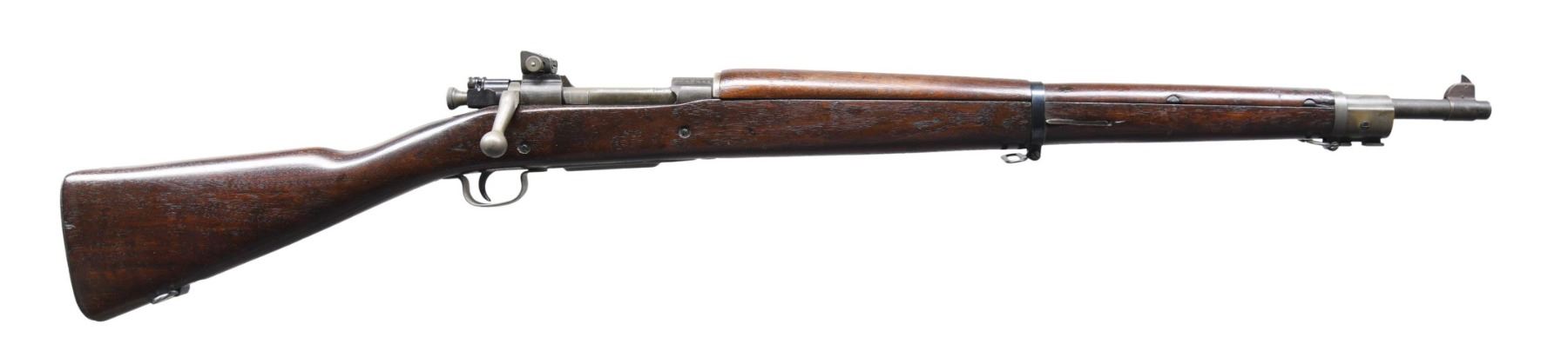 MILITARY RIFLE. Cal. 30-06. S# 3519115. Bbl. 24". Barrel is marked behind the front sight, "RA (flaming bomb)" and "5-43." Aperture rear sight graduated to 800 yards. Blade front sight. All visible parts' markings, including the bolt, are "R." All stamped furniture, including a fine checkered buttplate and small bow trigger guard. Straight-grip walnut stock with two recoil bolts. CONDITION: stock set has an arsenal rework finish with a good appearance. Metal retains a large degree of its original parkerized finish with light wear. Near-excellent 4-groove bore. (24-6549/RW). CURIO. $1,000-1,500.
