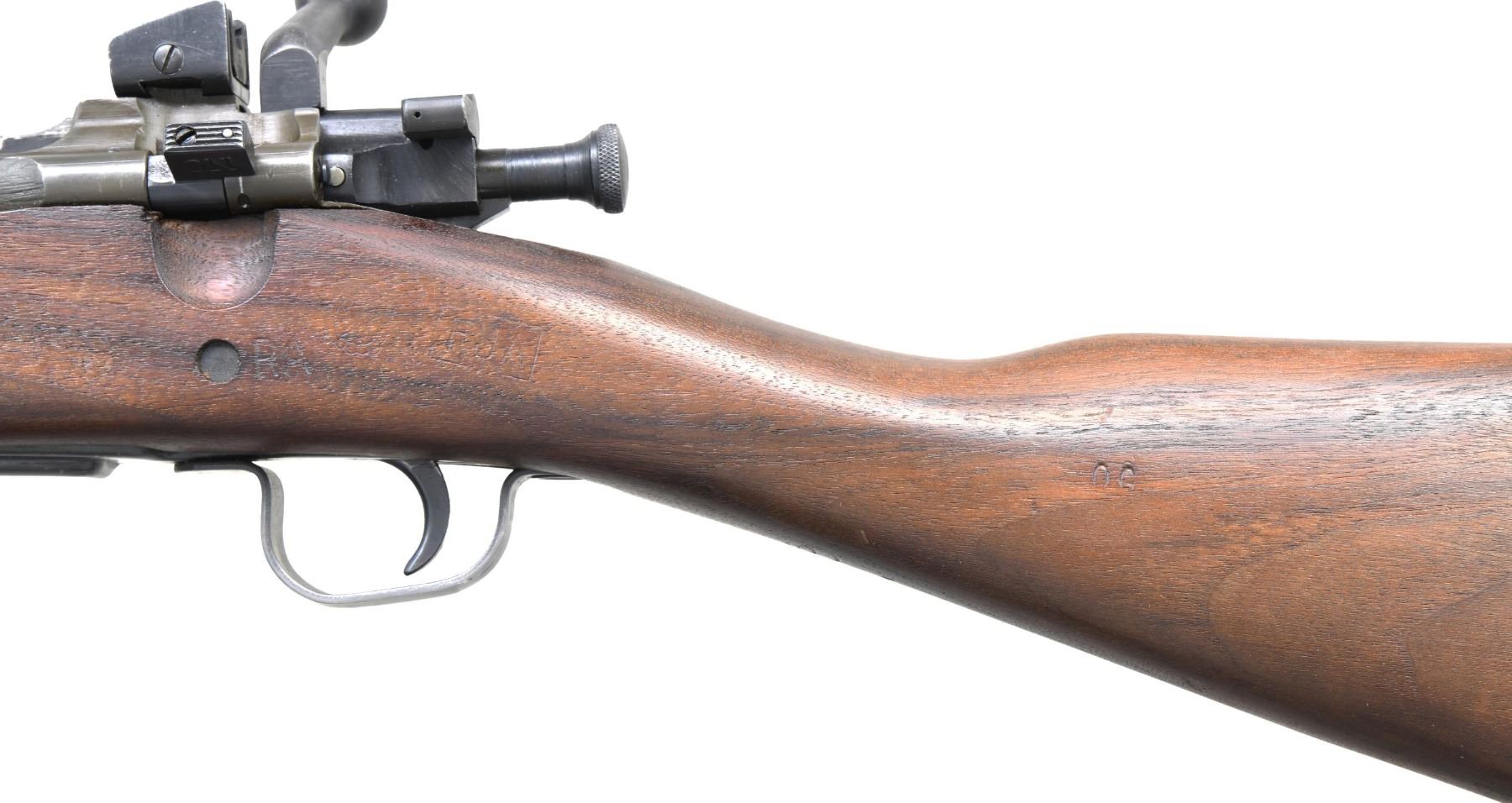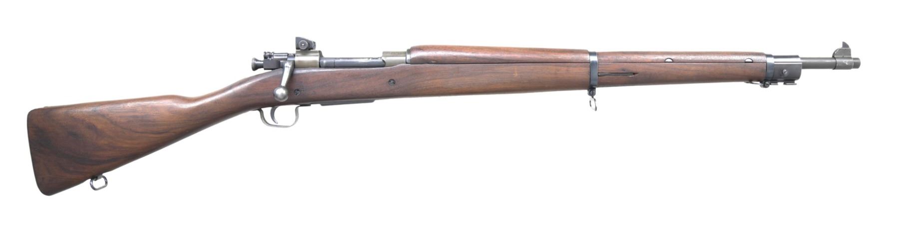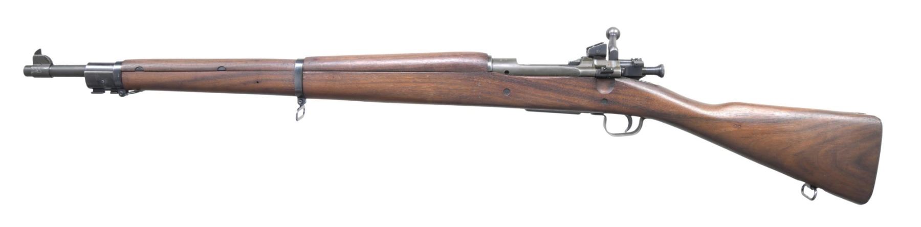 MILITARY RIFLE. Cal. 30-06. S# 4150174. Bbl. 24". Bbl. marked behind front sight "RA / flaming bomb / 9-43". Ladder rear sight graduated to 1,800 yards. Blade front sight. All visible parts markings are "R". All blued stamped furniture including fine checkered trapped buttplate & large bow trigger guard. Walnut stock set. Straight grip stock w/ two recoil bolts. Stock marked on left side w/ legible "RA / crossed cannons / boxed FJA inspector's mark. Cheek area has unboxed "OG" indicating a test & check at the Ogden Utah arsenal. Encircled "P" proof under grip & legible assembly numbers ahead of trigger guard. CONDITION: rifle has very good appearance. Stock set has very light wear & scattered handling marks. Metal retains 80% of its original finishes. Both blue & the greenish wartime Parkerization. Very good shiny 2 groove bore. (25-2570/RW). CURIO. $800-1,100.