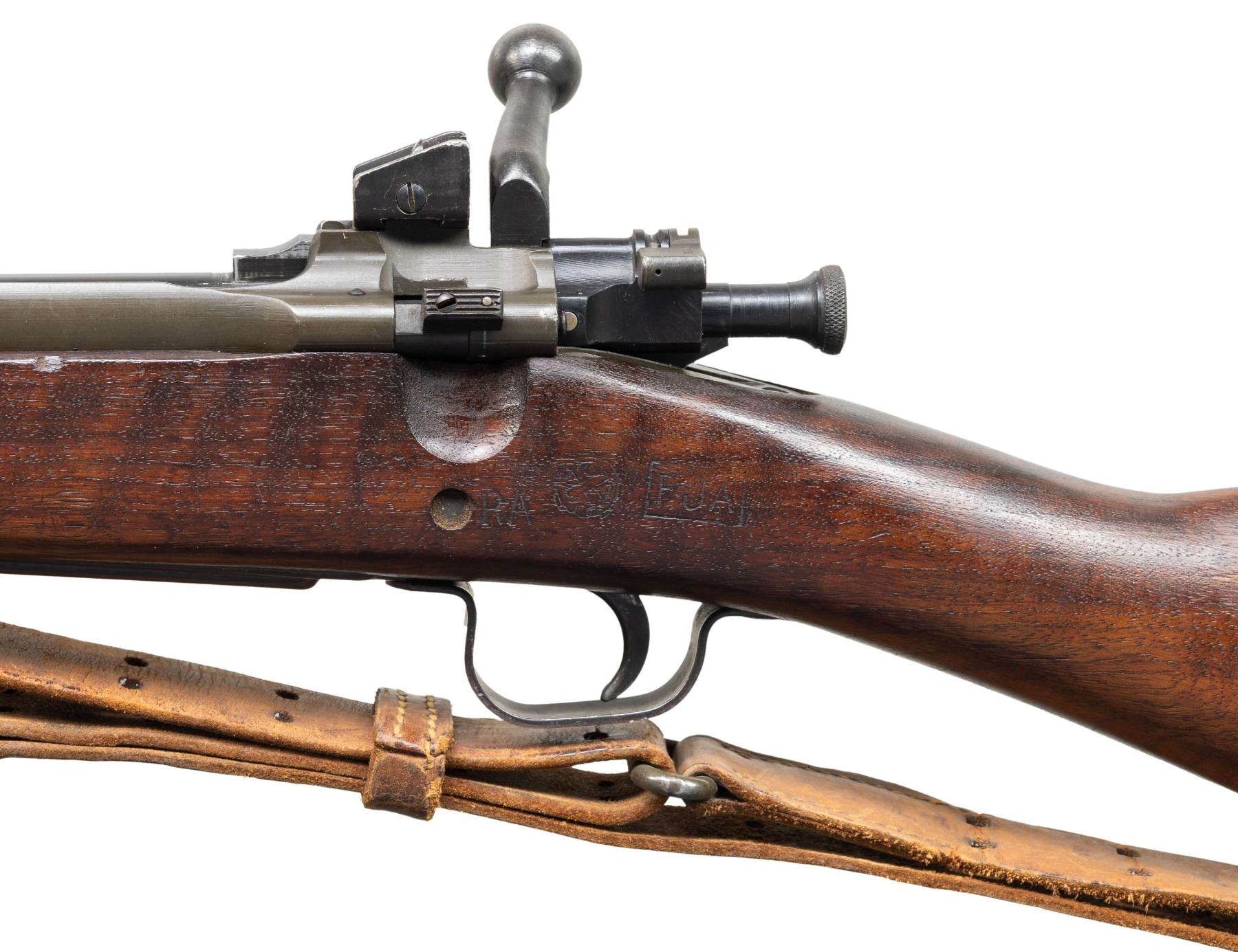RIFLE. Cal. 30-06. S# 4177986. Bbl. 24". Barrel is marked behind front sight "RA / flaming bomb / 9-43". Aperture rear sight graduated to 800 yards. Blade front sight. Remington marked bolt assembly. All stamped furniture including fine stamped buttplate and correct Remington large bow trigger guard. Straight grip walnut stock with two recoil bolts. Stock is marked on left side "RA / crossed cannons" and boxed "FJA". Encircled "P" proof under grip and prominent assembly numbers ahead of trigger guard tang. Walnut handguard has notably lighter hue. WWII vintage brown leather sling is well-worn with cracking and partly missing feed end tip. CONDITION: stock set has original finish with moderate wear and scattered handling marks throughout. Correct green parkerizing on receiver. Stamped parts are blued as is the bolt. Metal shows 80% of its original finishes. Very good shiny two-groove bore. (25-6877/RW). CURIO. $450-650.
