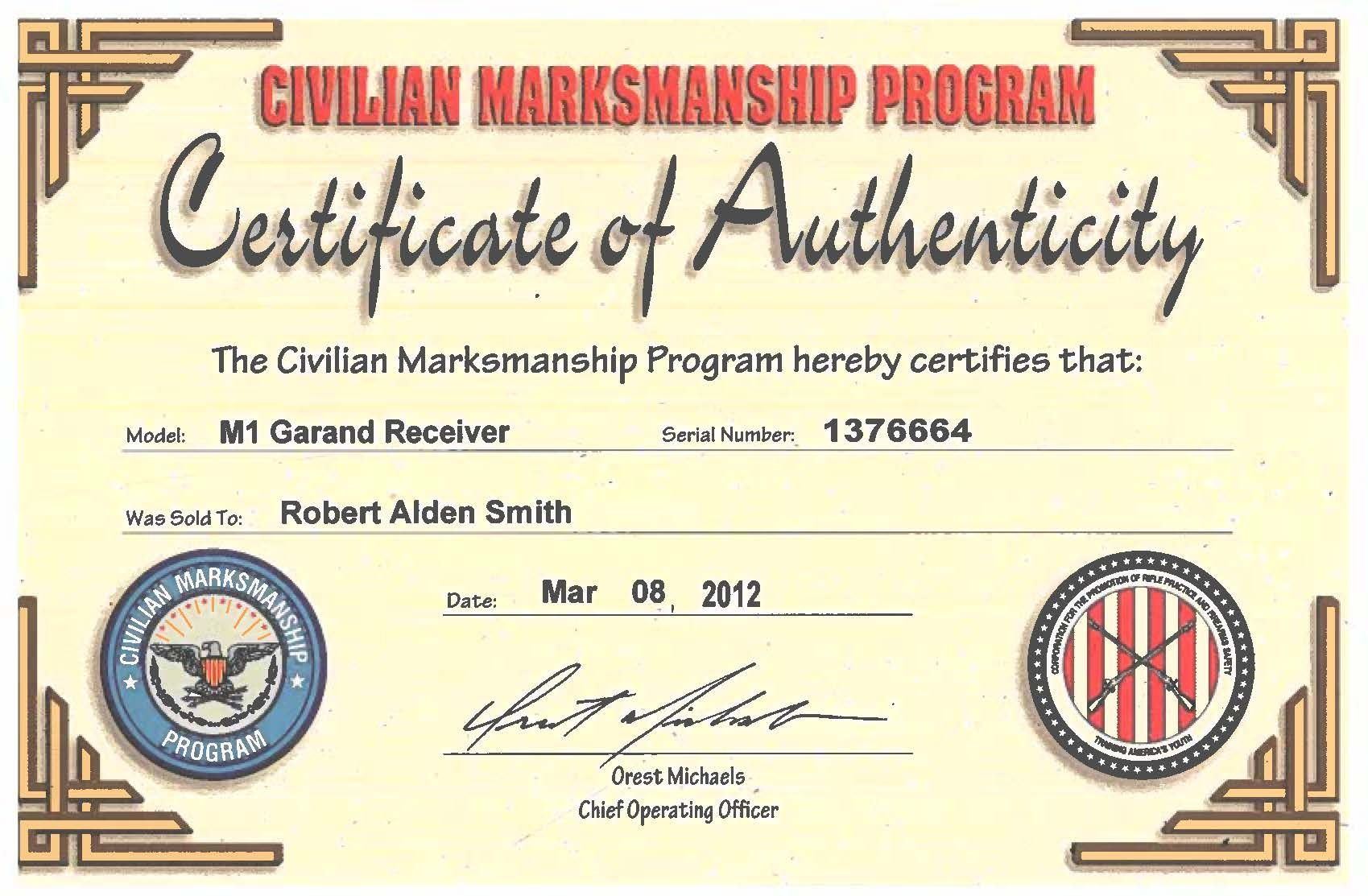 RIFLE ASSEMBLED ON CMP RECEIVER. Cal. 30-06. S# 1376664. Bbl.24". Barrel marked on right side "S-A-12-48. Throat gauges 6.0. Muzzle gauges 1.0. T-105E1 aperture rear sight. Blade front sight with protective ears. All major parts markings are "SA". Hi-hump gas cylinder lock. Stamped trigger guard. Non-matching walnut stock set. Buttstock is unmarked. UNATTACHED ACCESSORIES: CMP Certificate of Authenticity dated 2012. Model is stated as: M-1 Garand Receiver. CONDITION: stock set has moderate wear, staining and handling marks. Buttstock has doweled repair at grip. Metal has a mix of worn finishes with light scratches. Bore has lightly worn lands with small areas of frosting. (24-3829). CURIO $900-1400.