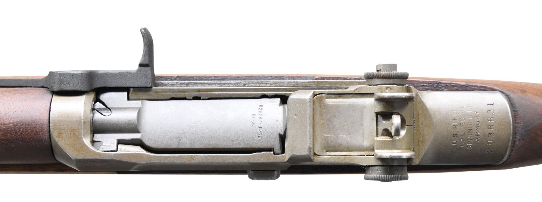 RIFLE WITH CORRECT FEATURES. Cal. 30-06. S# 2938831. Bbl. 24". Barrel is marked on right side "1-S-A-6-44". Throat gauges: 2.0. Muzzle gauges: less than 1.0. All major parts markings are "SA". Operating rod does not have the relief notch, but has the original square corner. Locking bar rear sight assembly. Blade front sight w/ protective ears. Milled trigger guard. Walnut stock set w/ arsenal rework finish. Stock markings remain visible & include boxed "S.A." / GAW". "Crossed cannons" & encircled "P" proof under grip. Early model 1907 style sling w/ brass hooks. CONDITION: stock set w/ its arsenal rework refinish has light wear & scattered handling marks. Receiver & bbl. have their original war-time parkerized finishes w/ thinning & light wear. Operating rod & gas cyl. appear to have been reparkerized. Bore has worn lands w/ frosted grooves. (25-967/RW). CURIO. $800-1,200.