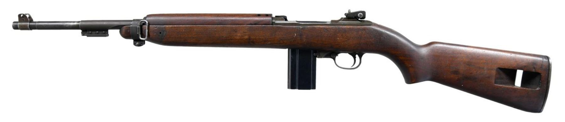 Cal. 30 Carb. S# 1156271. Bbl. 18" marked approx. 2" behind front sight w/ "W". Stamped adj. rear sight marked "IRCO". Blade front sight w/ protective ears. Bbl. is marked on right side over gas piston w/ flaming bomb. Bbl. band w/ bayonet lug marked w/ "KI". Straight cut slide marked inside w/ encircled "S". Rnd. bolt marked "IO". Machine trigger housing marked "Q-NL". Rotary safety. Mag. catch has 30 rd. extension. Straight cut hammer marked ".U.". Low wood oval cut walnut stock marked "LW" in sling slot. Marked at end of pistol grip w/ ".U." and faint "RA-P" overhaul mark for Raritan Arsenal. Marked under grip w/ partial "P" proof. 4 Rivet handguard marked "LW". MAGS: 1 - 15 rd. marked "BW". CONDITION: stock set has moderate wear & staining w/ scattered handling marks throughout over arsenal rework finish. Metal has thinning original parkerized finish w/ wear & scattered scratches. Very good shiny bore. (23-2290/RW). CURIO. $700-1,100.