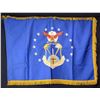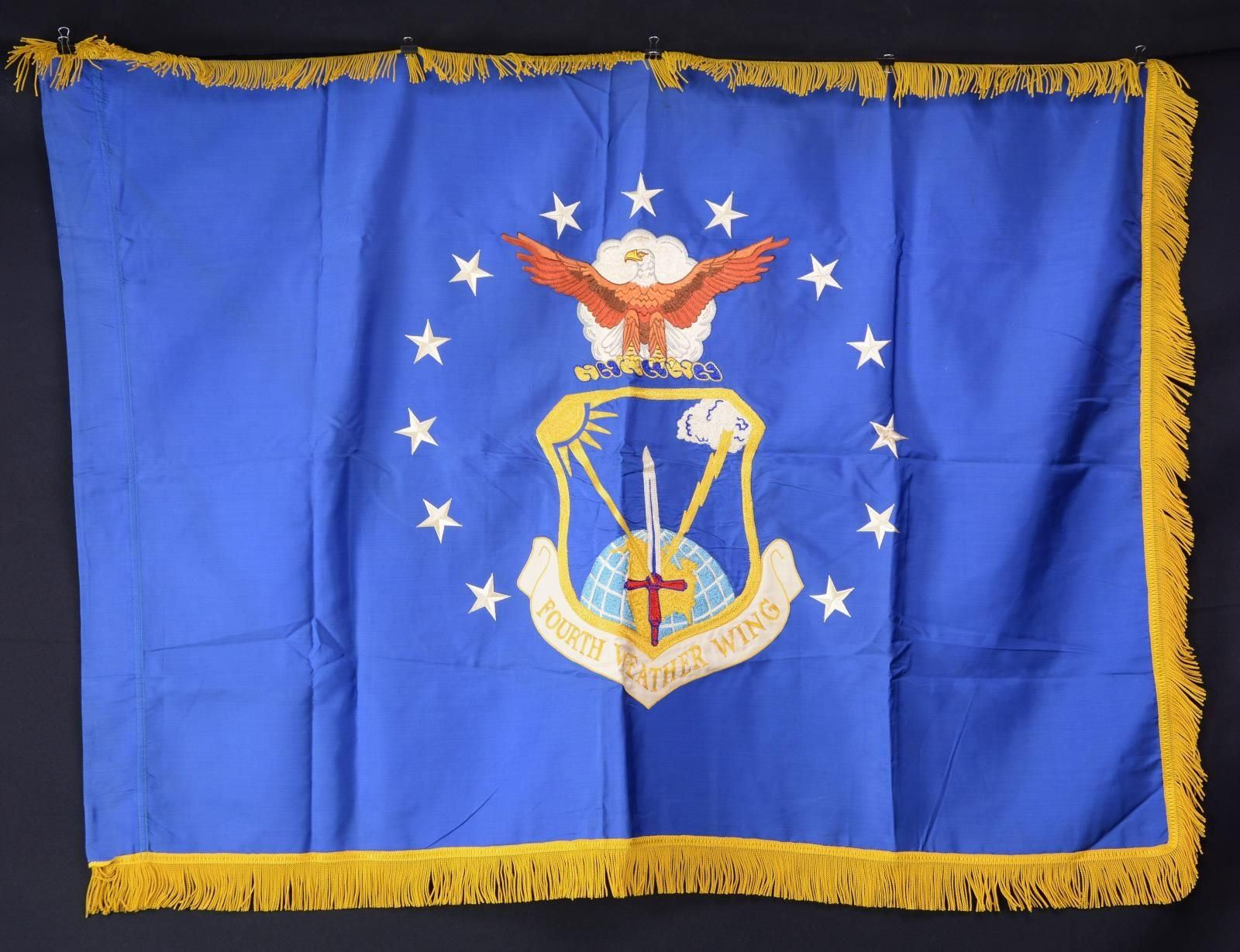 3' x 4' regulation double applique embroidered Air Force insignia above the central device which holds the unit crest of the 4510th. Contractor label dated February 24, 1966. The 4th Weather Wing started its service in 1959 remaining deactivated in 1972. The weather and flying aircraft, even modern planes, is intrinsically tied together. Accordingly, as far back as World War One, the U.S. Army Signal Corps had a Meteorological Service to help with weather forecasting for its planes. By 1937, the command also used the U.S. Weather Bureau to supplement forecasting. In 1942, the U.S. Army Air Forces Weather Service was created and then moved out of the Washington DC area to different areas and its control passed to the Flight Control Command. This new formation organized the Weather Wing, Flight Control Command which is the lineal ancestor for all US Air Force weather organizations. By 1943, the headquarters was established in Asheville, North Carolina. It only had the authority to handle weather operations in the United States and not in the European or Pacific Theaters of World War Two. Before the end of the war, this command was merged with the USAAF Weather Service to become the AAF Weather Service and they moved to Langley Filed in Virginia in 1946. A couple months later, its name was changed to the Air Weather Service and placed under the control of the Air Transport Command. In 1947, the U.S. Air Force was formed as a separate military arm and the role of the weather service expanded to a global mission. In 1948, the Air Weather Service was moved to Andrews AFB in Maryland and came under the control of the Military Air Transport Service, later named the Military Airlift Command. With this change, the Air Weather Service was moved to Scott AFB in Illinois. The Air Weather Service was often the cutting edge of weather forecasting and related technology including computers, satellites and networking with civilian weather agencies all of which contributed to modern weather forecasting that we have today. Their role expanded into space with solar science becoming part of their mission. The Air Weather Service issued the first tornado warning in American history in 1948. The service is fully integrated within all weather-related agencies today and its capabilities are global. Now known as the Air Force Weather Agency (as of 1997), in 1993 it was designated as a filed operating agency and made part of the U.S. Air Force headquarters. The service was then moved to Offutt AFB in Nebraska. In March 2015, the service was redesignated as the 557th Weather Wing and was part of the U.S. Air Force Combat Command of the 12th Air Force. Under its auspices during its various incarnations are a number of subordinate weather wings, some still in existence with others now deactivated. One of these was the 4th Weather Wing which seems to have started its service in August 1959 remaining active until June 1972. It was reactivated in October 1983 and remained in service until September 1991. This flag has a date of February 24, 1966 which places it within the first terms of service of the wing. It is blue with the Air Force logo above the central device which is the crest of the command. The thirteen white stars represent the original thirteen colonies and states. Condition: very good. (02-19982-36/JS). $200-400.