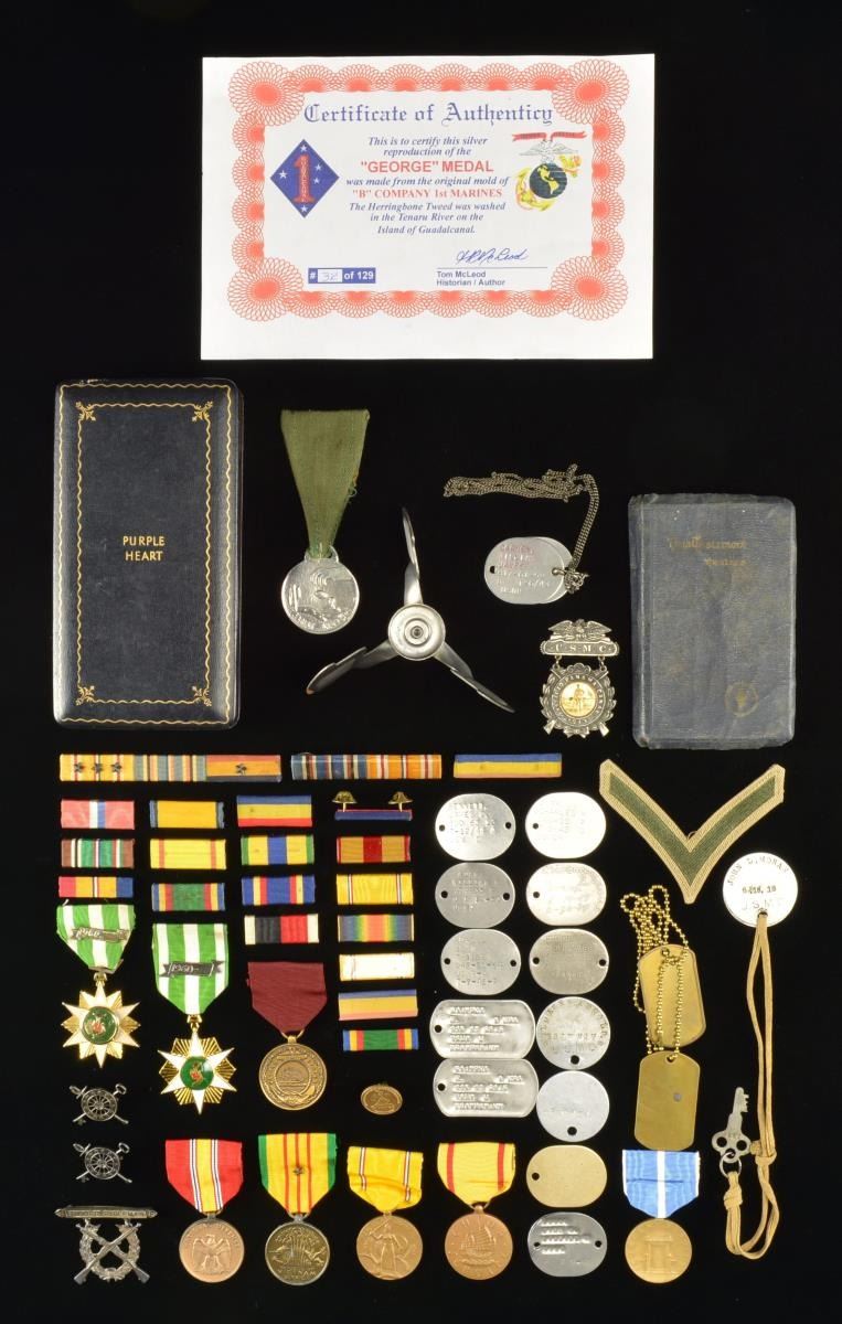 SERVICE MEDALS & MUCH MORE. This varied group includes 1 pair of dog tags for William James Carney dated 1943 for the USNR. / 1 Box for a Purple Heart (no medal). / A 1941 New Testament. / A 1913 commemorative medal that reads, “USMC VISIT TO PANAMA CANAL 1913”. / 1 Certified silver reproduction of the George medal made from the original mold of B Company of the 1st Marines w/ herringbone tweed ribbon washed in the Tenaru River of Guadalcanal. / 1 Box containing 4 WWI dog tags, 8 WWII dog tags, 2 post-WWII dog tags, 1 US Korean Service medal, 1 Navy Good Conduct medal, 1 US Vietnam Service medal, 2 Republic of Vietnam Service medals, 1 China Service medal in original box, 1 American Defense medal in original box, 1 folding mini-stove, 19 ribbon bars, 1 PFC stripe, A 50th Anniversary of WWII lapel pin, 2 Marine Corps Quartermaster Corps officer’s collar insignia, 1 Marine Expert Rifleman badge. CONDITION: all items generally show light wear. Some of the ribbon bars show moderate wear w/ a few stains. (02-15897/BF). $500-800.
