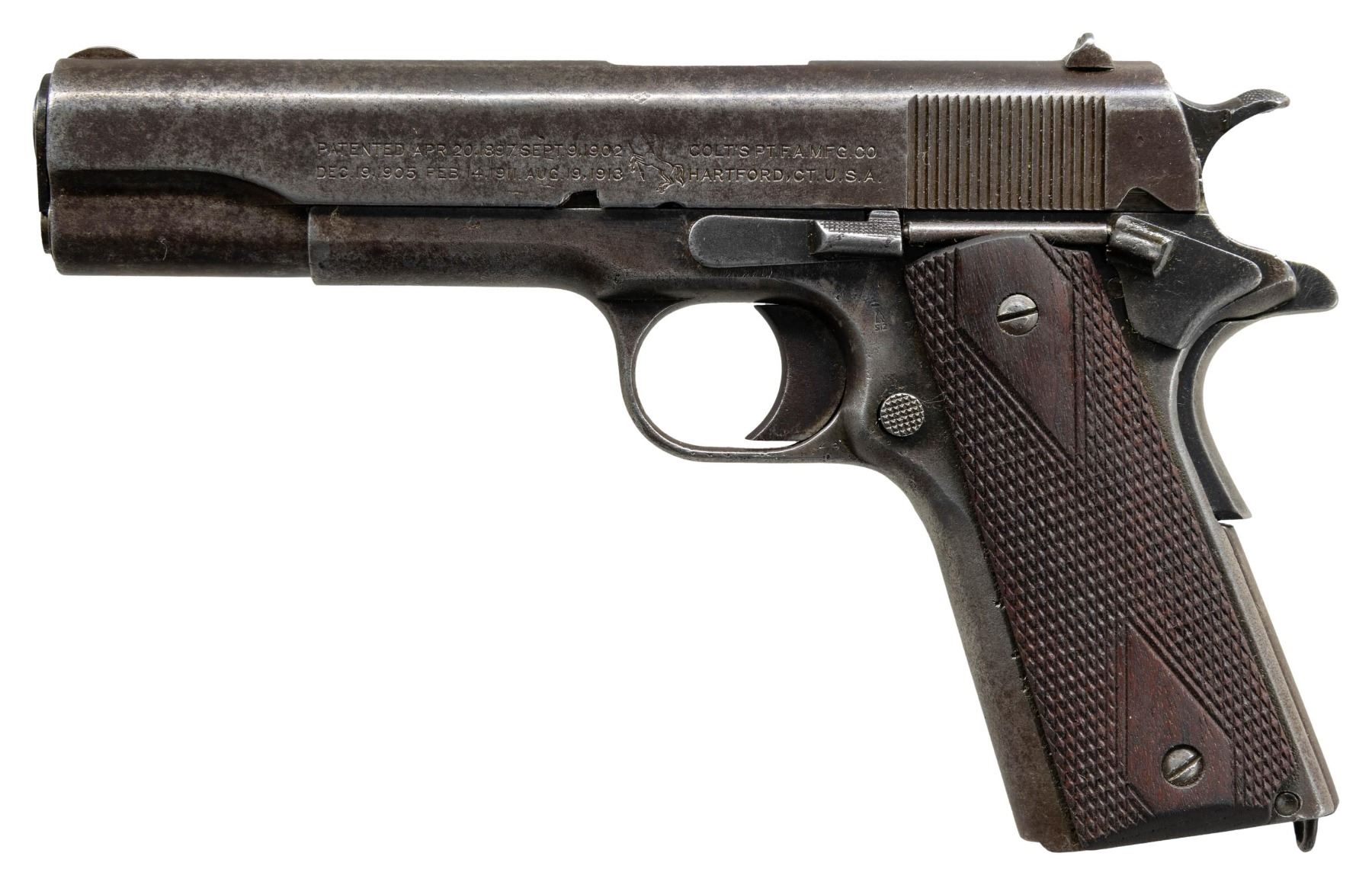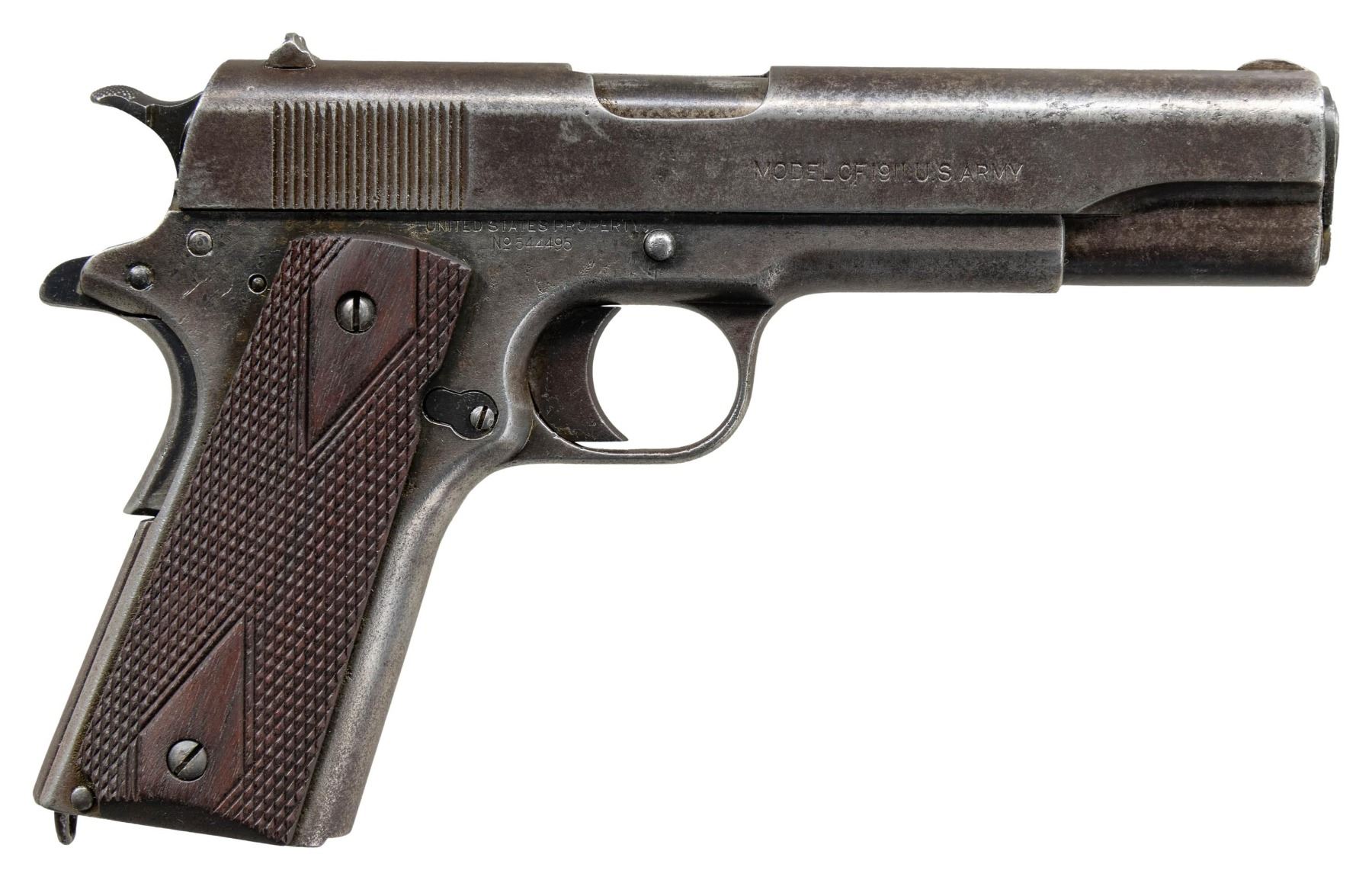 PISTOL. Cal. 45 ACP. S# 544495. Mfg. 1918. This pistol is within the S# range 543000-556000, which is linked to a 3,000 pistol shipment to the USMC Storehouse in Philadelphia, PA Dec. 14, 1918. Based on J.C. Harrison's "U.S. PISTOLS & REVOLVERS 1909-1945", this pistol appears to have most original parts for replacement checkered walnut grips. While this pistol has a 5" Colt Type 4 barrel instead of Colt Type 5, could have been mixed due to using up parts after the Armistice was signed. Left side of frame has "GDE" import mark. MAGS: NONE. CONDITION: balance of metal is gray/brown patina with corrosion & light pitting throughout. Very good replacement grip finish. Pitted & heavily worn rifling is barely distinguishable. (25-4361/MD). CURIO. $1,500-2,250.