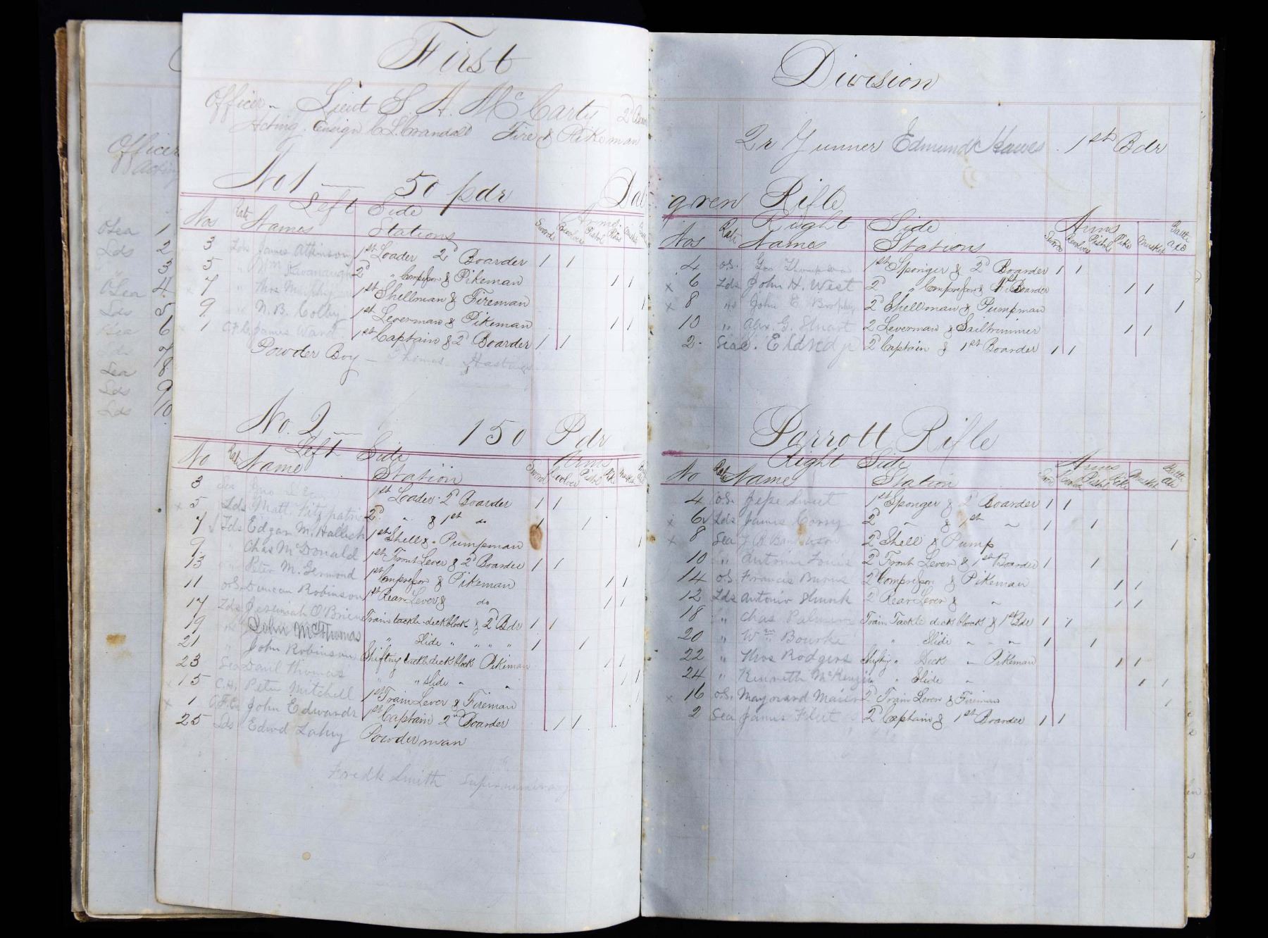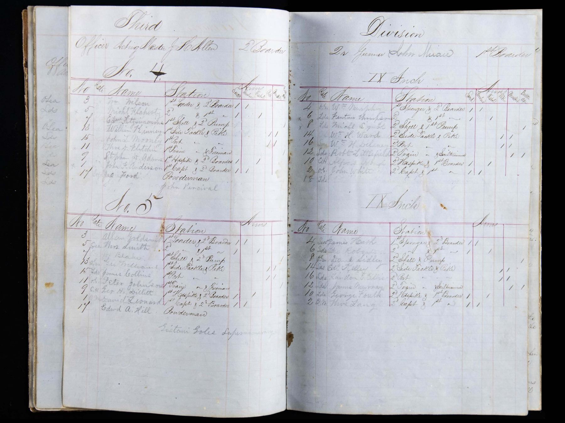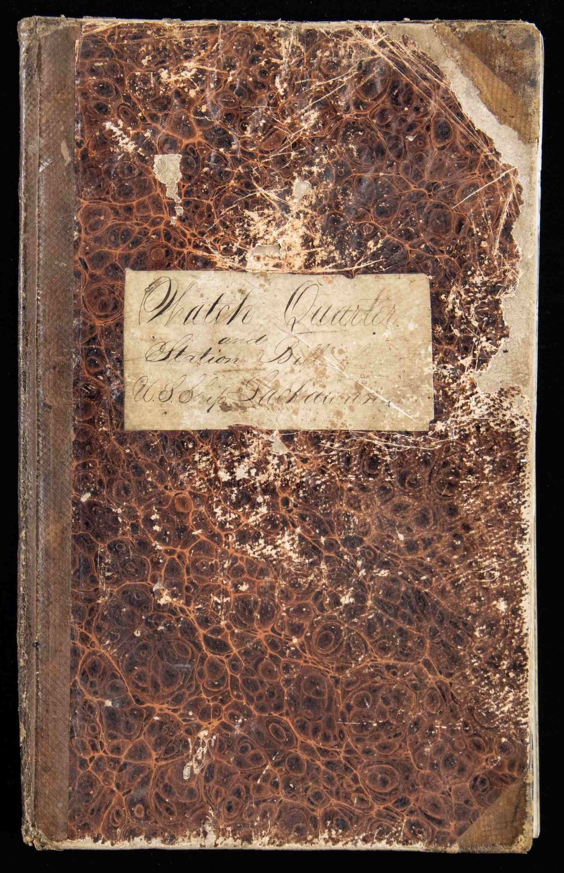 LEDGER. This ledger details every crew member's specific duties for routine and battle conditions. Cannon crews are listed by gun, types of weapons to be issued to each man for battle, etc. 13.5" x 8.5" ledger with about 50 pages filled out scattered throughout. Many names and sailor's signatures throughout, 12 sailors were awarded Congressional Medal of Honor for heroic action August 5, 1864 at battle of Mobile Bay. UNATTACHED ACCESSORIES: binder of research and bios of sailors awarded MoH. CONDITION: very good overall, easily read, scuffed covers, some staining and water stains, last page loose. (02-26292/JS). NON-GUN. $500-1,000.