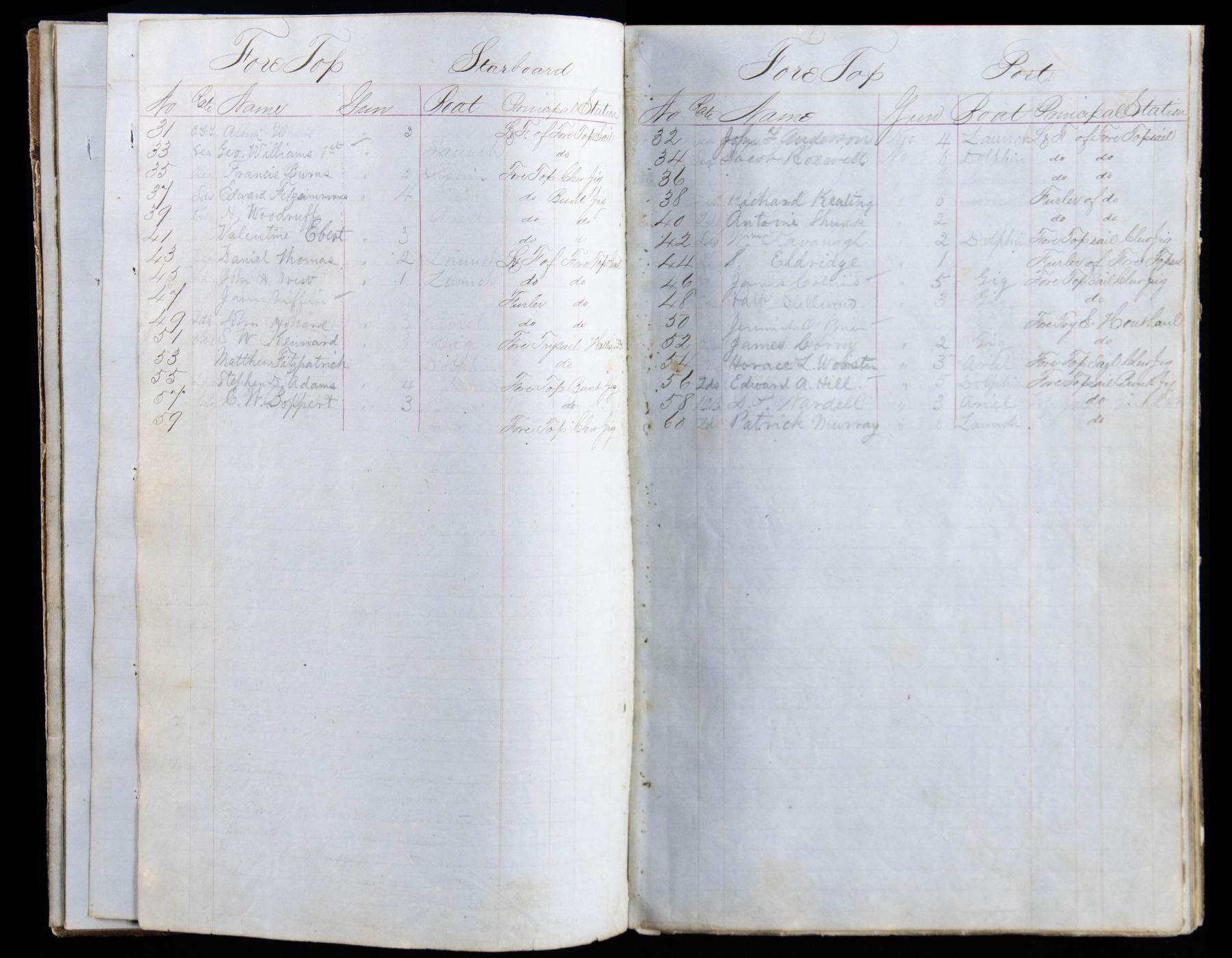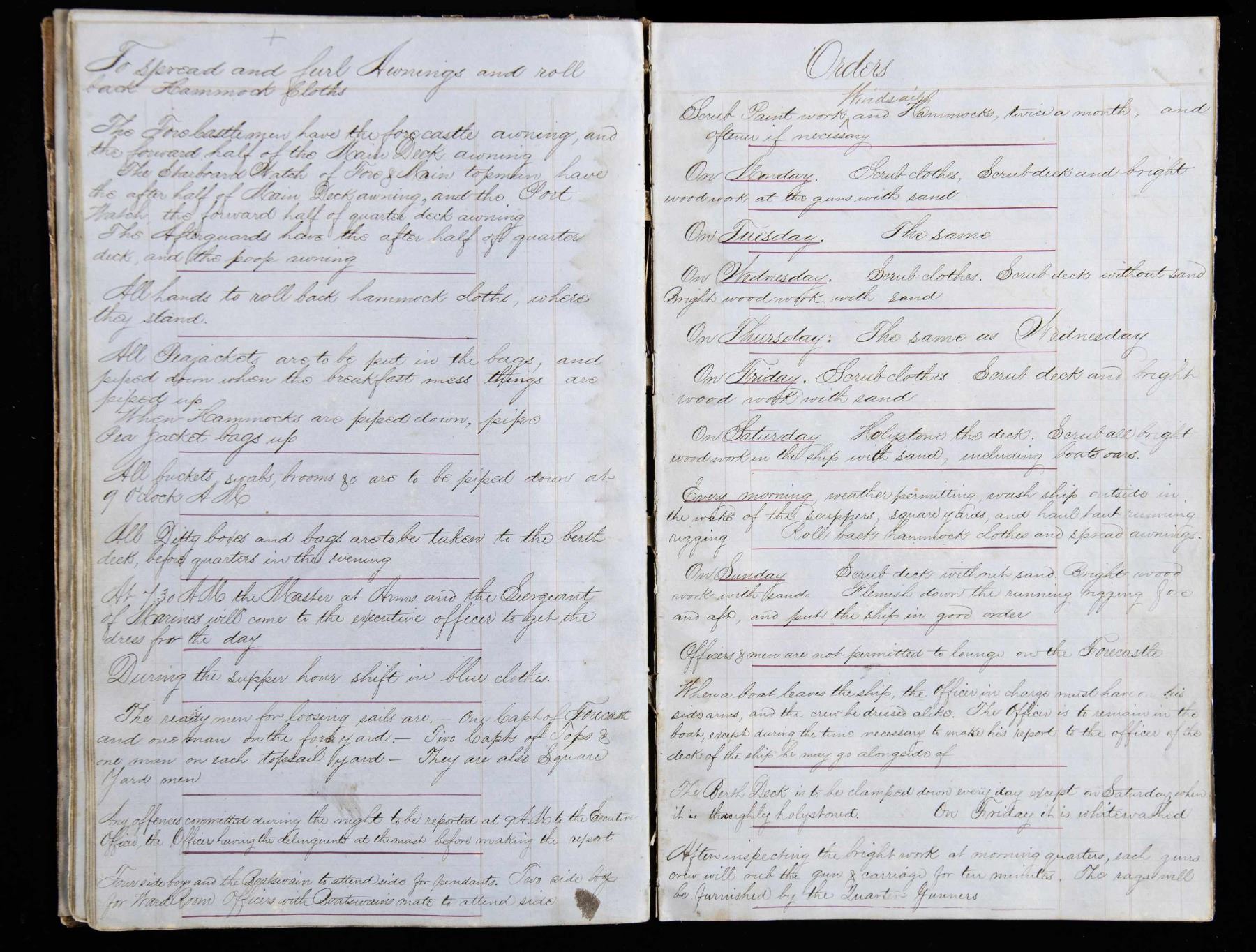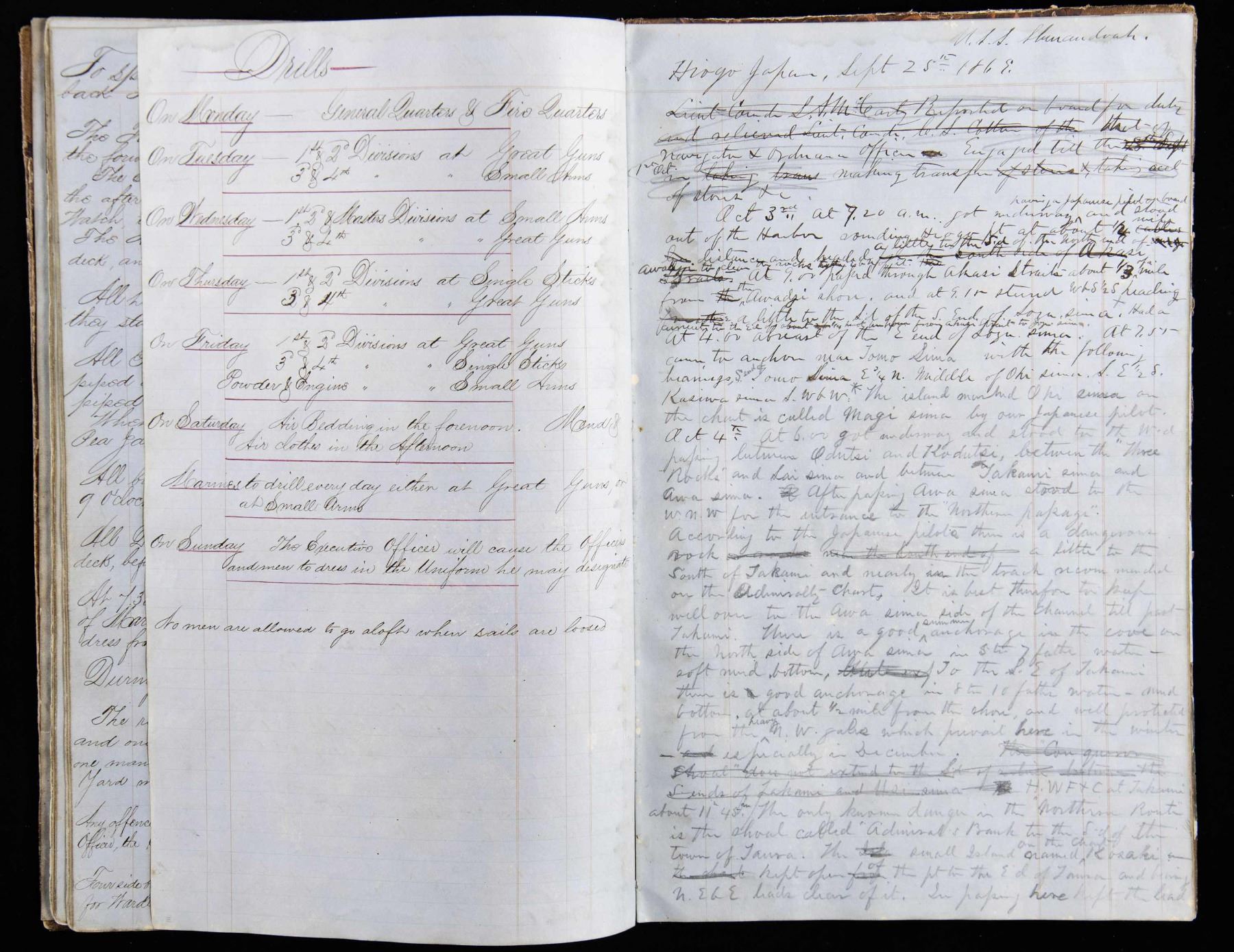 LEDGER. This ledger details every crew member's specific duties for routine and battle conditions. Cannon crews are listed by gun, types of weapons to be issued to each man for battle, etc. 13.5" x 8.5" ledger with about 50 pages filled out scattered throughout. Many names and sailor's signatures throughout, 12 sailors were awarded Congressional Medal of Honor for heroic action August 5, 1864 at battle of Mobile Bay. UNATTACHED ACCESSORIES: binder of research and bios of sailors awarded MoH. CONDITION: very good overall, easily read, scuffed covers, some staining and water stains, last page loose. (02-26292/JS). NON-GUN. $500-1,000.