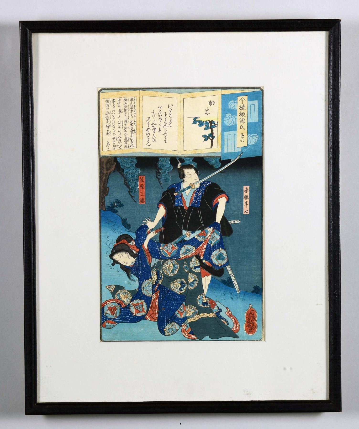 TOGETHER WITH A SIMILAR PRINT. "Kashiwagi" from chapter 36 from Modern Parodies of Ghenhj" 1863-64. Housed in wood frames, matted under glass. SIZE: overall 19 1/2" x 15" and 21" x 17", sight each 13" x 9". CONDITION: very good. PROVENANCE: Private Maine Collection. (05-1065/TG). $500-700.