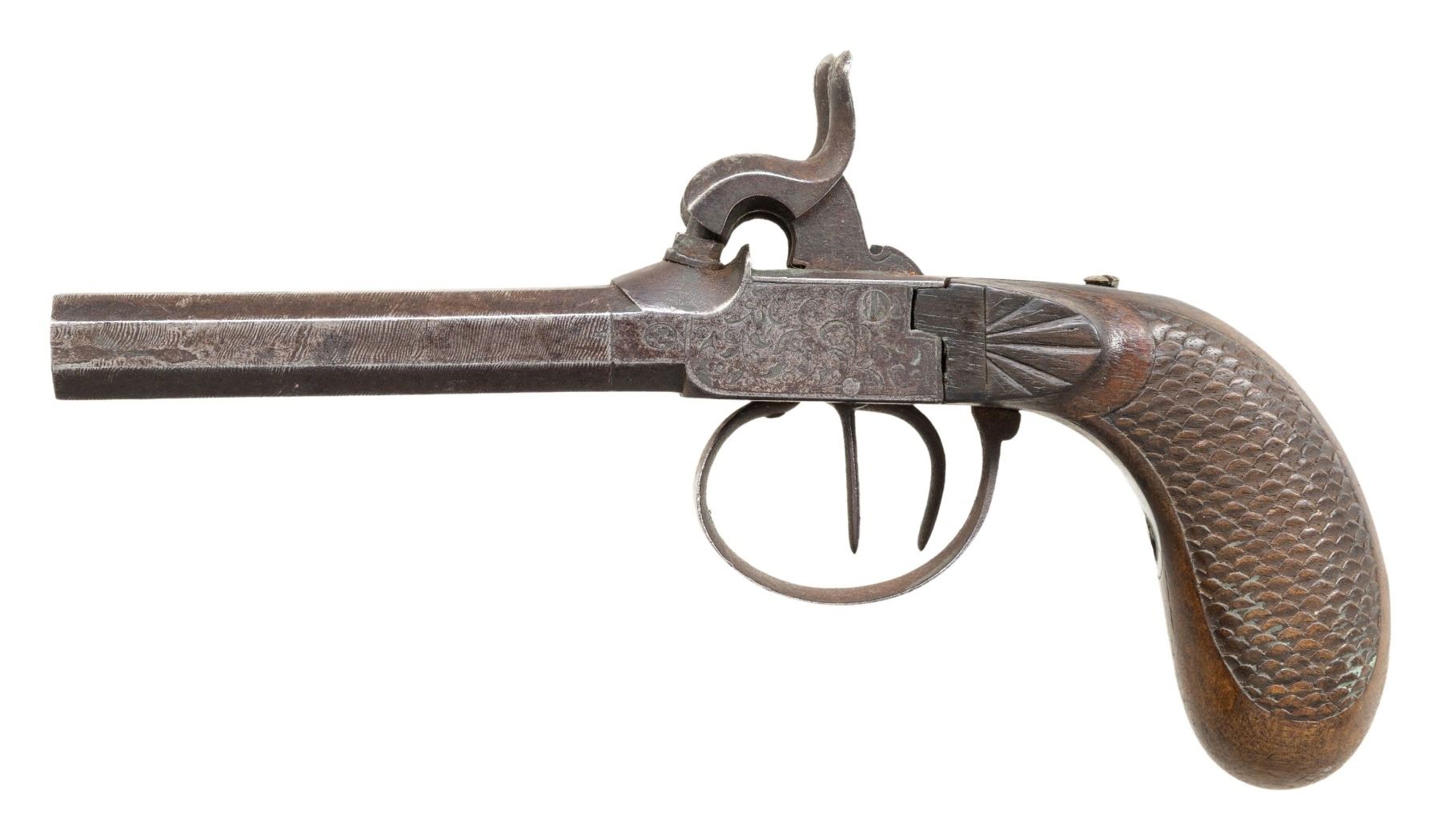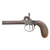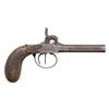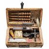 Cal. 41, 3" bbl., NSN. This very interesting lot is contained in a small early brass tack decorated hide covered trunk with a cross on the top. The trunk contains 4 wooden stakes in a leather 4 pocket sheath. There is also a large black crucifix on a black beaded chain, a small bible with elaborately decorated covers, a large folding knife withdecorated bone handles, a silver cross with beaded chain and metal holy water bottle. and a large bottle nearly full of silver nitrate sealed with wax and engraved on the side "SILVER NITRATE". The trunk further contains a double barrel inline percussion pistol of .41 caliber with 3" barrels. The side plate, barrel tang, and trigger guard all have similar engraved motifs. The wooden butt is carved with a fish scale motif. Accompanying the pistol is a small powder horn with a cross carved into the side and a small pewter lidded box containing 6 round balls and caps. CONDITION: all items show expected wear with no notable damage. The pistol has an overall dark worn blued patina with light wear to the grip. Both hammers hold both full and half-cock. The trunk itself shows moderate wear but remains very solid. (01-27457/BF). ANTIQUE. $1,800-3,000.