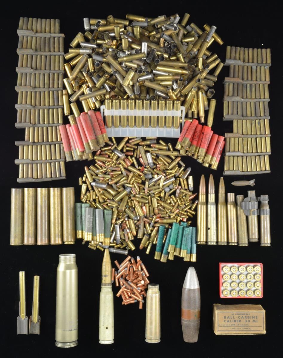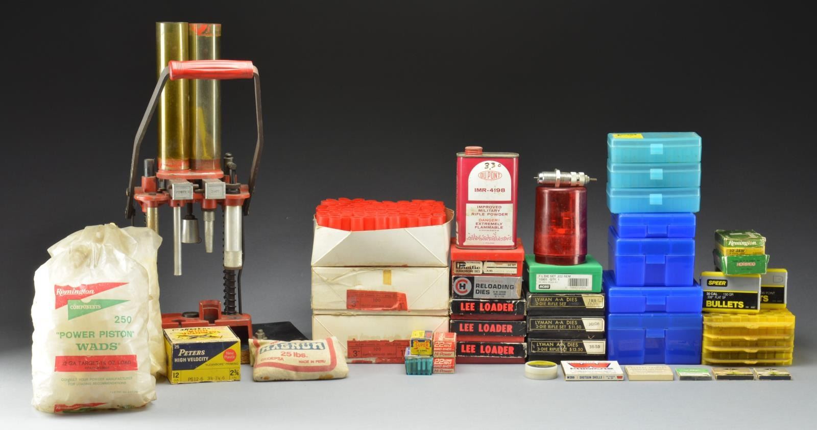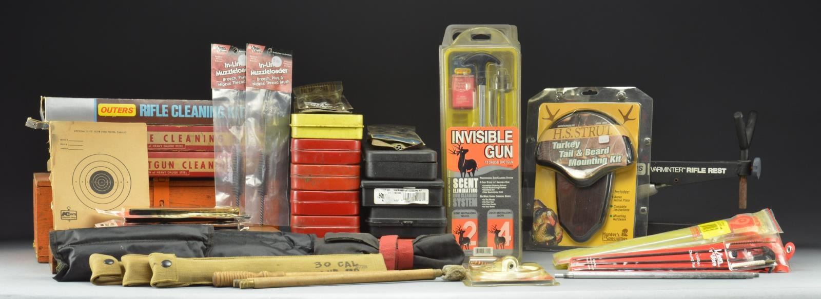 CLEANING ACCESSORIES. Lot includes: Outers Varminter rifle rest. / Unmarked 12 Ga. bench mounted shot shell loading press. Does not appear complete. / 12 Ga. 200+ empty new plastic shot shells marked "Alcan". / 15 Plus gun cleaning kits predominantly by Outers. Kits may not contain all items. Large quantity of loose rods, patches & brushes. / Wooden shooter's box measures 8 X 16", 6" deep. / 3 Nylon military style rifle cleaning kits w/ partial contents. / Hand loading die sets include Lee 270 Win. / RCBS 222 REM. / Pacific 222 REM. / CH 30 M1 Carbine. / Lyman 30-06. / Lyman 38-55. / Lyman 7X57. / Lee Loader 45 ACP. / Lee Loader 45? / Lee Loader 444 Marlin. / Large quantity of loose rifle, pistol & shotgun ammunition, rimfire & centerfire. / Large quantity of assorted empty fired brass. / Inert sm. artillery brass & projectiles range from .50 MG-30mm. / 1 Pound sealed can IMR-4198. / Sm. quantity of assorted rimfire & pistol ammunition including 40 rds. 9X18 MAK 7 assorted plastic ammunition boxes. CONDITION: ranges from fair to good w/ wear, staining, loose packaging & torn boxes. (02-15355/RW). $200-400.