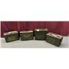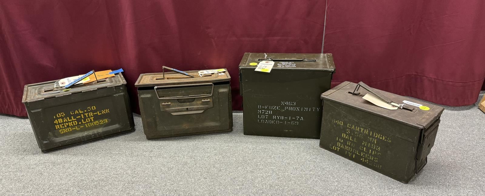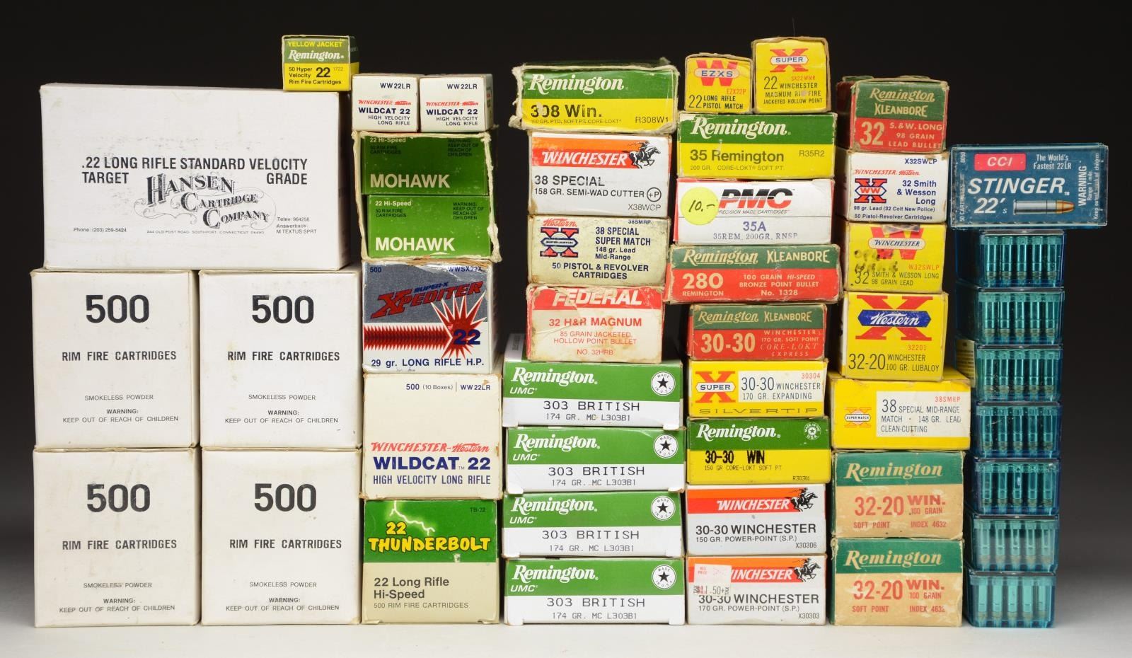 LOT COTNAINS HOLLOW POINT AMMUNITION. 35 REM: 1 BOX (16 rds.) Rem. 200 GR. SP. 1 BOX (20 rds.) PMC 200 gr. RNSP. 280 REM: 1 BOX (20 rds.) Rem. 100 gr. Bronze Point. 30-30: 1 BOX (17 rds.) Western 170 gr. silvertip. 1 BOX (20 rds.) Rem. 150 gr. SP. 1 BOX (18 rds.) Rem. 170 gr. SP. 1 BOX (20 rds.) Win. 150 gr. SP. 1 BOX (20 rds.) Win. 170 gr. SP. 308 WIN. 1 BOX (7 rds.) Rem. 150 gr. PSP. 303 BRITISH: 4 BOX (80 rds.) Rem. 174 gr. MC. 32 S&W LONG: 1 BOX (30+ rds.) Rem. 98 gr. lead. 1 BOX (40+ rds.) WIn. 98 gr. lead. 38 SPECIAL: 1 BOX (50 rds.) Western 148 gr. lead mid-range. 1 BOX (45+ rds.) Win. +P 158 gr. semi wadcutter. 1 BOX (50 rds.) Western 148 gr. lead mid-range. 32-20: 1 BOX (50 rds.) Western 100 gr. Lubaloy. 2 BOXES (100 rds.) Rem. 100 gr. SP; boxes have black plastic containers for rds. 32 H&R MAG: 1 BOX (50 rds.) Federal 85 gr. HP. 22 LR: 5 BRICKS (2500 rds.) Hansen Target. 1 BRICK & 2 BOXES (600 rds.) Win. Wildcat High Velocity. 1 BRICK (500 rds.) Rem. Thunderbolt. 8 BOXES (400 rds.) Rem. Mohawk in brick. 1 BRICK (500 rds.) Win. Xpediter. 8 BOXES (400 rds.) CCI Stinger. 1 BOX (50 rds.) Win. Pistol Match. 1 BOXES (50 rds.) Rem. Yellow Jacket. 22 MAG: 1 BOX (50 rds.) Western HP. Lot also includes 4 ammo cans. CONDITION: boxes in fair condition overall; ammo shows patina in balance of cartridges, but appears serviceable. (02-22408-2/MD). $300-500.
