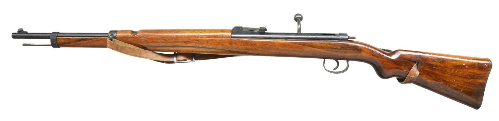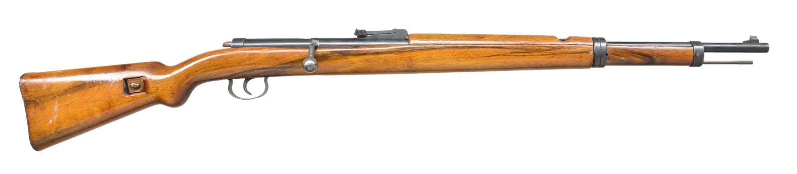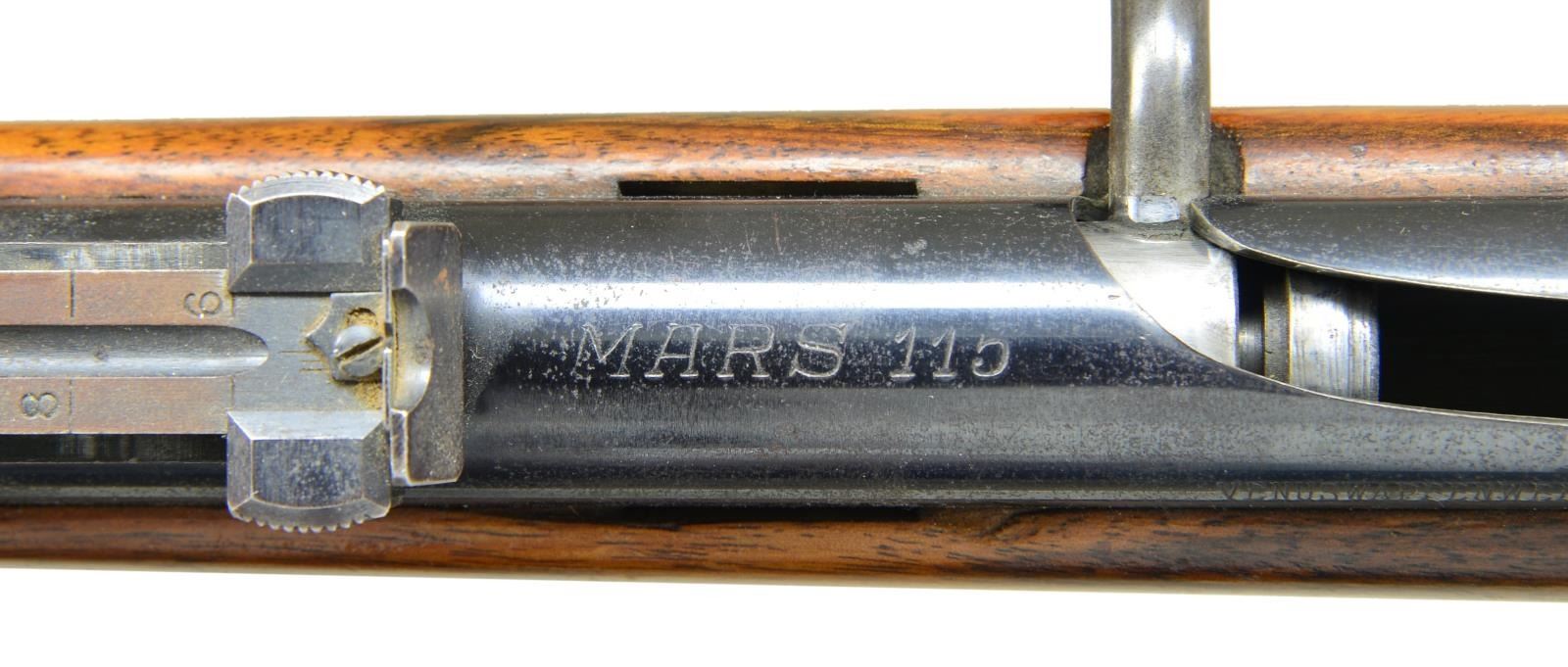 Cal. 4.5mm BB. S# L 325633. This rifle was intended as a training rifle w/ the same profile as the German K98k rifle. Bbl. 13 1/4" w/ a muzzle diameter of 8mm. Ramp mounted blade front sight & 1200m tangent rear sight. Receiver marked "MARS 115" on top & "VENUSWAFFENWEK ZELLA-MEHLIS (GERMANY)" on left side. Bolt pulled back to trigger latch, then cock on closing bolt. Mauser style safety on back of receiver. Walnut handguard & rnd. knob pistol grip stock w/ metal buttplate. 3/4" Sling on side sling slots. Cleaning rod is present. CONDITION: good blue w/ peppery oxidation throughout & area of varnish forward of handguard. Sanded & refinished wood has moderate handling marks throughout along w/ white paint. Good bore. (02-16046/MD). $250-400.