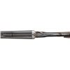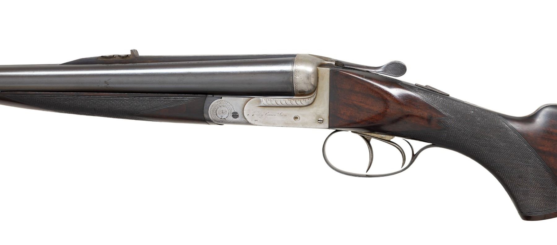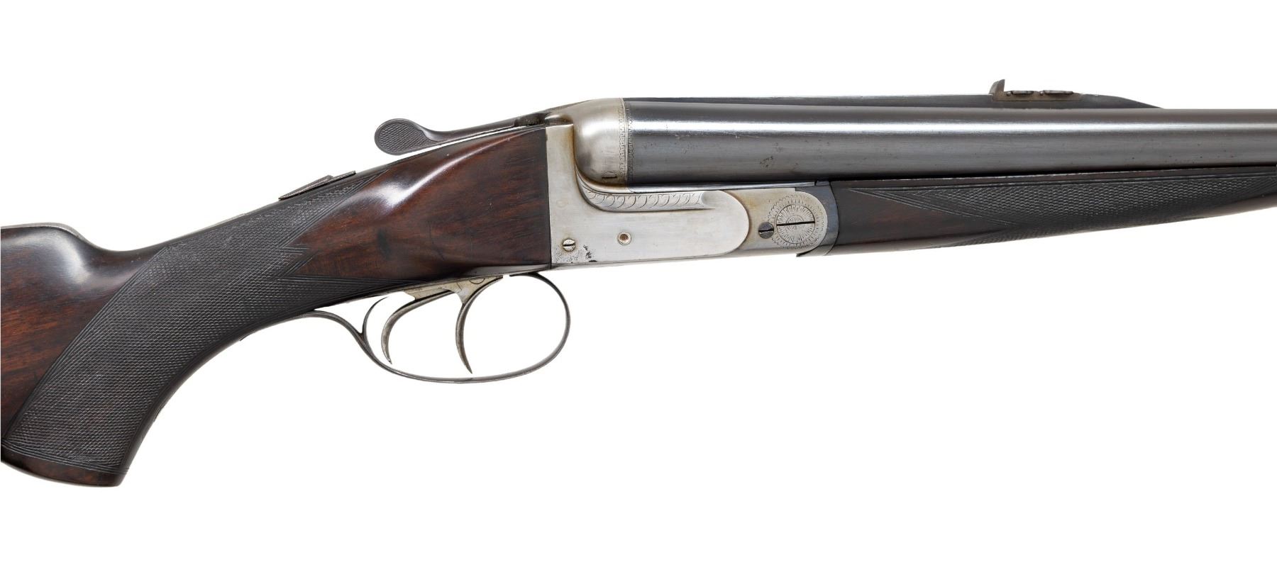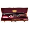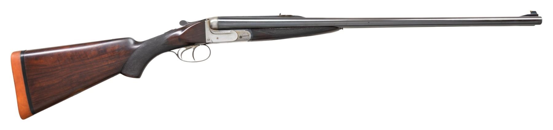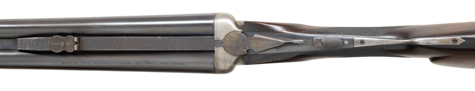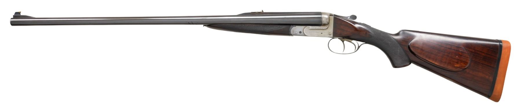 CASE. Cal. .475 No. 2 Nitro Express. S# 4404 (1929). The 25-5/8" chopper lump barrels are fitted with matted quarter rib holding one standing two folding leaf express rear sight and matching front ramp holding gold bead. Tops of barrels are engraved "Verney Carron -Liege-" on right and ".475 No 2 Nitro Express Cordite 85 Grains, 480 Grains" on left. Barrel flats are stamped with 1929 Belgian nitro proofs for rifle and with steel type; caliber designation is on bottoms of barrels. Coin finished boxlock action features non-automatic safety on top strap which has extension over top of comb; pivoting third fastener, bushed strikers, reinforced action frame and double triggers (front articulated). Action is engraved with some feather borders around screws. Maker's name and address are on left side and "VC" logo is on top lever pivot. S# is on trigger guard tang. Nicely fiddle figured European walnut pistol grip buttstock measures 14-1/2" over Silver type pad. Stock features small right hand cheekpiece, point pattern checkering on semi-diamond hand and silver oval on toeline with a family crest. Matching splinter forend has Anson release. UNATTACHED ACCESSORIES: rifle is housed in vintage leather case embossed "A.C." "2" on top which is lined in burgundy cloth. 2 leather labels are in lid; 1 for Gastine Renette the other, much newer, for Verny Carron. Case contains: three piece wood and brass cleaning rod, tin of vaseline, another tin of ? and Vintage Doubles tag. CONDITION: good as refurbished. Barrels retaining nearly all of a good quality re-black. Action shows heavy cleaning to silver gray; engraving is considerably softened. Stocks retain most of an old oil refinish with some subsequent marks. Checkering is moderately worn. Bores are good; heavily frosted with strong rifling. Action is tight; barrels are on face. Mechanically good. Case is fine. Straps and handle are good. Interior cloth has rubs through and light soiling. Accessories are good. PROVENANCE: From the Buckstix Collection. (25-6351/MGM). CURIO. $6,500-9,500.