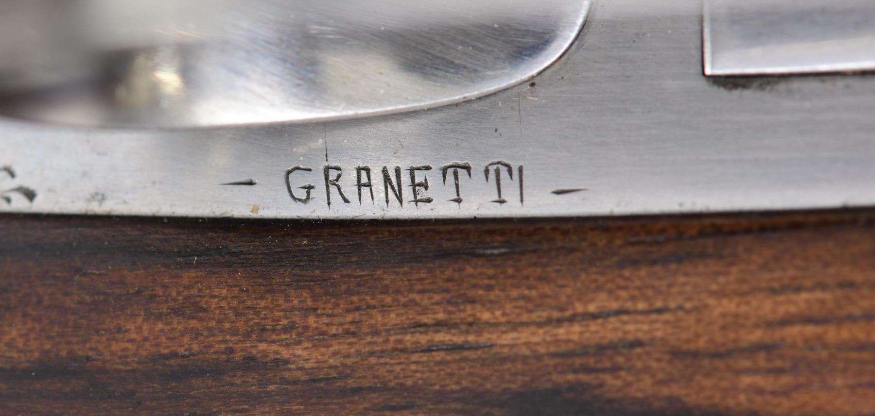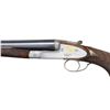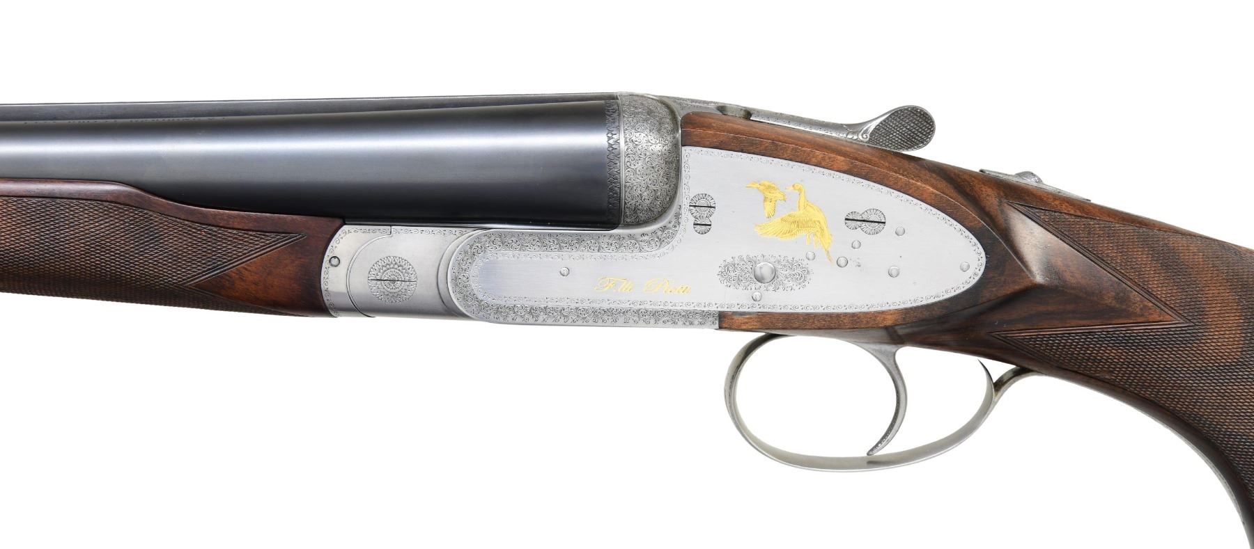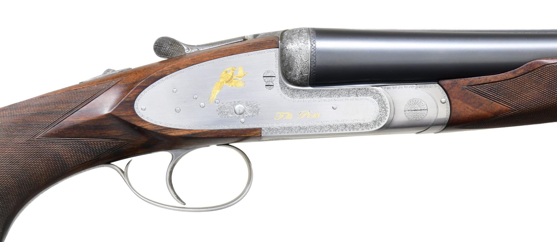 EXTRA GAME GUN WITH CASE. Cal. 12 Ga. 2-3/4". S# 7635. This finely crafted gun has 28" chopper lump barrels with slightly raised matted rib. Tops of barrels are engraved with steel type and maker's name and address. Barrel flats are stamped with 1982 Italian nitro proofs. Coin finished H&H style sidelock action features non-automatic safety, bushed strikers and non-selective single trigger. Action and lockplates are engraved with a very striking mix of small scroll surrounding fronts of lockplates which also extends to full coverage on fences. More of this fine engraving is on front of trigger plate. Other surfaces are left plain to show off exceptionally fine gunmaking skills. These plain fields are gold inlaid with Bulino renderings of game birds. A pair of mallards are on left lockplate and pheasant are on right. Bottom of action has gold and silver inlay with gold woodcock flying past a silver birch tree. Maker's name is in gold on each lockplate and a crown is in gold on top lever. Single beaded trigger guard with matching small scroll on bow, has S# on tang. This fine engraving is signed "GRANETTI" on trigger plate. Very finely marbled and lightly figured European walnut pistol grip buttstock measures 14-5/8" over brown leather covered pad. Very closely spaced point pattern checkering with mullered borders is on grip which also has right hand palm swell. Matching small beavertail ejector forend with Anson release has meticulously inlet Piotti crest in central diamond. MEASUREMENTS: BBLS: Bore Diameter: L .724. R .724. Restriction: L .017 (Mod). R .011 (Lt. Mod.). STOCK: DAH: 1-1/2". DAC: 1-1/8". CAST: neutral. LOP: 14-5/8". WEIGHT: 7 lb. 7 oz. UNATTACHED ACCESSORIES: gun is housed in its original dark brown leather case with stitched leather corners by Nizzoli. Case is lined in olive cloth and has brown Piotti label in lid. No accessories are present. CONDITION: exceptionally fine showing very little use and retaining nearly all fine factory finishes on wood and metal. There are some light marks found on right lockplate and some water spotting on wood finish of wood butt. Bores are bright and shiny. Mechanically fine. Case is also fine with minor marks and some compressions in interior cloth. This gun presently retails for over $40,000. (24-5201/MGM). MODERN. $9,000-14,000.