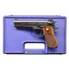 Cal. 38 Spl. S# A482207. Bbl. 5”. This 38 Spl. wadcutter only target pistol is similar to the Model 39, but it incorporates a set screw that prohibits dbl. action. Frame is grooved for counter weights utilizes the latest mfg. extractor. Blued finish on frame & slide. Checkered hardwood grips w/ gold S&W medallion. Fixed front blade sight w/ rear adj. target sight. Full length guide rod. Left side controls. Serrated hammer. Adj. trigger stop. MAGS: 2-5 rd. UNATTACHED ACCESSORIES: plastic S&W transport case. CONDITION: finish on exposed metal surfaces is complete & consistent, dark & rich. Thinning in areas of mechanical intervention. Grips have a few light impressions but no noticeable structural damage. Very crisp trigger. Bore is shiny w/ good rifling. Fire control mechanism appears to function correctly when cycled by hand. (21-3431/JZ). MODERN. $500-800.