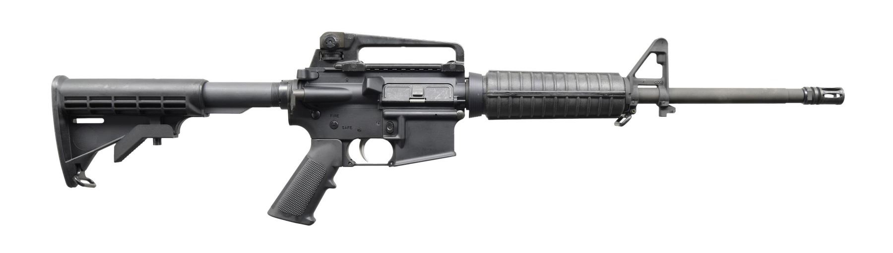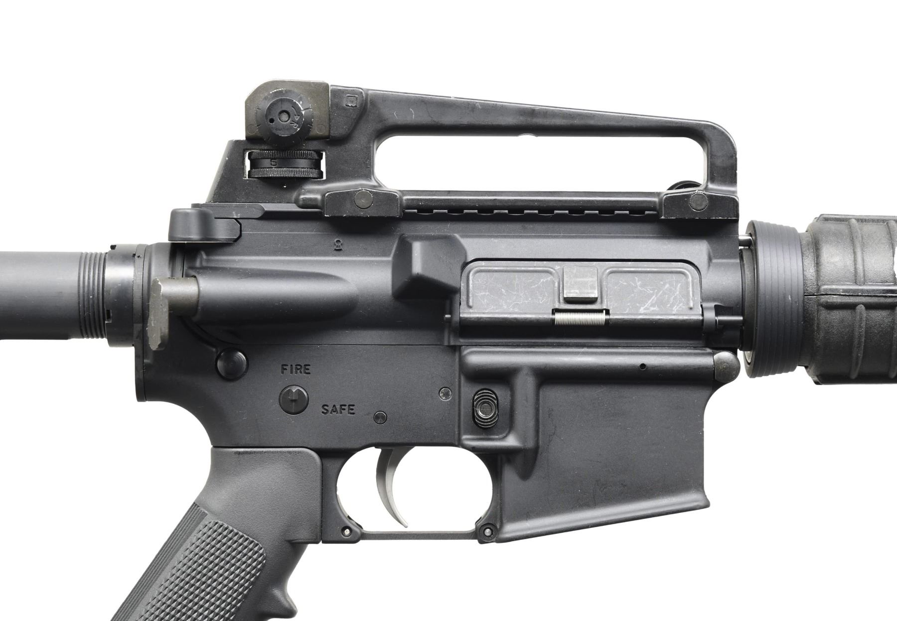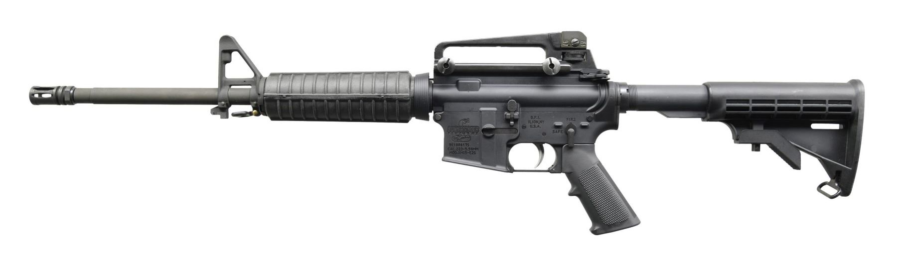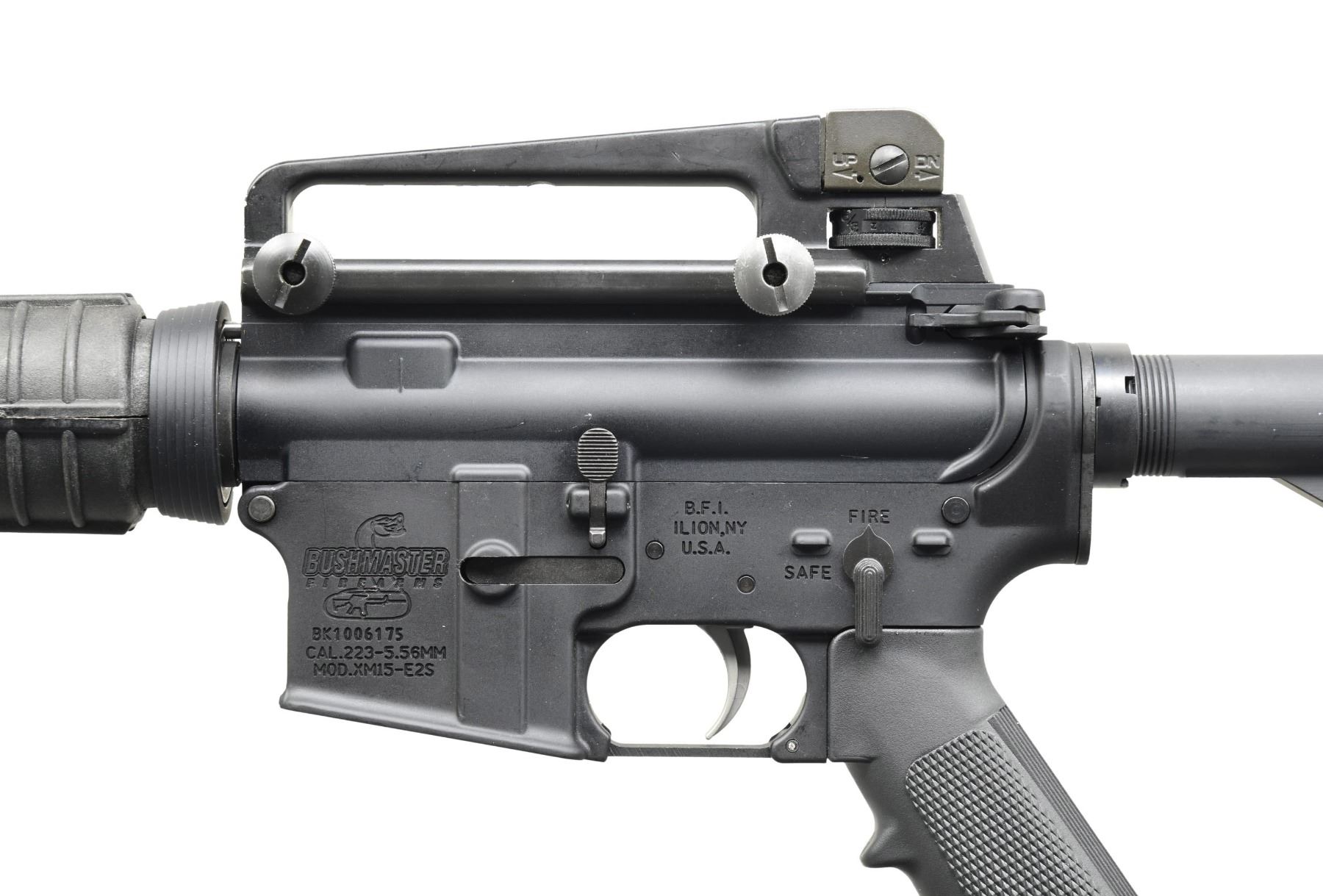 Cal. 5.56 NATO. S# BK1006175. Bbl. 16". An Ilion, NY-manufactured Bushmaster XM15-E2S carbine. Threaded barrel terminated with an A2 flash hider and 1/7 rifling. Protected post front sight, gas block, and bayonet lug. A2 round carbine handguards retained with tapered delta ring. Flat top upper receiver with teardrop forward assist, brass deflector, and removable carry handle with dual-aperture, windage and elevation-adjustable protected peep sight. Four-position collapsible shoulder stock. Left side controls. CONDITION: all aspects indicate very little use, if any, with no noticeable blemishing. Bright bore with strong rifling. Fire control mechanism appears to function correctly when cycled by hand. (24-5388/JZ). MODERN. $500-900.