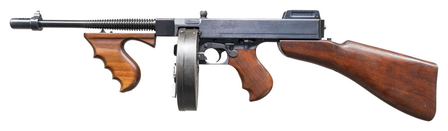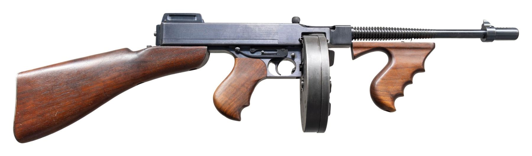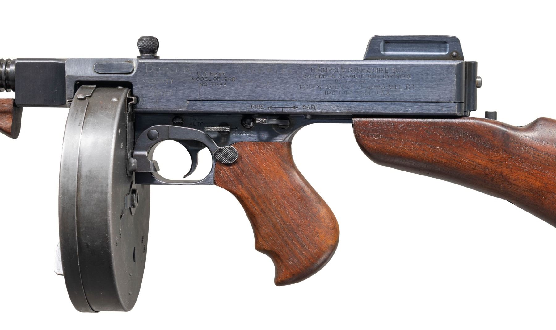 SUBMACHINE GUN. Cal. 45 ACP. S# 7544. Bbl. 12". Mfg. 03/21-07/22. Between these dates, 15,000 Thompson Machine Guns were manufactured by the Colt Firearms Corporation of Hartford, CT. Each gun manufactured was given the designation, and marked as the Model of 1921. While manufacturing was quick, by comparison, the sale of these guns took place over a span of almost 20 years. During this time, there were alterations & upgrades that affected the configuration & final markings at the time of actual sale. While the original Model of 1921 guns boasted a cyclic rate of 800 rounds per minute (RPM), beginning January 1927 Colt altered several examples to fire at a lower rate of fire, on advise from the United States Marine Corps, following their original deployment in the Nicaraguan Jungles. These "slowed down" examples, as they were requested, were made from Model of 1921 guns that were given a heavier actuator, a different recoil spring and buffer, were to become known as the U.S. Model of 1928 Navy. They are also often referred to as a "1928 Overstamp" due to the method Colt used to remark the guns. The words "U.S. Navy" were added above the original model designation, and a number "8" was hand stamped over last "1" in "1921" to become the Model of 1928. The stamped "8" can often be mistaken for the letter "B" depending on how the new stamp was placed over the original "1". This particular gun is listed in Gordon Herigstad's book, "Colt Thompson Submachine Gun Serial Numbers and Histories" as being delivered to the Butler County Sheriff's Office in Hamilton, Ohio, shipped 11/7/1933, on page 767. It boasts a blued finish and unmarked Cutts integral w/ the front sight. Barrel has 29 fins above the vertical foregrip. Lyman windage adjustable rear sight, notch for close quarters & elevation adjustable to 600 yards when lifted up. Left side controls. Receiver properly marked; "U.S. NAVY / MODEL OF 1928 (8 over the original 1) / NO 7544" above the pistol grip. Rear of receiver, also on right marked; "THOMPSON SUBMACHINE GUN / CALIBRE .45 COLT AUTOMATIC COLT CARTRIDGE / MANUFACTURED BY / COLT'S PATENT FIRE ARMS MFG. CO. / HARTFORD, CONN. U.S.A.". Left side fire control markings are "FULL / AUTO" & "SINGLE". Right side receiver markings include; "AUTO-ORDNANCE CORPORATION / NEW YORK U.S.A. & Patent block ending w/ DECEMBER 28, 1920" as well as "JHB", acceptance stamp for John H. Barrett, Colt's quality control inspector. Top of receiver marked w/ "Thompson" bullet logo forward of rear sight. Trigger frame stamped "NO 7544", matching receiver serial number. Push button, detachable hardwood shoulder stock w/ metal butt plate & trap door, matching finish, color & condition of pistol grip & vertical grip. Trap door in shoulder stock still retains oil bottle & fiber cushion inside. Shoulder stock marked w/ small anchor at front, close to metal in quick detatch assembly as used by the stock-maker Remington Arms. Gun has correct 1928 internals consisting of the weighted actuator w/ knurled cocking handle, bronze Blish lock, bolt, 1 piece op-rod spring & red fiber buffer. Blish lock is unmarked, aside from the "UP" mark w/ arrow. Butler County Sheriff's Office marked this gun w/ an electro pencil in several locations including left side of receiver, trigger frame under stock, steel butt plate, inside of trap door. MAGS: (4 total) 1 matte finish " New York" 50 rd. L-Drum, Black parkerized. 3 steel 20 rd. (2 electro pencilled "Butler County Sheriff's Office Ohio, 1 not marked by them.) UNATTACHED ACCESSORIES: black folding Kasekraft case w/ blue velvet interior & cleaning rod & manual. CONDITION: finish enjoys complete & consistent coverage w/ some period typical high edge thinning & in areas of mechanical intervention. Wood furniture is dark and all matching w/ a few light scratches & impressions. All markings are deep, clear, & easy to read. The case in in very nice condition w/ working latches. Blue velvet interior appears undamaged in any way. Bright bore w/ well defined rifling. Fire control mechanism appears to function correctly when cycled by hand & is silky smooth as would be expected. NATIONAL FIREARMS ACT MG REQUIRING BATF TRANSFER BEFORE TAKING POSSESSION. FULLY TRANSFERABLE.(03-1916/JZ). CURIO CLASS III. $30,000-45,000.