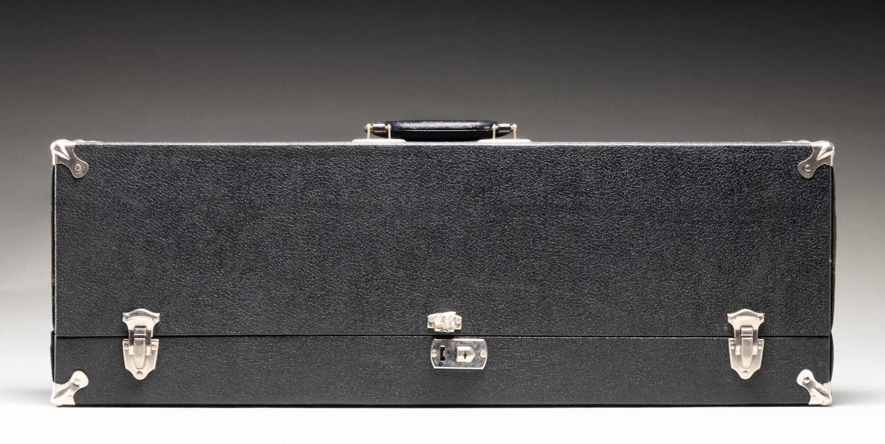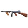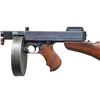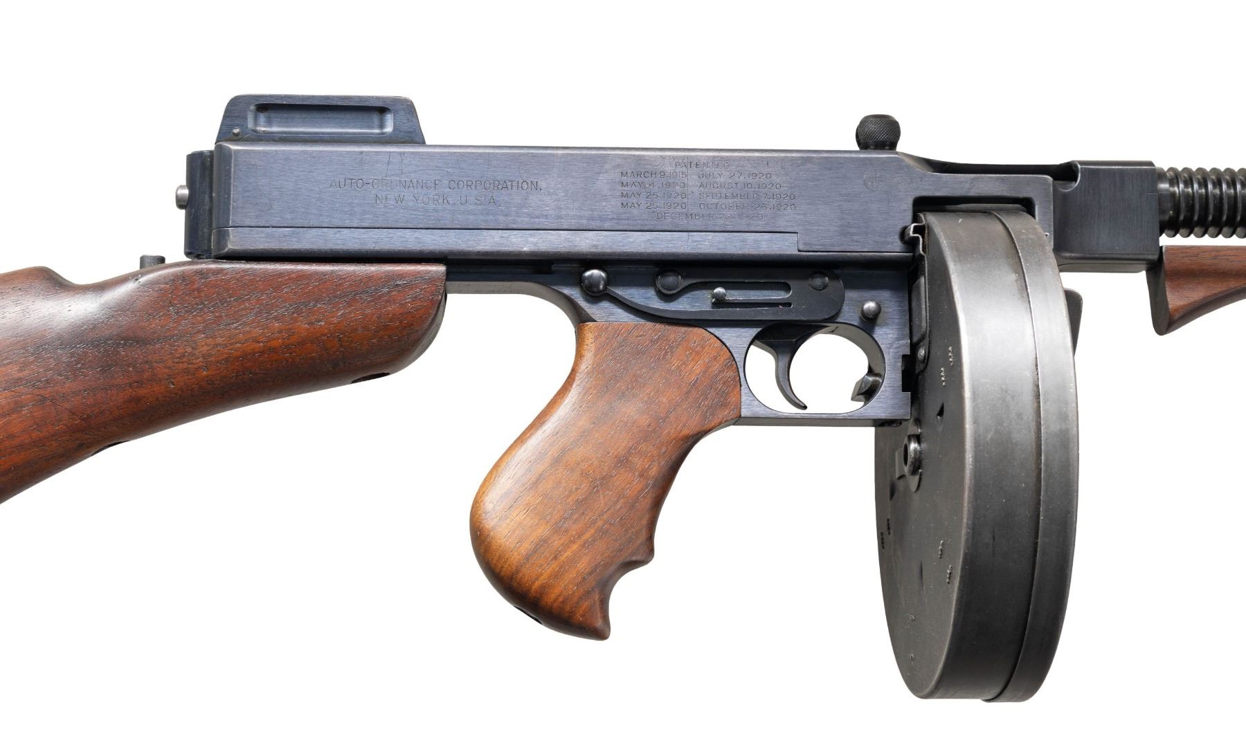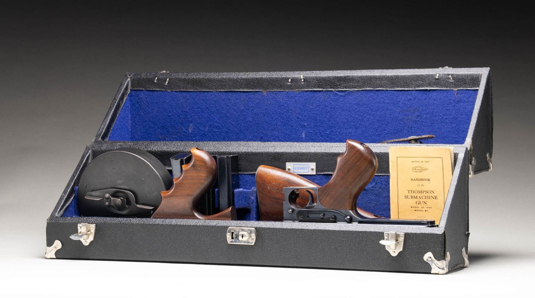 SUBMACHINE GUN. Cal. 45 ACP. S# 7544. Bbl. 12". Mfg. 03/21-07/22. Between these dates, 15,000 Thompson Machine Guns were manufactured by the Colt Firearms Corporation of Hartford, CT. Each gun manufactured was given the designation, and marked as the Model of 1921. While manufacturing was quick, by comparison, the sale of these guns took place over a span of almost 20 years. During this time, there were alterations & upgrades that affected the configuration & final markings at the time of actual sale. While the original Model of 1921 guns boasted a cyclic rate of 800 rounds per minute (RPM), beginning January 1927 Colt altered several examples to fire at a lower rate of fire, on advise from the United States Marine Corps, following their original deployment in the Nicaraguan Jungles. These "slowed down" examples, as they were requested, were made from Model of 1921 guns that were given a heavier actuator, a different recoil spring and buffer, were to become known as the U.S. Model of 1928 Navy. They are also often referred to as a "1928 Overstamp" due to the method Colt used to remark the guns. The words "U.S. Navy" were added above the original model designation, and a number "8" was hand stamped over last "1" in "1921" to become the Model of 1928. The stamped "8" can often be mistaken for the letter "B" depending on how the new stamp was placed over the original "1". This particular gun is listed in Gordon Herigstad's book, "Colt Thompson Submachine Gun Serial Numbers and Histories" as being delivered to the Butler County Sheriff's Office in Hamilton, Ohio, shipped 11/7/1933, on page 767. It boasts a blued finish and unmarked Cutts integral w/ the front sight. Barrel has 29 fins above the vertical foregrip. Lyman windage adjustable rear sight, notch for close quarters & elevation adjustable to 600 yards when lifted up. Left side controls. Receiver properly marked; "U.S. NAVY / MODEL OF 1928 (8 over the original 1) / NO 7544" above the pistol grip. Rear of receiver, also on right marked; "THOMPSON SUBMACHINE GUN / CALIBRE .45 COLT AUTOMATIC COLT CARTRIDGE / MANUFACTURED BY / COLT'S PATENT FIRE ARMS MFG. CO. / HARTFORD, CONN. U.S.A.". Left side fire control markings are "FULL / AUTO" & "SINGLE". Right side receiver markings include; "AUTO-ORDNANCE CORPORATION / NEW YORK U.S.A. & Patent block ending w/ DECEMBER 28, 1920" as well as "JHB", acceptance stamp for John H. Barrett, Colt's quality control inspector. Top of receiver marked w/ "Thompson" bullet logo forward of rear sight. Trigger frame stamped "NO 7544", matching receiver serial number. Push button, detachable hardwood shoulder stock w/ metal butt plate & trap door, matching finish, color & condition of pistol grip & vertical grip. Trap door in shoulder stock still retains oil bottle & fiber cushion inside. Shoulder stock marked w/ small anchor at front, close to metal in quick detatch assembly as used by the stock-maker Remington Arms. Gun has correct 1928 internals consisting of the weighted actuator w/ knurled cocking handle, bronze Blish lock, bolt, 1 piece op-rod spring & red fiber buffer. Blish lock is unmarked, aside from the "UP" mark w/ arrow. Butler County Sheriff's Office marked this gun w/ an electro pencil in several locations including left side of receiver, trigger frame under stock, steel butt plate, inside of trap door. MAGS: (4 total) 1 matte finish " New York" 50 rd. L-Drum, Black parkerized. 3 steel 20 rd. (2 electro pencilled "Butler County Sheriff's Office Ohio, 1 not marked by them.) UNATTACHED ACCESSORIES: black folding Kasekraft case w/ blue velvet interior & cleaning rod & manual. CONDITION: finish enjoys complete & consistent coverage w/ some period typical high edge thinning & in areas of mechanical intervention. Wood furniture is dark and all matching w/ a few light scratches & impressions. All markings are deep, clear, & easy to read. The case in in very nice condition w/ working latches. Blue velvet interior appears undamaged in any way. Bright bore w/ well defined rifling. Fire control mechanism appears to function correctly when cycled by hand & is silky smooth as would be expected. NATIONAL FIREARMS ACT MG REQUIRING BATF TRANSFER BEFORE TAKING POSSESSION. FULLY TRANSFERABLE.(03-1916/JZ). CURIO CLASS III. $30,000-45,000.