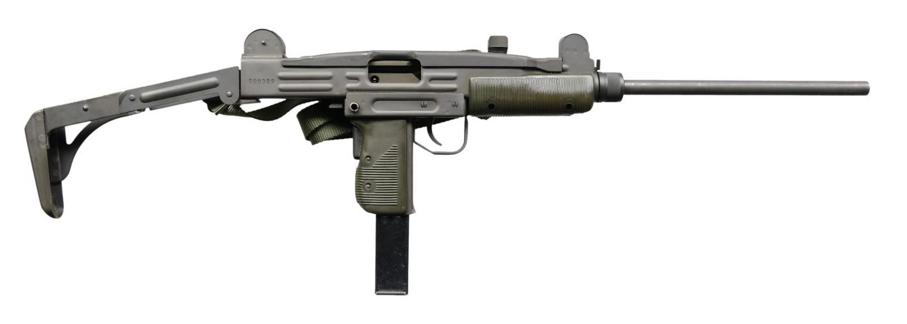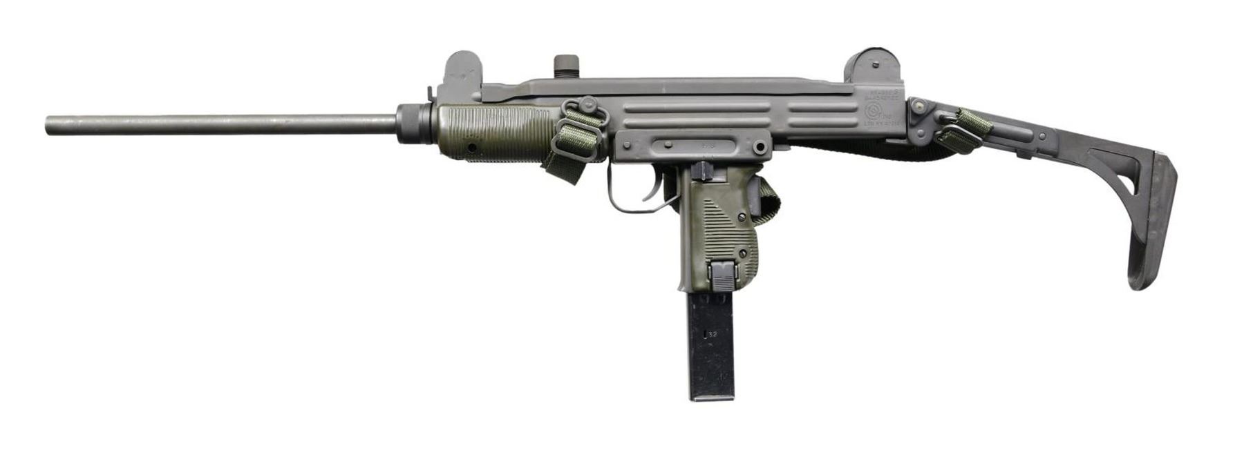 Cal. 9mm. S# 500389. Bbl. 16". The closed bolt semi automatic version of the world-famous SMG. Fitted w/ factory collapsible stock. It was designated the Model HR4332S due to the federal ban on machine gun ownership due to the Hughes Amendment being attached to the Firearm Owners Protection Act, House Resolution 4332 (HR4332). Adjustable protected post front sight. Dual aperture rear peep sight, marked "1" & "2". Parkerized finish on most exposed metal parts. F-S trigger group. Rotating sling swivel on left side of receiver. Currently hosting green web sling. Dark green plastic furniture. MAGS: 1 steel 32 rd. CONDITION: Finish complete & consistent w/ some light thinning in areas of mechanical intervention. Stock locks properly in both folded & extended positions. Furniture in very nice condition. Bore is bright w/ strong rifling. Fire control mechanism appears to function properly when cycled by hand. PROVENANCE: Lifelong Collection of Terrance McCarty. (24-586/JZ). MODERN. $1,000-1,500.