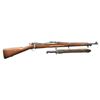 BOLT ACTION MILITARY RIFLE W/ 1909 DATED BAYONET. Cal. 30-06. S# 157829. Bbl. 24" marked behind front sight “R.I.A.” “flaming bomb” & “11-09”. Ladder rear sight graduated to 2850 yards w/ volley notch. Dished grooved adjustment knobs. Blade front sight. This rifle is a very fine original specimen of a Rock Island produced Model 1903 rifle. The boxed “CN” (Conrad Nelson) final inspection stamp is dated 1910. The receiver markings & S# are block letters & numerals. Receiver has gas escape hole on right side. Bolt w/ straight down handle is unmarked made w/ single gas hole at bottom. Extractor has gas hole. Safety letters & cutoff letters have serifs. Matching walnut stock set. High wood buttstock. Boxed inspection stamp on left side over trigger guard is enhanced in white. Stock tip is marked “S”.  While this mark is controversial & many theories abound, definite proof is lacking as to its meaning. The “S” may indicate a stock mfg. at Springfield Armory; yet this marking may be found on both Springfield & Rock Island mfg. rifles of this time period. Has circled script “P” proof under grip & tiny “J” assembly mark. Stock mfg. w/ single recoil bolt below cutoff. Handguard made w/ concave slope & sight line clearance cut w/ 2 handguard clips. Blued steel furniture. Smooth trap buttplate. UNATTACHED ACCESSORIES: nickel plated brass oiler. 15-7/8” fullered blade Model 1905 bayonet marked on left Ricasso “RIA” “flaming bomb” & “1909”. Right Ricasso marked “US” & “S#”. Corrugated walnut grips w/ birds head pommel. Model 1905 leather scabbard which had been converted to the Model 1910 attachment system. Faint scabbard markings include “RIA” & “19?”. Bayonet blade was blued the entire length, only traces of blue remain. Blade is turning gray w/ areas of very light oxidation. Balance of metal turning gray & patina. Grips have moderate wear. Left grip has approx. 1-1/4" crack. Scabbard is heavily worn. Belt hook attachment is missing belt hook & part of leather attachment. Stitching is loose & wooden liner is protruding at tip. Metal throat is overall patina. CONDITION: stock set has a very nice original finish w/ crisp markings, light wear & scattered sm. handling marks; however the buttstock, notably on the right side, has a lightly worn flaking appearance probably resulting from an early application of extra oil finish. Metal has thinning original blue. Receiver & bolt have turned mostly gray w/ traces of blue in protected areas. Buttplate, floorplate, bottom of trigger guard, & upper band have notably thinned blue turning gray. Front sight band has wear from use of an issue sight protector. Very good shiny bore w/ sharp lands. (22-4171/RW). CURIO.  $2,000-3,000.