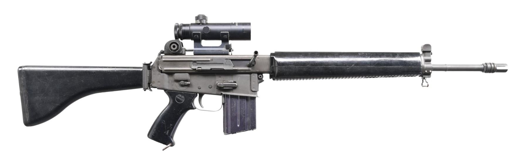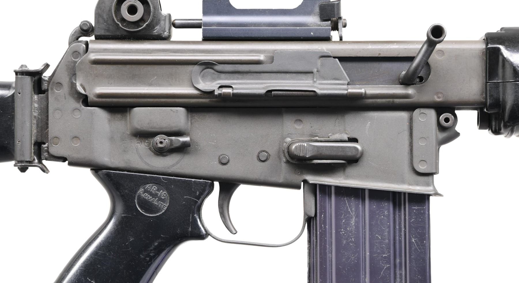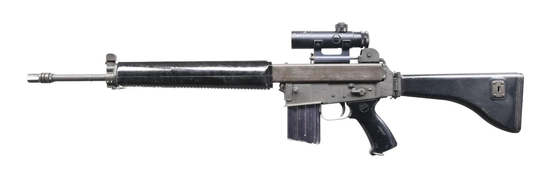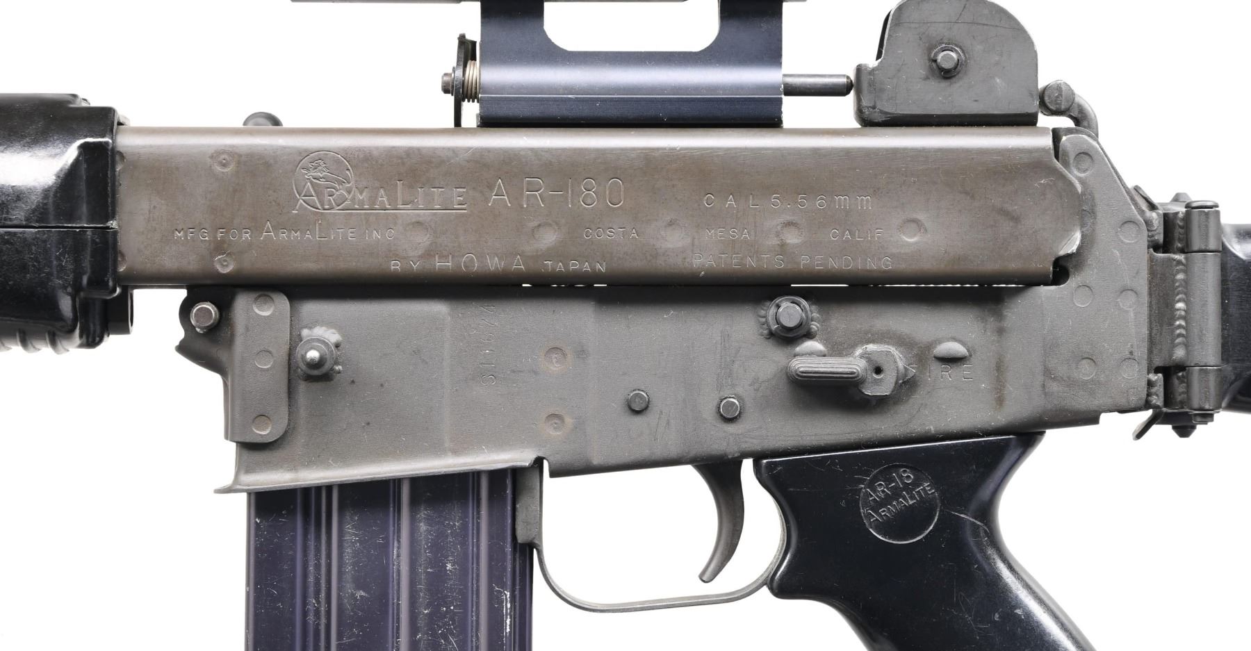 Cal. 5.56mm. S# S11674. Bbl. length 18". The original ArmaLite AR-18 was designed in 1963 in CA. as a potential alternative for the U.S. military. When it started to look as though it would not be adopted as a standard service rifle, production was licensed to Howa Machinery Co. in Japan where they began production in 1967. Because military sales to U.S. were effected by American-Japanese treaty agreements that forbid Japan in selling to arms to "belligerent nations", it was determined rifles could not be sold to the U.S. due to our involvement in Vietnam. In 1974 ArmaLite & Sterling Ltd. in England signed a production agreement to manufacture both the AR-18 (Select-Fire version) & the AR-180 (the semi automatic commercial version) & started manufacturing rifles in 1975. This particular example was mfg. for ArmaLite Inc. in Costa Mesa, CA. by Howa Japan under ArmaLite patents. Serial number located on lower receiver. It is a gas operated piston driven semi auto rifle w/ a left side folding stock. Front sight is an elevation adjustable protected post. Rear sight is a windage adjustable dual aperture peep sight marked 200 & 400. 2.75x20mm ArmaLite scope w/ heavy top post reticle. The rifle is charged by a reciprocating handle on the right side of the rifle. Ambidextrous safety selector controls. Black plastic furniture. Proper muzzle brake & correct partial bayonet lug w/ sling swivel. MAGS: 1 aluminum 20 rd. w/ ArmaLite AR-18 floorplate. CONDITION: bluing is complete on all exposed metal surfaces w/ some gentle thinning in areas of moving parts. Stock locks tightly in open & closed positions. Bore is bright w/ strong rifling. Fire control mechanism appears to function correctly when cycled by hand. PROVENANCE: Lifelong Collection of Terrence McCarty. (24-452/JZ). MODERN. $1,200-1,800.