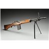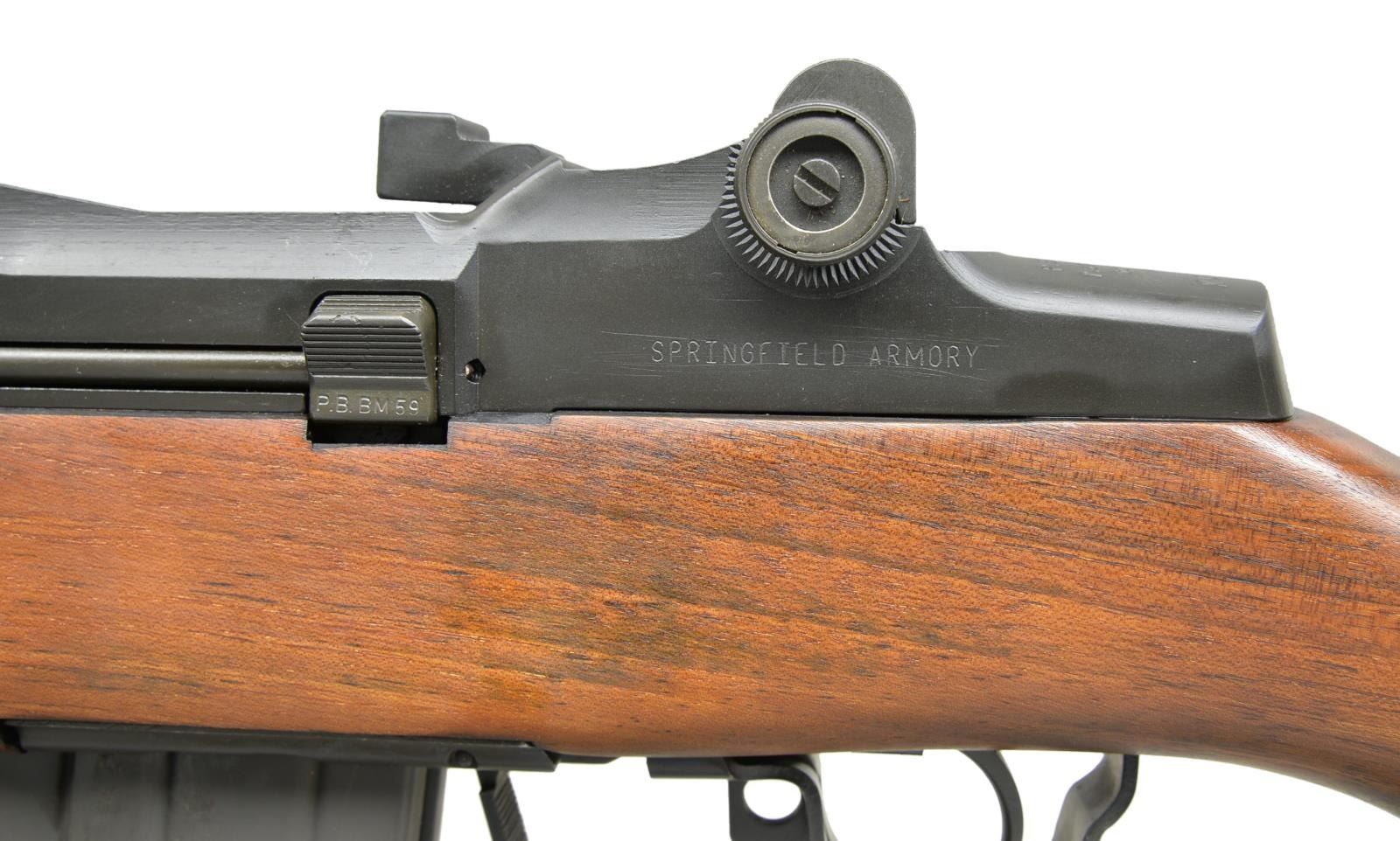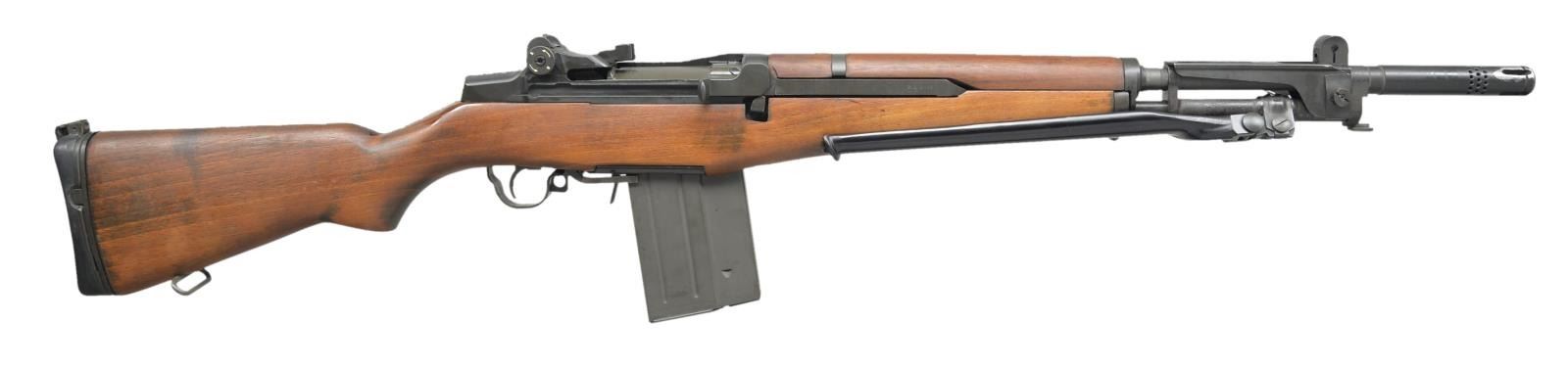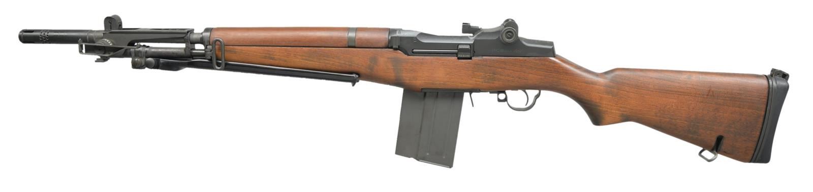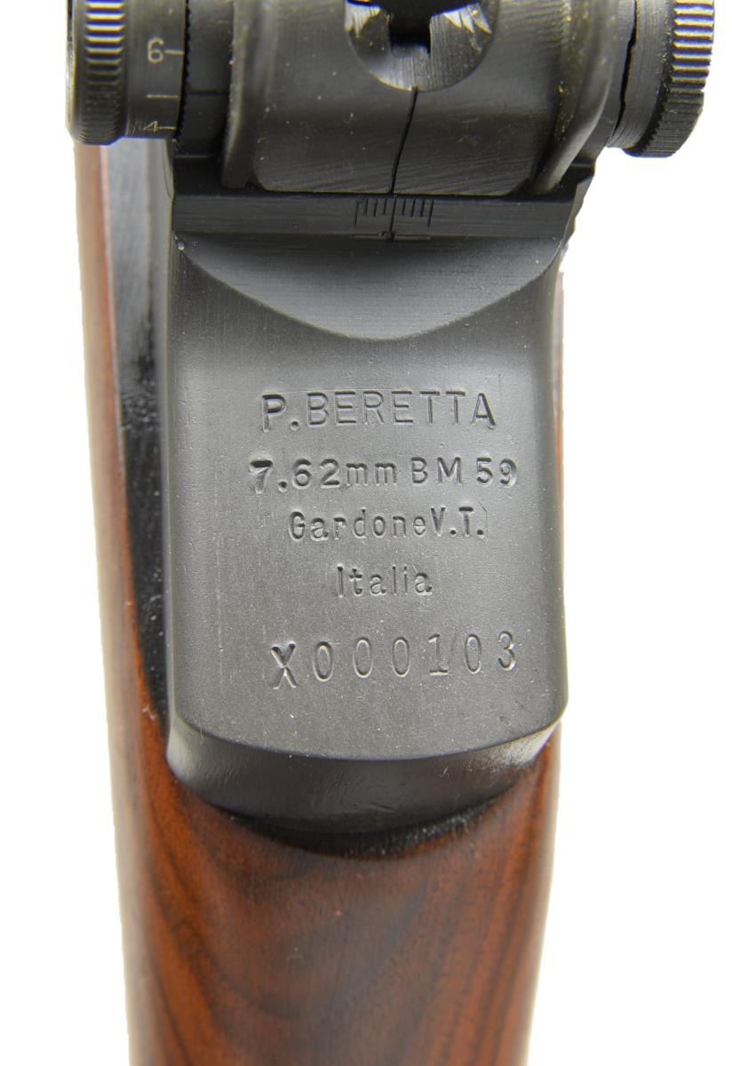 FIRE RIFLE. Cal. 7.62 NATO. S# X000103. Bbl. 19". Heavily resembling a crossover between the M-1 Garand & the M-14, the Italian BM59 is a creature all to itself. Bridging the gap between the 2 systems we have the receiver style of the M-1 Garand w/ detachable mag. capabilities of the M-14 in the 7.62 NATO cartridge. Housed in a beautiful hardwood stock w/ matching bbl. shroud, it enjoys a dark stain that still illustrates the original wood grain. It has an interesting muzzle brake, sometimes referred to as a Tri-comp, doubling as a grenade launcher, also including a folding grenade sight system. A rugged bipod providing over 11" of clearance, folds tightly under the forearm of the stock when not employed. The front sight is a protected blade style w/ a rear peep sight that is micro adj. for both windage & elevation. The receiver is designed to be top loaded utilizing stripper clips even though it utilizes a detachable 20 rd. proprietary box mag. The fire control selector is located on the front left side of the receiver w/ designations A-S for automatic & semi-automatic. Left rear portion of the receiver is marked “SPRINGFIELD ARMORY’. Extreme rear of the receiver on top is marked “P. BERETTA - 7.62MM BM59 – GARDONE VT – ITALIA – X000103”. Right side charging handle. Folding Winter trigger. Safety is located internally at the front of the triggerguard. Shoulder stock utilizes a rubber buttpad that conceals a folding shoulder rest. Sling swivels front & rear. Several components individually marked “PB BM59” as well as additional markings on side. MAGS: 1-20 rd. UNATTACHED ACCESSORIES: factory green & white Springfield Armory cardboard box; assorted manuals & pamphlets as provided by Springfield including the dated original headspace card. CONDITION: exposed metal surfaces still enjoy complete coverage of original matte finish. Very gentle thinning on high spots & on areas of mechanical interaction. Painted section on gas tube is a bit darker than parkerized areas. Muzzle brake has an area at approx. 1 o’clock where the finish has thinned such as would be expected in long term vertical storage. Wood stock has a few light impressions & a sm. amount of staining from gas bleeding at the front portion. All sights move freely & bipod properly intersects w/ designated positions on stock. Bore is bright w/ well pronounced rifling. Fire control mechanism appears to function correctly when cycled by hand. NATIONAL FIREARMS ACT MG REQUIRING BATF TRANSFER BEFORE TAKING POSSESSION. FULLY TRANSFERABLE. (03-1524/JZ). MODERN CLASS III. $12,000-18,000.