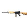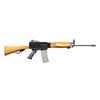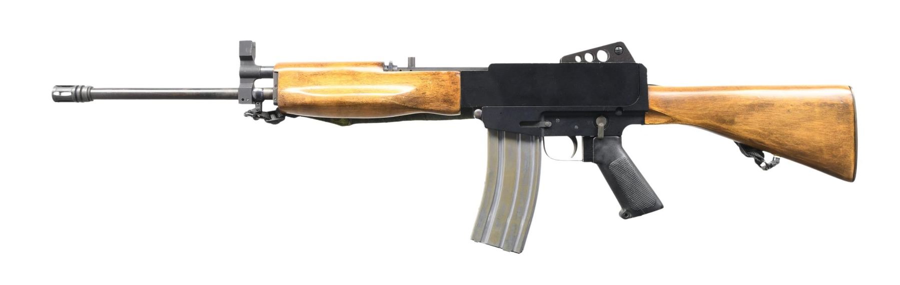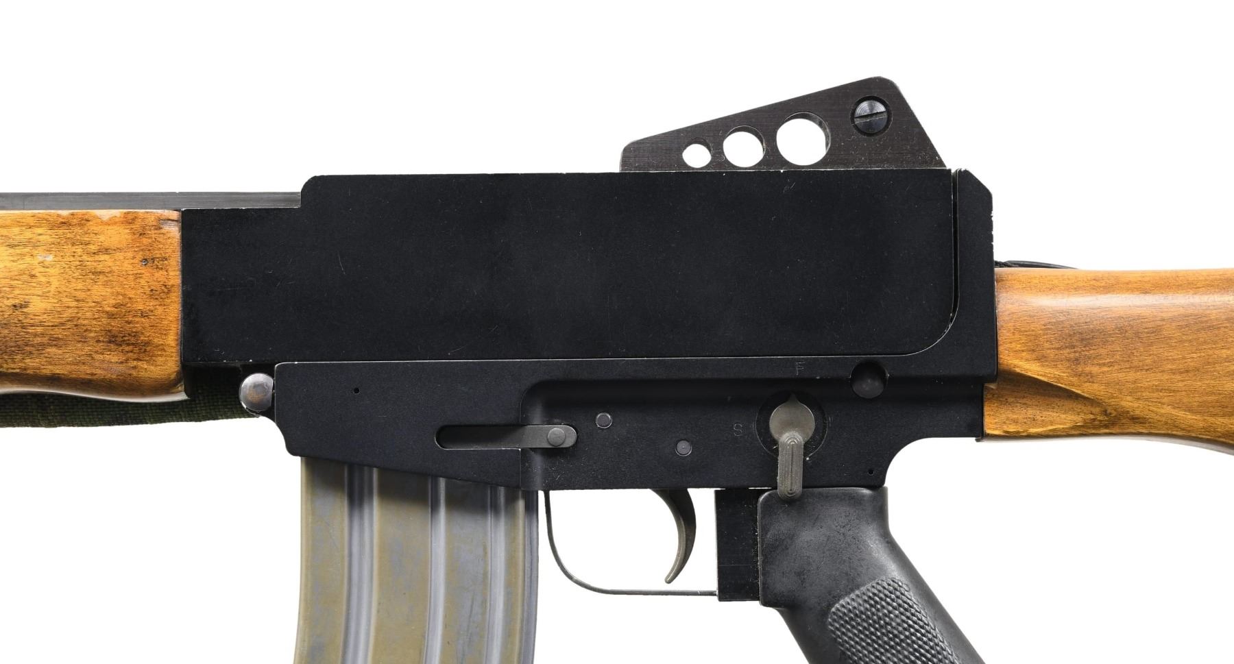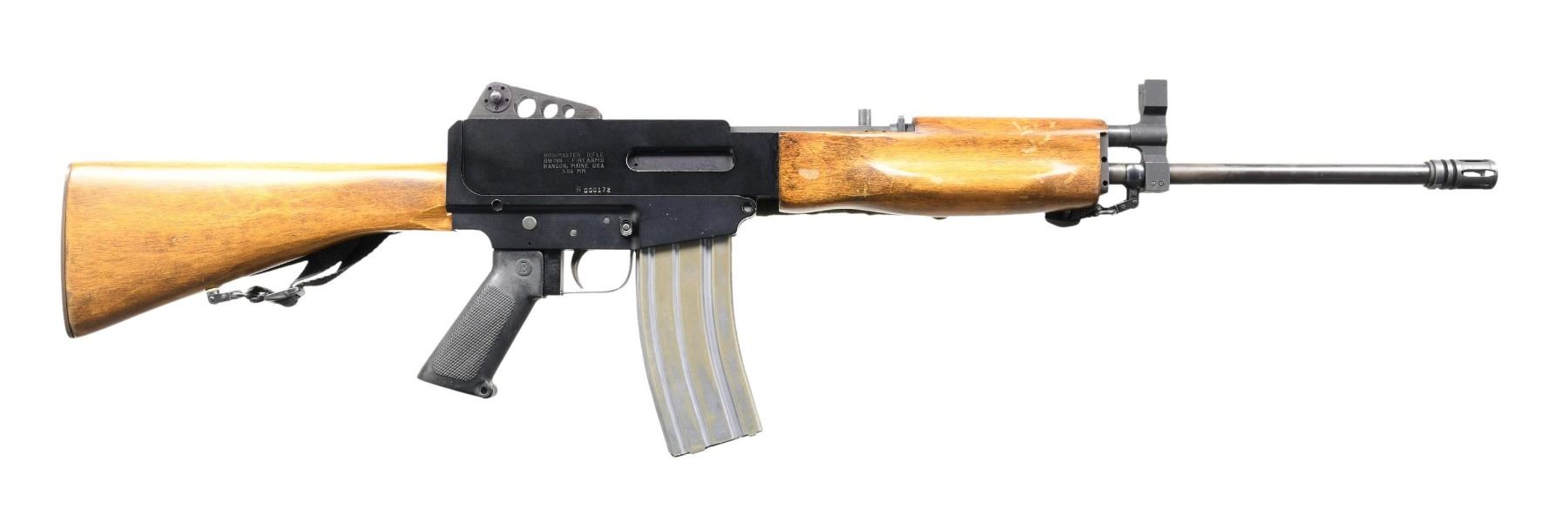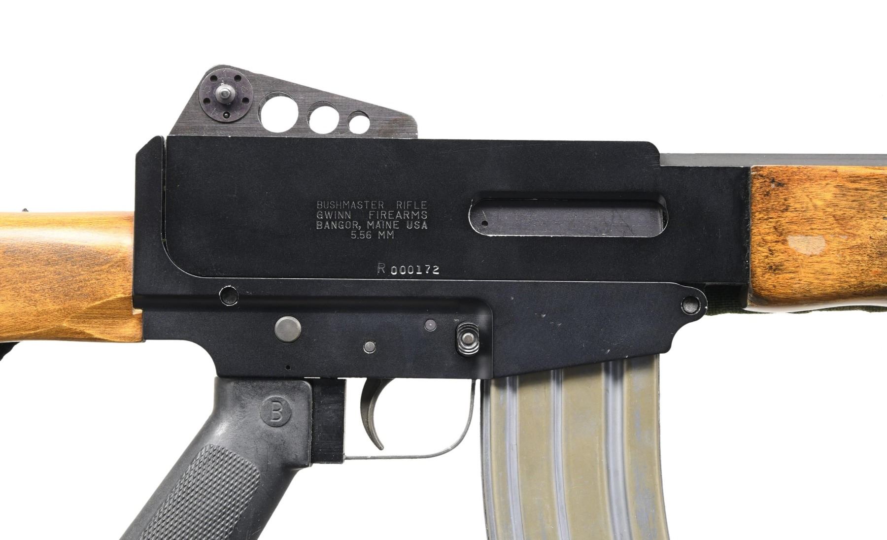 Cal. 5.56mm. S# R000172. Bbl.18". A very early Bushmaster Rifle from the original Bangor Maine location. Threaded barrel, terminated w/ A1 flash hider. Protected post front sight. Top mounted charging handle. Aluminum upper & lower receivers. Left side safety / selector. Dual aperture rear protected peep sight. Black plastic pistol grip. Matching hardwood forend & shoulder stock. Black anodized finish on all exterior aluminum surfaces. Sling swivels, front & rear, currently sporting nylon sling. MAGS: 1 aluminum OKay 30 rd. CONDITION: Finish on receivers complete & consistent w/ full coverage and little sign of use. Barrel finish has thinned considerably in the section just forward of the gas block. Stock & forend in very nice condition w/ only a few light impressions on top of forend, typically indicative of vertical rack storage. Bright bore w/ strong rifling. Fire control mechanism appears to function correctly when cycled by hand. PROVENANCE: Lifelong Collection of Terrence McCarty. (24-487/JZ). MODERN. $800-1,200.