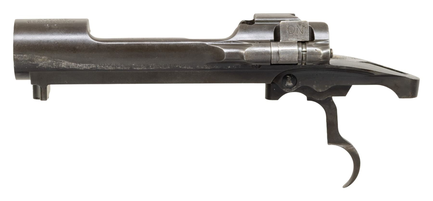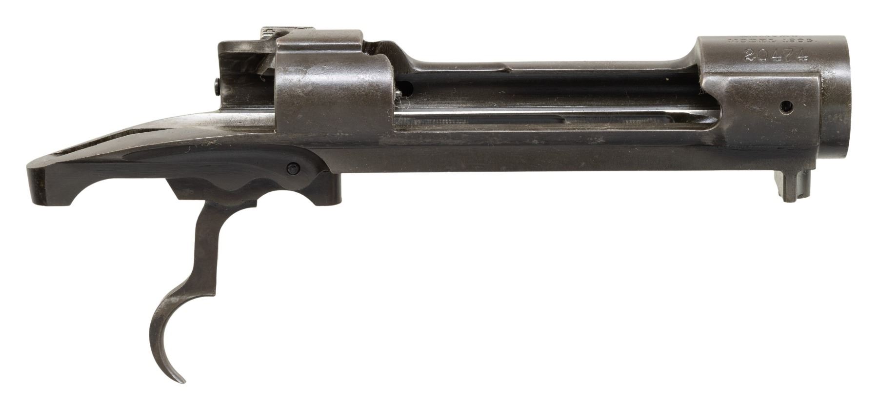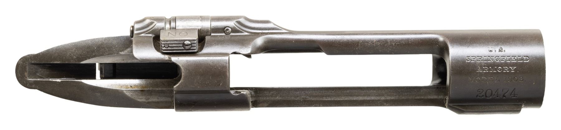 RECEIVER. S# 20474. Receiver made in 1904 was originally completed as a rod bayonet Springfield. Receiver has the early small lettering on top of receiver ring "U.S. / SPRINGFIELD / ARMORY / MODEL 1903". Receiver is equipped with trigger assembly, which has the narrow smooth trigger. Replacement cutoff assembly is present. Hold-open pin is present. CONDITION: receiver retains 70% of its period arsenal rework blue with thinning light wear. (25-3014/RW). MODERN. $100-200.