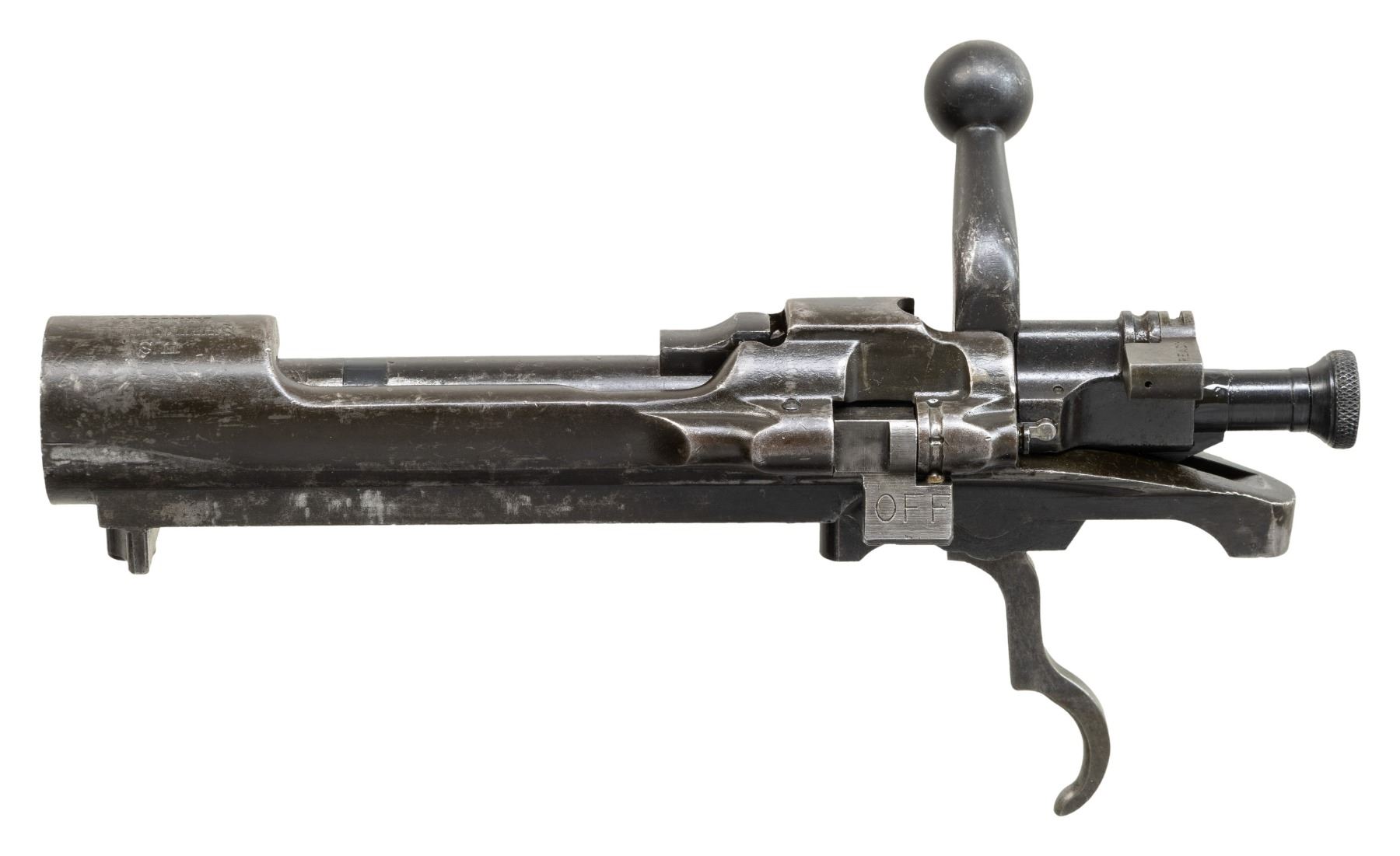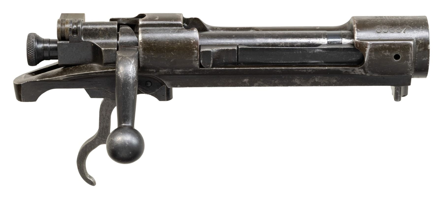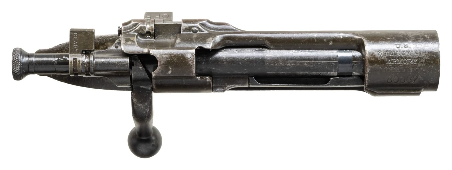 RECEIVER WITH BOLT ASSEMBLY. S# 80667. Receiver manufactured in 1903 and was certainly a rod bayonet rifle as manufactured. Receiver ring is marked on top with the small letters "U.S. / SPRINGFIELD / ARMORY / MODEL 1903". Receiver is equipped with narrow smooth trigger assembly which would release the sear if the trigger is pushed forward. Cutoff assembly is later replacement. CONDITION: receiver has a worn period arsenal reworked finish, leaving scattered spots of gray throughout. Bolt has similar appearance. (25-3151/RW). MODERN. $100-200.