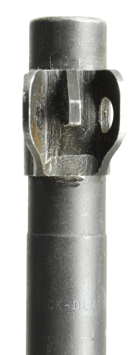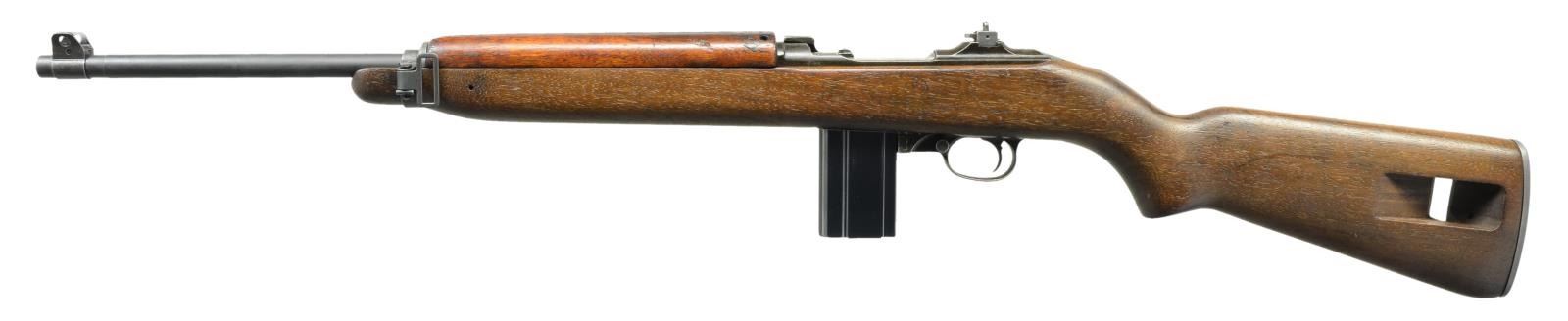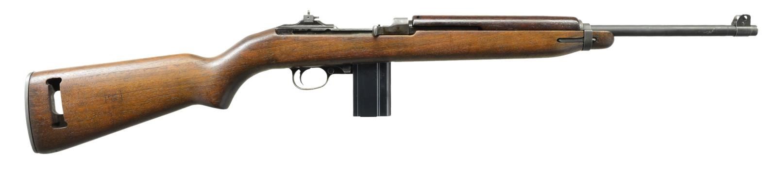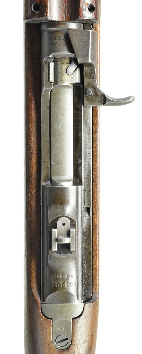 CARBINE WITH ALL ROCK-OLA MARKED PARTS. Cal. 30 Carb. S# 1671904. Bbl. 18", marked w/ faint markings behind front sight "ROCK-OLA 5-43". Unmarked narrow bbl. band w/ stamped swivel. Swivel screw appears to be replacement. Flip type rear sight marked "S" "BR". Receiver made w/ detachable mag. tool & 2 takedown notches. Straight cut slide marked "ROCK-OLA". Flat bolt marked "ROCK-OLA". Milled Rock-Ola trigger housing. Push button safety. Mag. catch marked "B-P". Straight cut hammer marked "RK". High wood T-slot walnut stock marked "RMC" in sling slot. Very faint boxed "RIA BD" overhaul marking from Rock Island Arsenal & also very faint ordnance "crossed cannons". 2 Rivet walnut handguard w/ deep groove marked "RNC" & tiny "flaming bomb". MAGS: 1 detachable 15 rd. marked "R-C". CONDITION: stock set has good original appearing finish & very light wear & handling marks. Original buttstock markings on right side may have been cleaned when the Rock Island marking was applied. Metal has 75% original finish w/ light wear & handling marks. Bbl. has added arsenal rework finish which does not match the wear pattern of the balance of the metal. Good shiny bore. Lands have dull frosted appearance. (21-3585/RW). CURIO. $3,500-4,500.