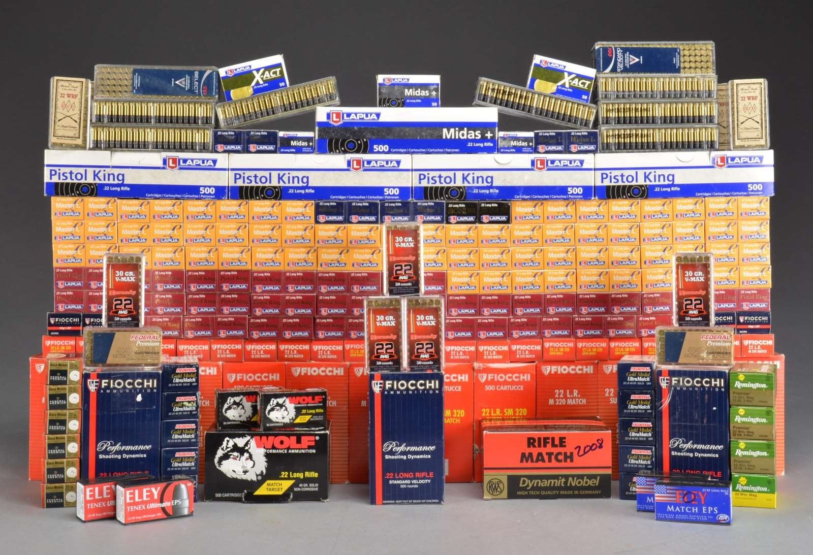 CALIBER AMMUNITION. Ammunition is predominantly 22 Match Grade Long Rifle. 22 Long Rifle: Lapua 40 gr. - Pistol King 4 bricks of 500 rd., 2 bulk packs of 500 rd., 52 50 rd. boxes. / 72 50 rd. boxes of Lapua Master L. lead. / 1 brick of 500 rd & 3 boxes of 50 rd. Lapua Midas Plus. / 5 boxes of 50 rd. X-Act. / 11 boxes of 50 rd. Midas L. / 2 boxes of 50 rd. Signum. / 1 box of 50 rd. Speed Ace. Fiocchi 40 gr.: 7 bricks of 500 rd. & 13 50 rd boxes of M320 Match. / 5 bricks of 500 rd. & 9 boxes of 50 rd. SM 320 Super Match. / 3 500 rd bricks & 4 50 rd boxes of Performance Shooting Dynamics. RWS: 40 gr. 1 brick of 500 rd. & 2 50 rd. boxes Rifle Match. / 1 box of 50 rd R50. / 1 box of 50 rd. Target Rifle. / 1 box of 50 rd. Subsonic. Wolf 40 gr.: 1 brick of 500 rd. & 2 50 rd. boxes of Match Target. Eley 40 gr.: 3 50 rd. boxes of Tenex Ultimate. / 4 50 rd. boxes of Match EPS. / 2 50 rd. boxes of High Velocity HP. / 1 50 rd. box of High Velocity Solid. / 1 50 rd. box of Standard. Federal: 10 boxes of 50 rd. Gold Medal 40 gr. solid. / 6 boxes of 50 rd. Federal Premium Gold Medal 40 gr. solid. / 4 100 rd. plastic boxes of CCI Select Precision 40 gr. round nose. / 5 boxes of 100 rd. CCI Standard Velocity 40 gr. round nose. 22 Win Mag: Remington 6 boxes of 50 rd. 40 gr. JHP. / Federal 2 boxes of 50 rd. 30 gr. TNTHP. / Winchester 2 boxes of 50 rd. 40 gr. JHP. / CCI 1 box of 50 rd. Maxi Mag TNT JHP. & 1 box of 50 rd. V-Max 30 gr. polymer tip. / Hornady 5 boxes of 50 rd. 30 gr. B-Max polymer tip. 22 WRF: 4 boxes of 50 rd. CCI 45 gr. HP. Group also includes 28 part boxes mixed types & brands. CONDITION: all packaging ranges from very good to nearly new. Many Lapua 50 rd. boxes are shrink wrapped in pairs. PROVENANCE: From the Frederic W. Thrane Collection. (02-14151/RW). $900-1,400.