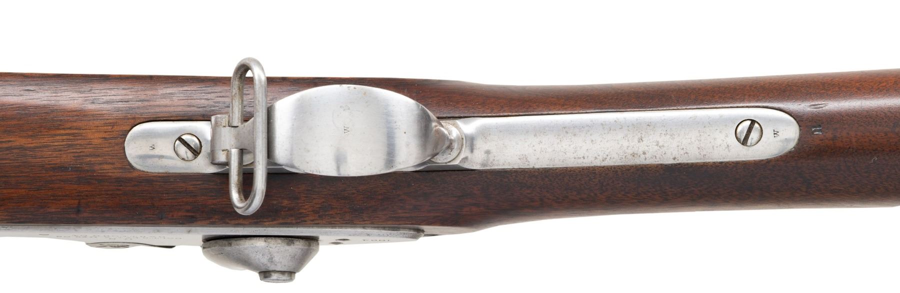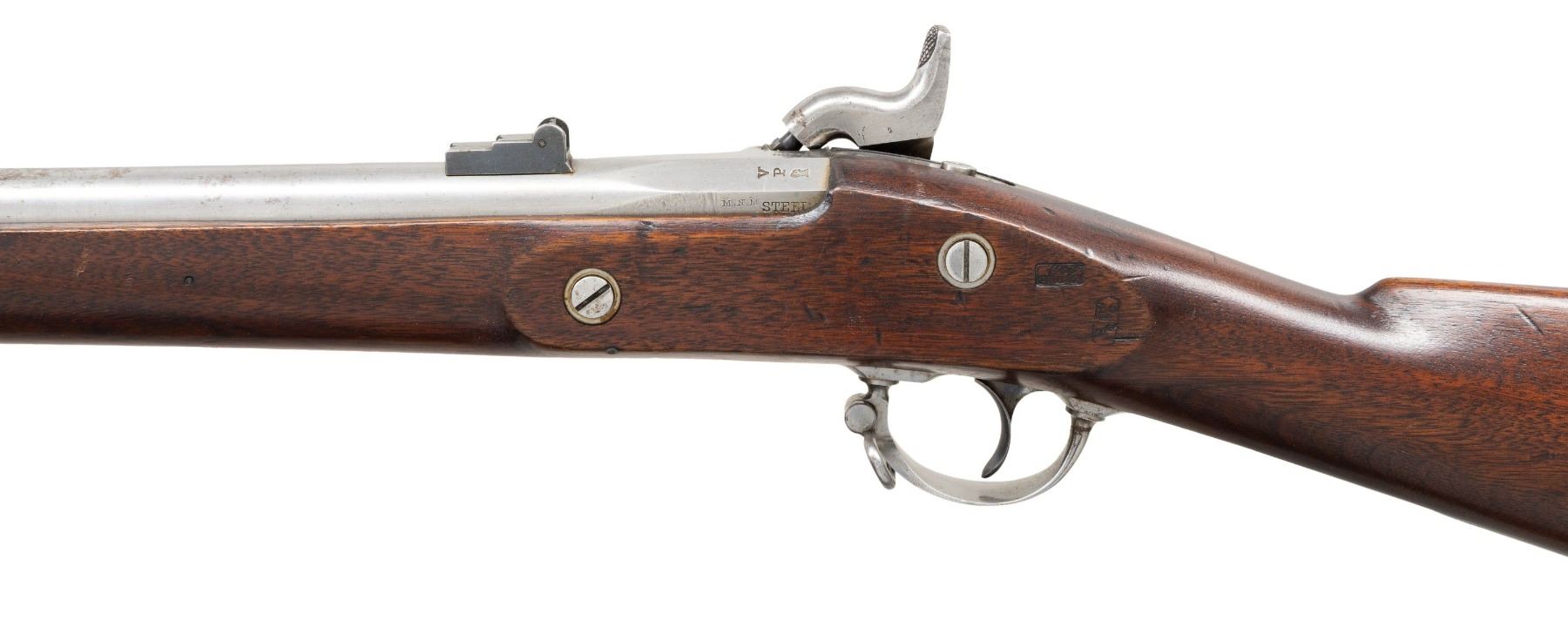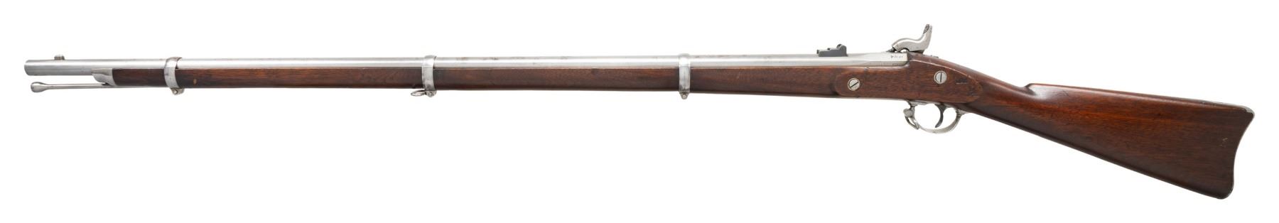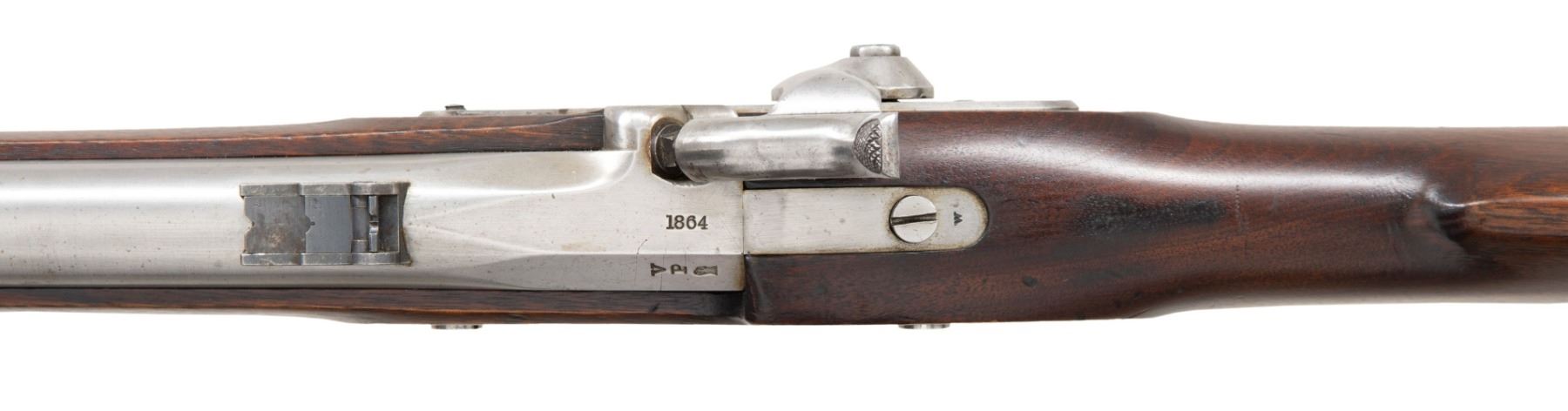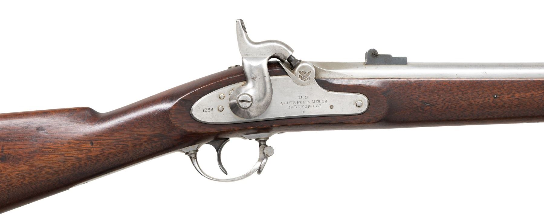 WAR MUSKET. Cal. 58. NSN. This survivor has survived in excellent original condition. Standard configuration, steel clamping bands, iron furniture, 40" barrel marked at breech: inspector "M.N.M." & "STEEL", "VP" over eaglehead, dated "1864", three position-2 leaf blued rear sight. Lock is bright with two line Colt address below "U.S.", "1864" at tail. Two bright inspection cartouches stamped in wood opposite lock. Small inspector initials on every metal part. CONDITION: excellent overall, bright metal overall, light staining, crisp markings, stock has 2 well defined cartouches, few small dings & scratches. Mechanically perfect, bright shiny rifled bore. PROVENANCE: Estate Collection of John "Jack" Dhooghe. (01-28262/JS). ANTIQUE. $2,000-3,000.