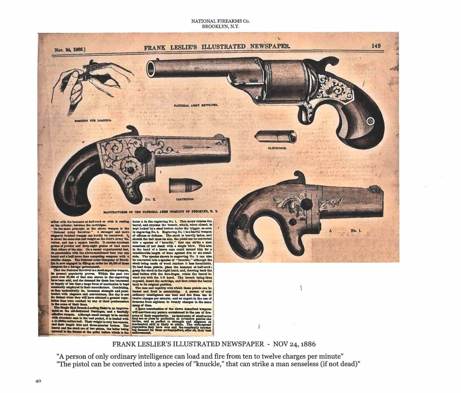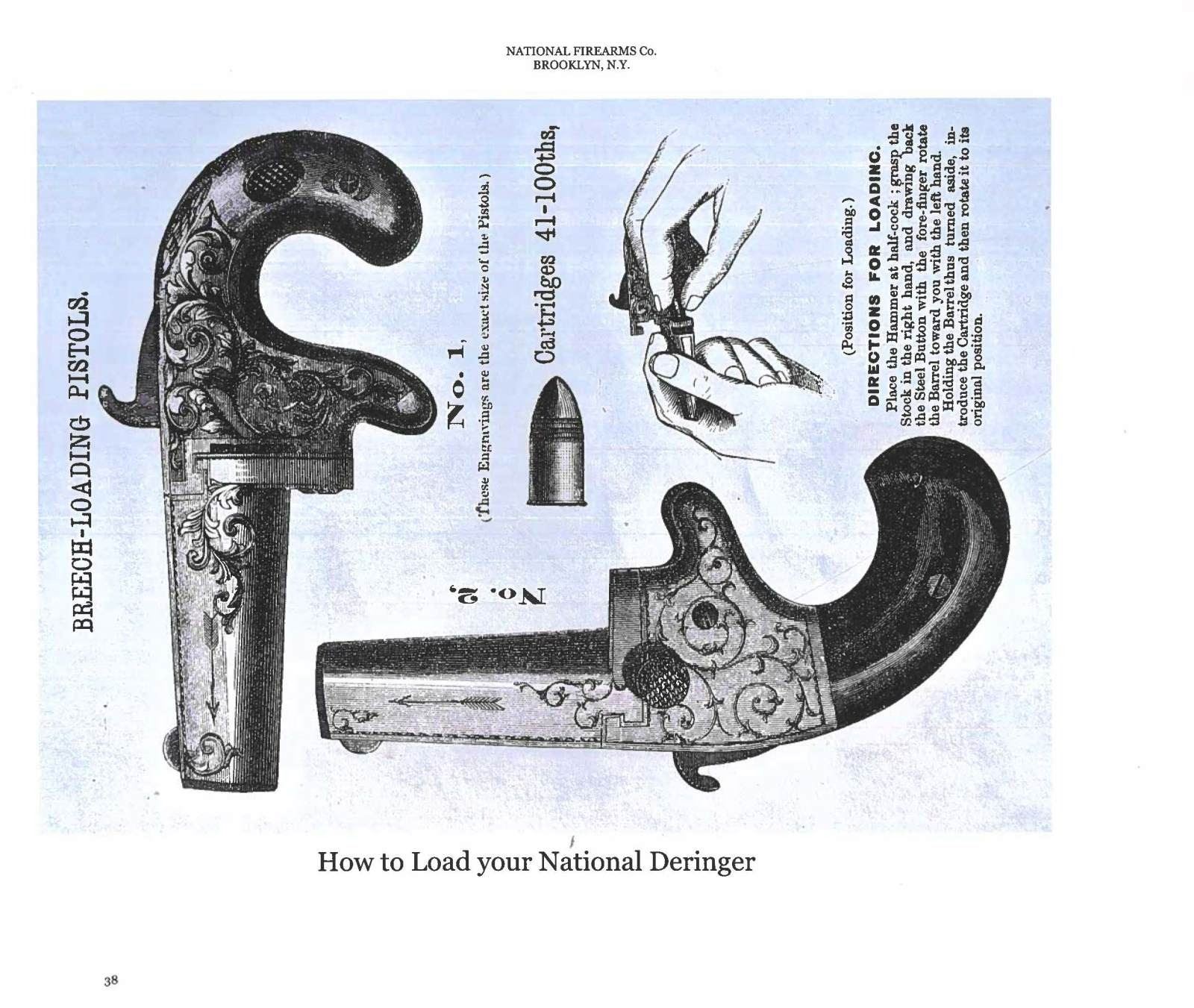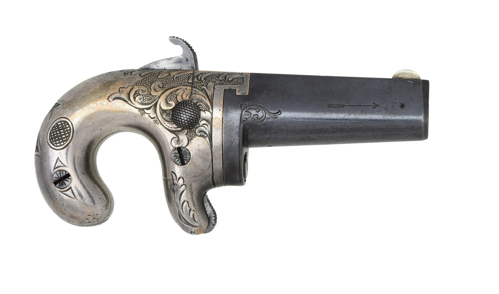 PICTURED IN EBERHART. Cal 41, S# 5034. Pictured on page 28 of Doug Eberhart's 2011 text on Colt & National Derringers. He describes this pistol as scarce: "Silver plated brass frame with blued barrel, S# 5034 is getting towards the end of production of the 1st model. It is .41 short rim fire caliber. This style finish is seldom seen". This pistol was the predecessor to Colt 2nd model derringers. Colt bought National Arms Company in 1870 and continued their manufacture of this model and selling Nationals in their inventory. Standard configuration 2.5" ovoid blued barrel with flat top: "NATIONAL ARMS CO. BROOKLYN NY", sparsely engraved brass frame. CONDITION: fine-excellent overall, retains 80-90% original blue & silver finish. Mechanically fine with good rifled bore. PROVENANCE: L.D. "Doug" Eberhart Collection; James D. Julia Auctions, lot 2233, March 14, 2014. (01-25299/JS). ANTIQUE. $1,000-1,500.