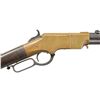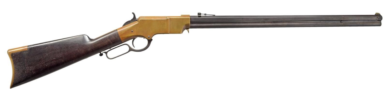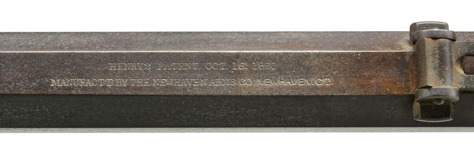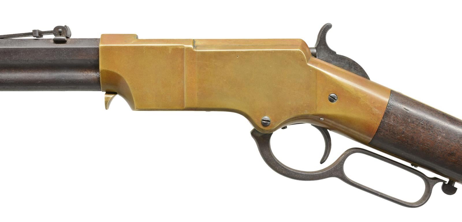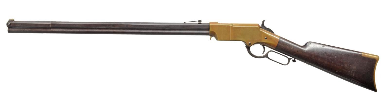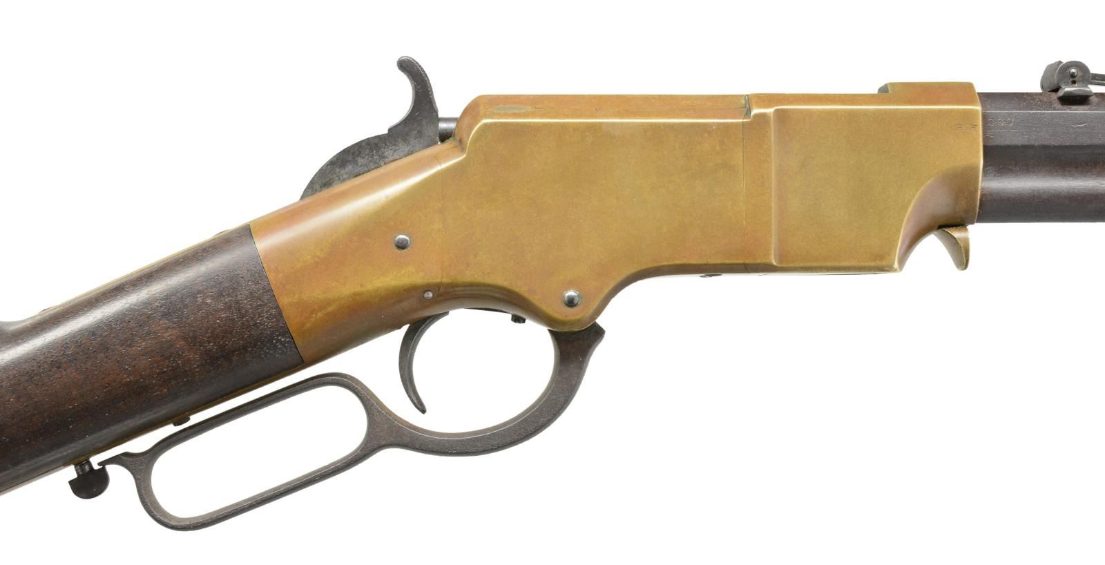 RIFLE. Cal. 44. S# 3462. In 1861 the Henry rifle was a revolutionary weapon, the most technologically advanced weapon of its day. 15 Round repeater, powerful & durable. The United States Government purchased 1731 Henrys from 1863-1865. Most desirable of these are 800 government inspected examples made in 1863 & inspected by government inspector Charles G. Chapman, of which this example is one. This rifle was part of the US government order of October 28, 1863, all being issued to the 1st DC Cavalry who were protecting Washington DC. at the time. Most of these rifles saw hard use, w/ select surviving examples being reissued in May 1865 to the 3rd US Veteran Volunteer Infantry. The three VVI regiments were organized late in the Civil War to act as elite units composed of veteran soldiers. The VVI regiments were armed w/ Henry, Sharps & Spencer rifles. Standard configuration w/ 24 1/4" oct. bbl. w/ 2 line patent & address on top flat, integral magazine, silver blade mounted on pedestal front, long range rear ladder sight, straight grain Walnut stock w/ bright exceptional inspector’s cartouche “CGC” (Charles G. Chapman), brass butt-plate w/ trap which holds original 4 piece wood/iron cleaning rod. This Henry Rifle was issued to Corp. John H. Williams (1823-1869), who originally mustered into service August 22, 1861 into Co. F, 5th New Jersey infantry. His unit suffered severe casualties at Williamsburg, Va. in May, 1862. He was wounded & captured at the battle of Seven Pines June 25, 1862, taken prisoner to Richmond, Virginia and returned to his unit late in 1864. While imprisoned in Richmond, he contracted tuberculosis. On February 25, 1865 Cpl. Williams enlisted in Company C, 3rd Veteran Volunteer Infantry where he was issued this Henry rifle as noted in the records. Veterans could keep their rifles at end of service, one of the great incentives for enlisting in the veteran volunteers. He stayed in service w/ the 3rd USVV until muster out July 20, 1866. He died less than 3 years later of “consumption” probably never having a chance to use his Henry after service. It is no doubt the reason this rifle has remained in superior overall condition. This example is a wonderful survivor in unmolested condition, well patinaed, w/ great inspector’s markings. UNATTACHED ACCESSORIES: accompanied by file of research that shows its re-issue to John H. Williams of the 3rd USVVI, his service records and a history of the 3rd VVI. CONDITION: very good-fine overall. Rifle is uncleaned w/ dark iron patina on bbl. & lever. Crisp bbl. address, serial number, & inspector initials. All original, matching serial numbers are found internally on the lower frame tang, stock upper tang channel, inside toe of butt-plate & shafts of its stock screws. Brass frame & butt-plate have a beautifully smooth & untouched light/medium mustard patina. Trigger & screws all have a portion of their original blue finish & are unmarred. Hammer retains some original case color. Stock is very fine, well fit w/ hand worn patina & as noted, a very crisp “CGC” inspector’s cartouche. Mechanics are fine, bore has crisp rifling w/ moderate pitting. An untouched example w/ stock & brass in far above average condition for this model, the way collectors love to find such guns. PROVENANCE: listed by serial number in Wiley Sword’s 2002 “The Historic Henry Rifle” inventory of the 3rd Regiment USVV. Listed by serial number in USVV Springfield Research Service Records. (01-18918/MS). ANTIQUE. $32,500-42,500.
