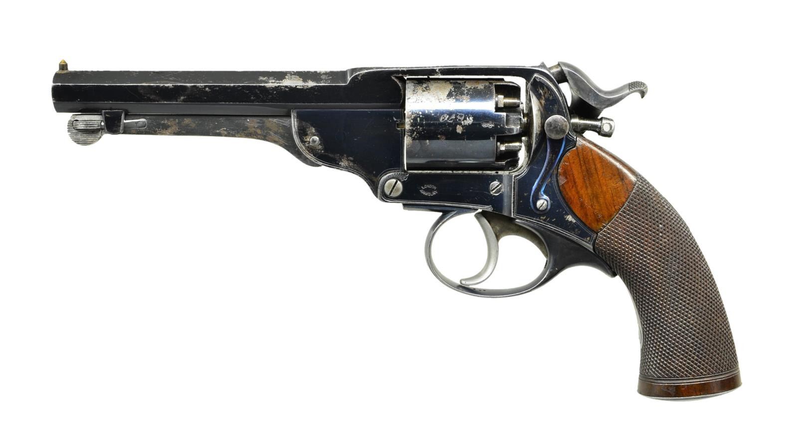 Cal. 80bore (.39). S# 870. Bbl. 5.5”. Standard configuration, octagonal blued British proofed barrel, “L.A.C” with viewing proofs. Blued frame engraved “Kerr’s Patent 870” on right side, “LONDON ARMOURY” in small cartouche on left. Case colored lock, hammer, & trigger, loading arm finished bright. Checkered & varnished walnut grip, butt cap is blued. First model Kerr’s were made up to about S# 1000. After S# 1000, revolvers are 54 bore & most were sold to the Confederacy. This is a beautiful cased revolver made just prior to Civil War retaining most of its original finish & fine original casing. You won’t find another example much better. UNATTACHED ACCESSORIES: Green baize lined compartmented oak casing with round vacant brass plaque in lid, fitted for “80” bore marked brass mold with blued steel sprue cutter, Dixon pewter oiler, unmarked bag flask, wood & brass cleaning tool, wood handled screw driver, large lacquered cap tin with Ely label. Lid has 8” x 4.5” original “Kerr New Patent Revolving Pistol” label with red over stamp “SOLE MANUFACTURERS / THE LONDON ARMOURY COMPANY, LIMITED”. CONDITION: revolver is very fine, retaining 90% plus original bright blue finish, most muted case colors, loading lever retains most factory finished bright polish, crisp markings, fine grips with most all original factory varnish. Mechanics crisp, sliding safety fine, bright shiny rifled bore. Casing internally fine, sprue cutter retains about half its thinning blue, cap tin label is badly chipped & scuffed and a green label can be seen under it, label has small reduction where rubbed against cylinder. Casing externally sound, well fit, scattered small cosmetic blemishes, missing key escutcheon. (01-22977/JS). ANTIQUE. $4,000-5,000.