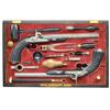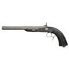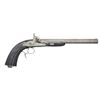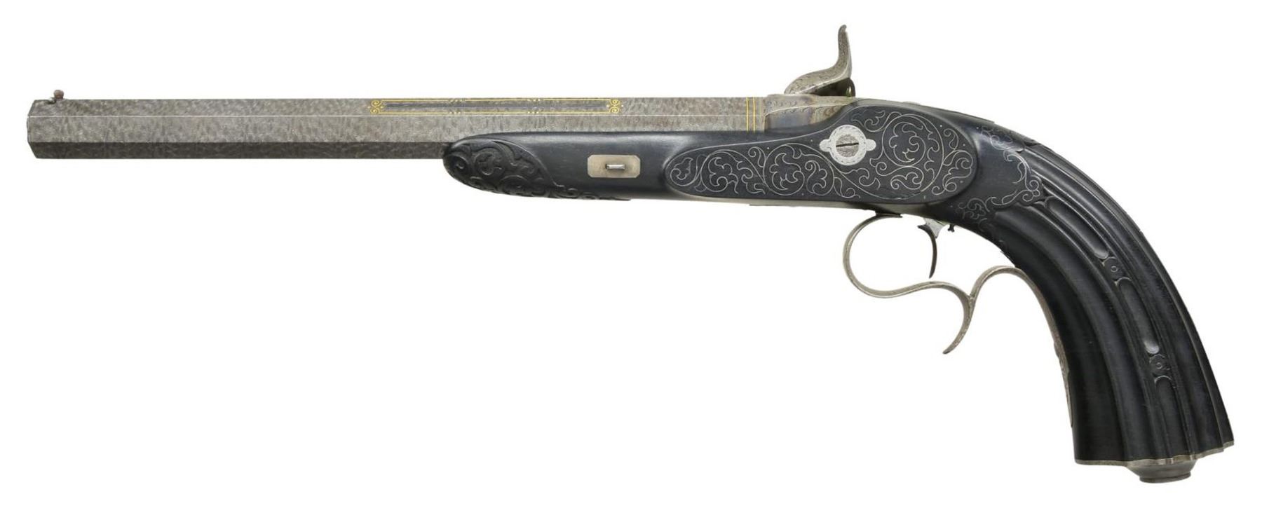 BY A. JANSEN OF BRUSSELS. Cal. 50 multi groove rifling. NSN. Adolfe Jansen was working between 1843-47 and had 4 patents for pistols, targets and bullets. These finely crafted pistols have 10 3/8" octagon bbls. of etched best Damascus. Top three flats are engraved "JANSEN ARQEBUSRER" "A BRUXELLES" "BREVETE DU ROI" on silver rectangles surrounded by gold inlaid line, dot and scroll borders. Gold bands are also at breech ends and guns are numbered "1" and "2" inlaid in gold on breech plugs and breech irons. These parts are also engraved with high quality open scroll. Breech irons are fitted with integral V-notch rear sights. Front sights are steel beads on turned transverse bars. Percussion island locks with deeply rebated tails & paneled serpentine hammers are engraved with more open scroll. Maker's name and address are on silver device surrounded by more gold wire inlay in front of hammers. Stocks of ebony have long fluted grips with steel caps. Stocks are also fitted with set triggers in simple trigger plates and trigger guards with finger spurs. Stocks are embelished with inlet silver wire in scrolling patterns as well as relief carved scrolling acanthus at tips. UNATTACHED ACCESSORIES: guns are housed in their original Brazilian walnut veneered case with brass corners and crestplate on top engraved "AT". Case is lined in purple velvet. Pistols and mostly original array of accessories are in French fitted bottom compartment. Accessories include steel ballmold with sprewcutter on tip, fancy embossed copperbodied powder flask depicting scrolling leaves and goats, steel bullet pouring ladle and its ebony handle, ebony loading mallet, steel wadpunch, ebony cleaning rod with white bone tip, ebony loading rod with brass head, steel adj. powder measure, brass and pewter oil bottle and ebony handled nipple wrench. A covered compartment with white bone handle contains key. Case comes with green cloth storage bag. CONDITION: very fine. Bbls. retain essentially all of their attractive gray etched Damascus finish with a few minor spots. Breech plugs, locks and grip caps retain nearly all of their French gray finish. Trigger guards show some light cleaning on finials and staining on grips. Stocks are also excellent with few noted marks in their smooth light oil finish. Raised carving remains crisp. Silver wire inlay shows some minor losses and lifting wires. Bores are bright and shiny with sharp rifling throughout. Mechanically fine. Exterior of case retains about 90% of its original French polish with later overall cleaning and smoothing over some scattered light marks and a few deeper. There are a few minor shrinkage cracks noted on top. Brass is nicely toned. Interior cloth is very good to fine with rubs, compressions and light soiling. It appears that a label has been removed from lid. Bottom compartment is also very fine with some browning of velvet. Accessories are good with some darkening of finish on steel. Nipple wrench appears to be a newer replacement of lesser quality. (01-21610). ANTIQUE. $12,000-18,000.