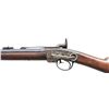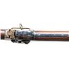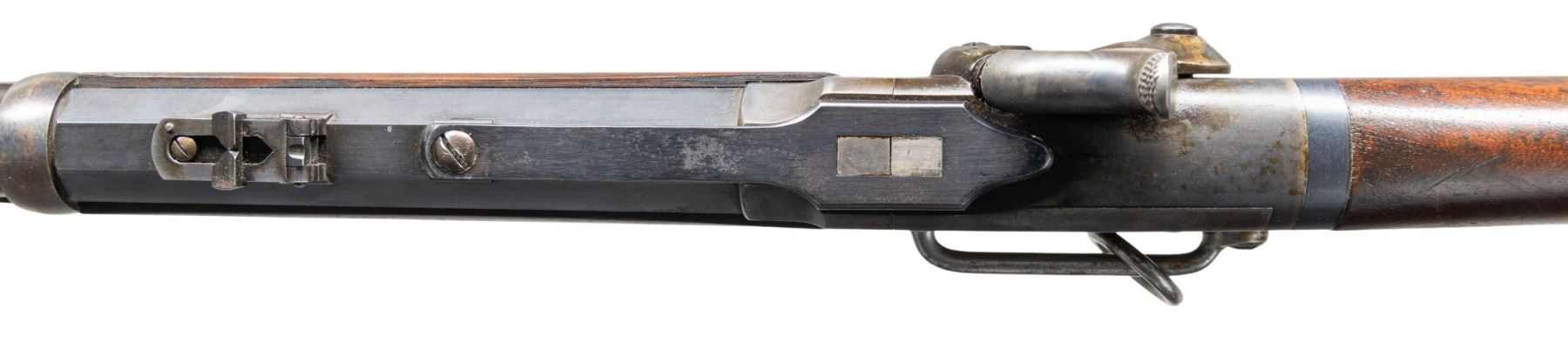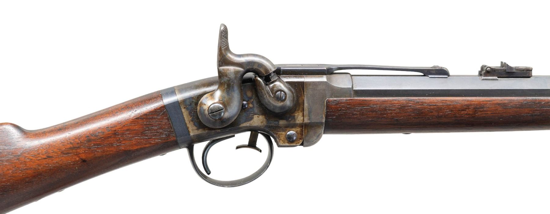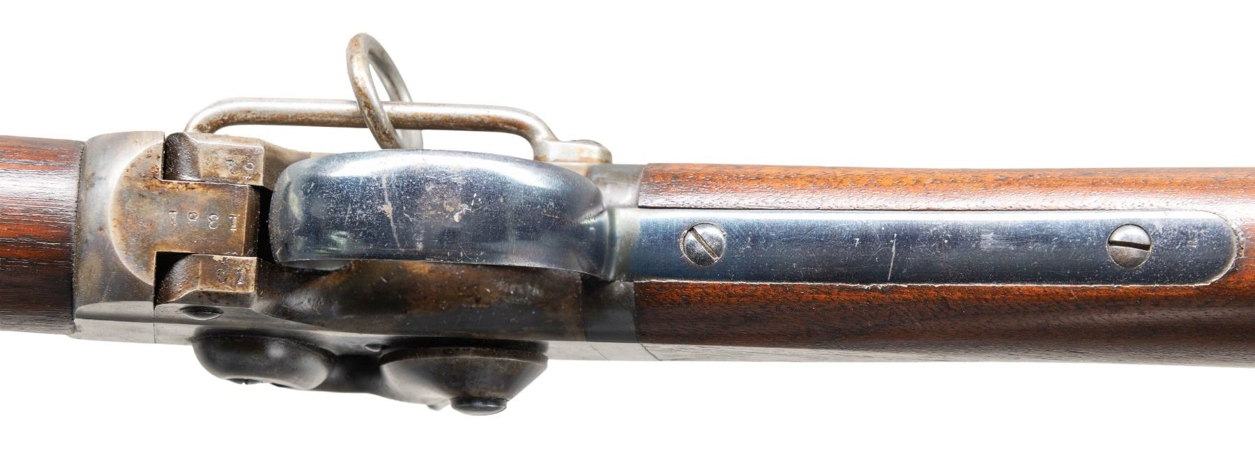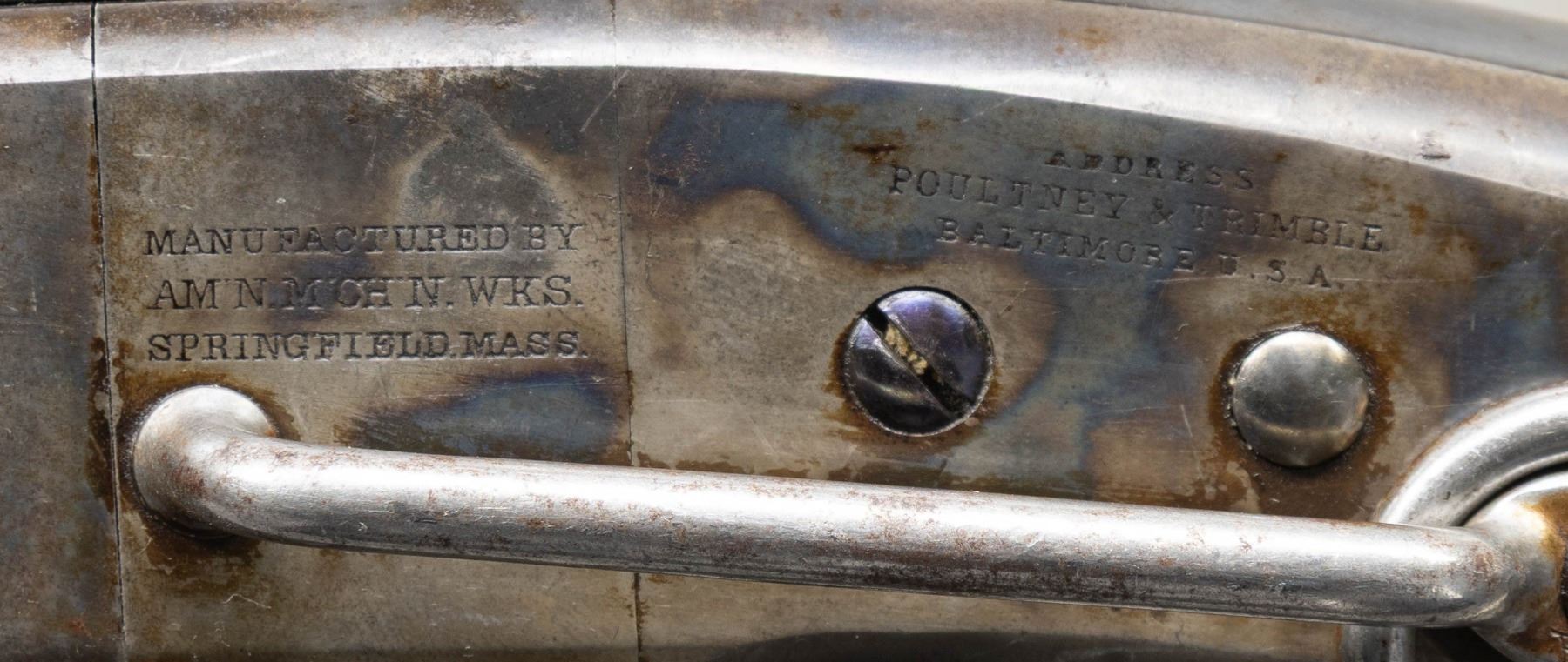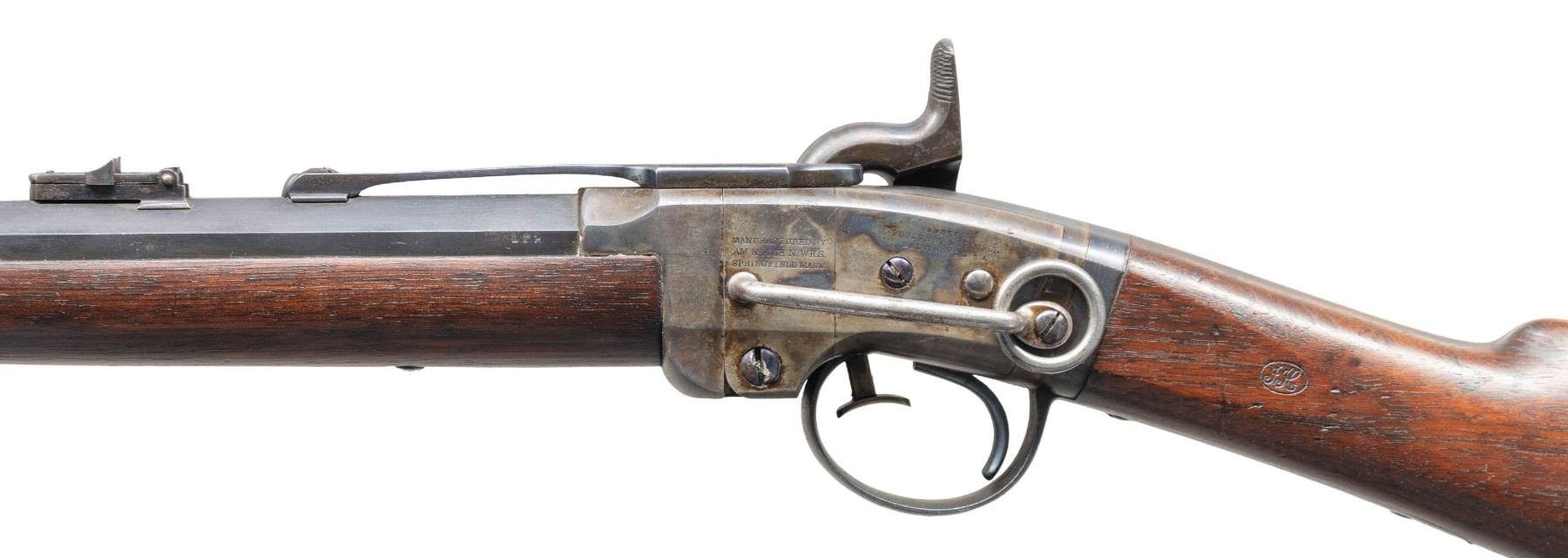 Cal 50. S# 1381. This popular Civil War carbine saw little use and retains most all of its original bright finish. Standard configuration, 21-5/8" part octagonal to round barrel, iron mounted, blue and case color finish. Left side of breech is marked "ADDRESS / POULTNEY & TRIMBLE / BALTIMORE, U.S.A." & "SMITH'S PATENT / JUNE 23 1857" & "MANUFACTURED BY / AM'N M'CH'N WKS / SPRINGFIELD MASS". CONDITION: fine to excellent overall, barrel retains over 90% blue finish, scattered scratches, frame & hammer retains about 90% bright case colors, most of its original fire blue is found on frame ferrule & barrel to frame latch. Stocks are fine with single bright inspector cartouche, small cosmetic blemishes. Mechanically fine with bright shiny rifled bore. PROVENANCE: Estate Collection of John "Jack" Dhooghe. (01-28228/JS). ANTIQUE. $2,500-3,500.