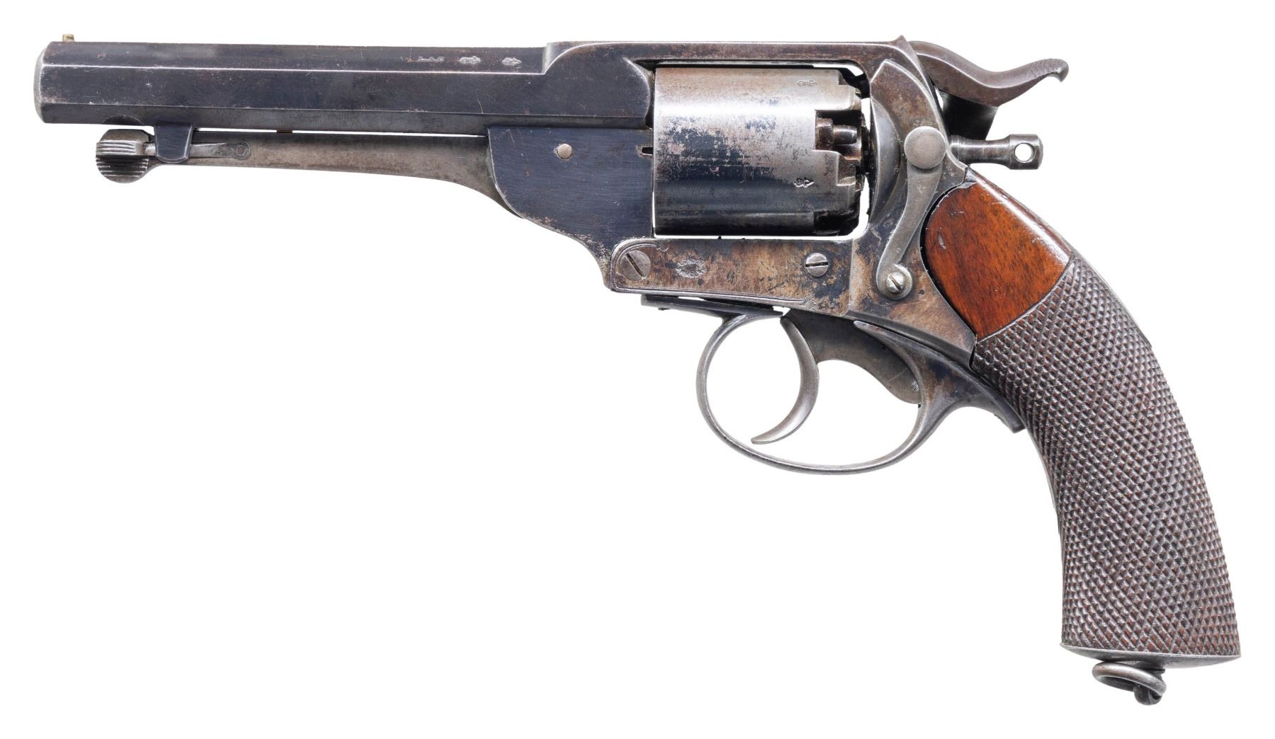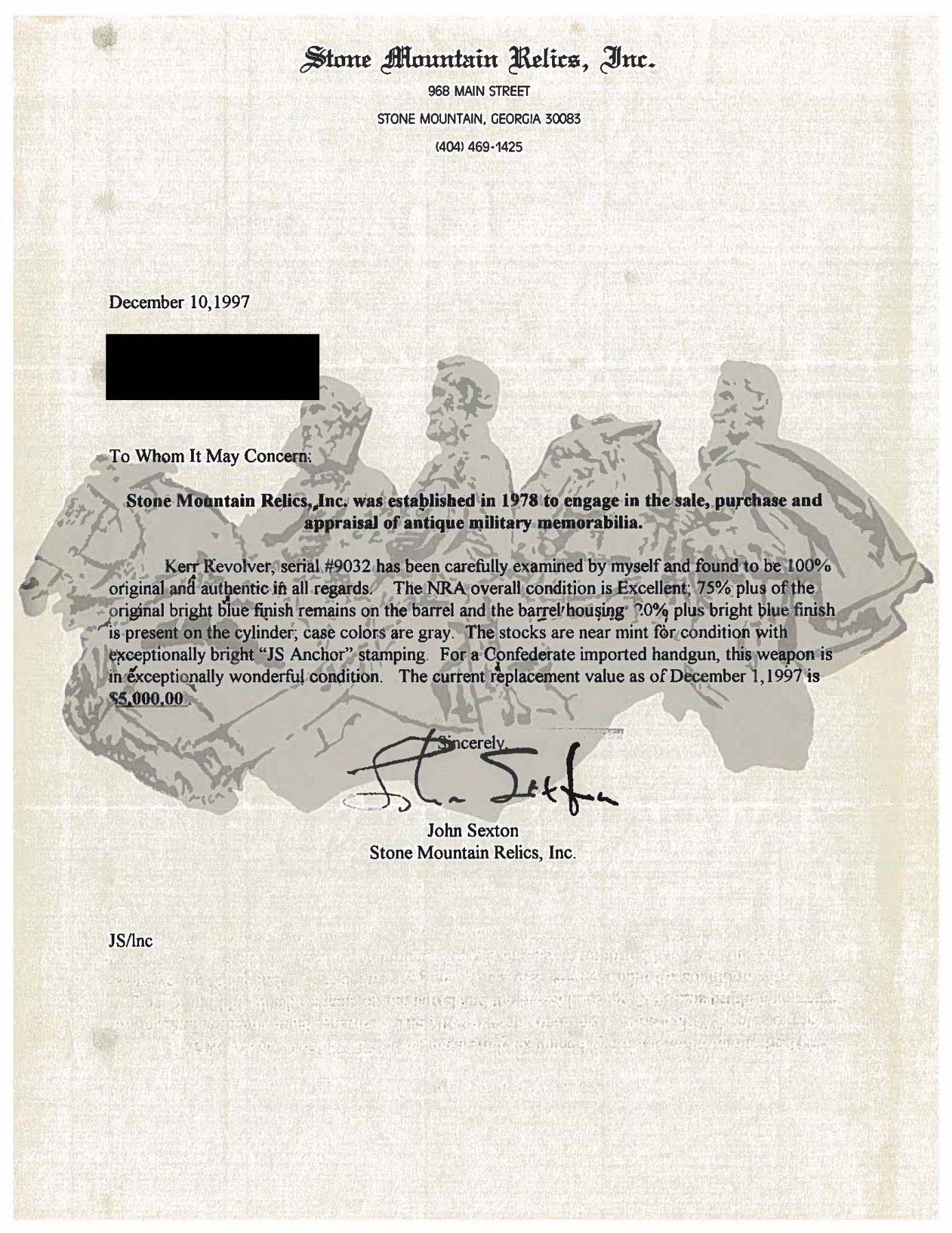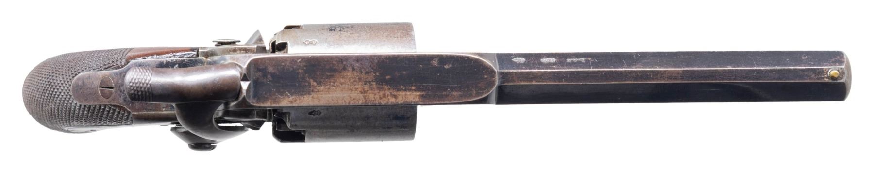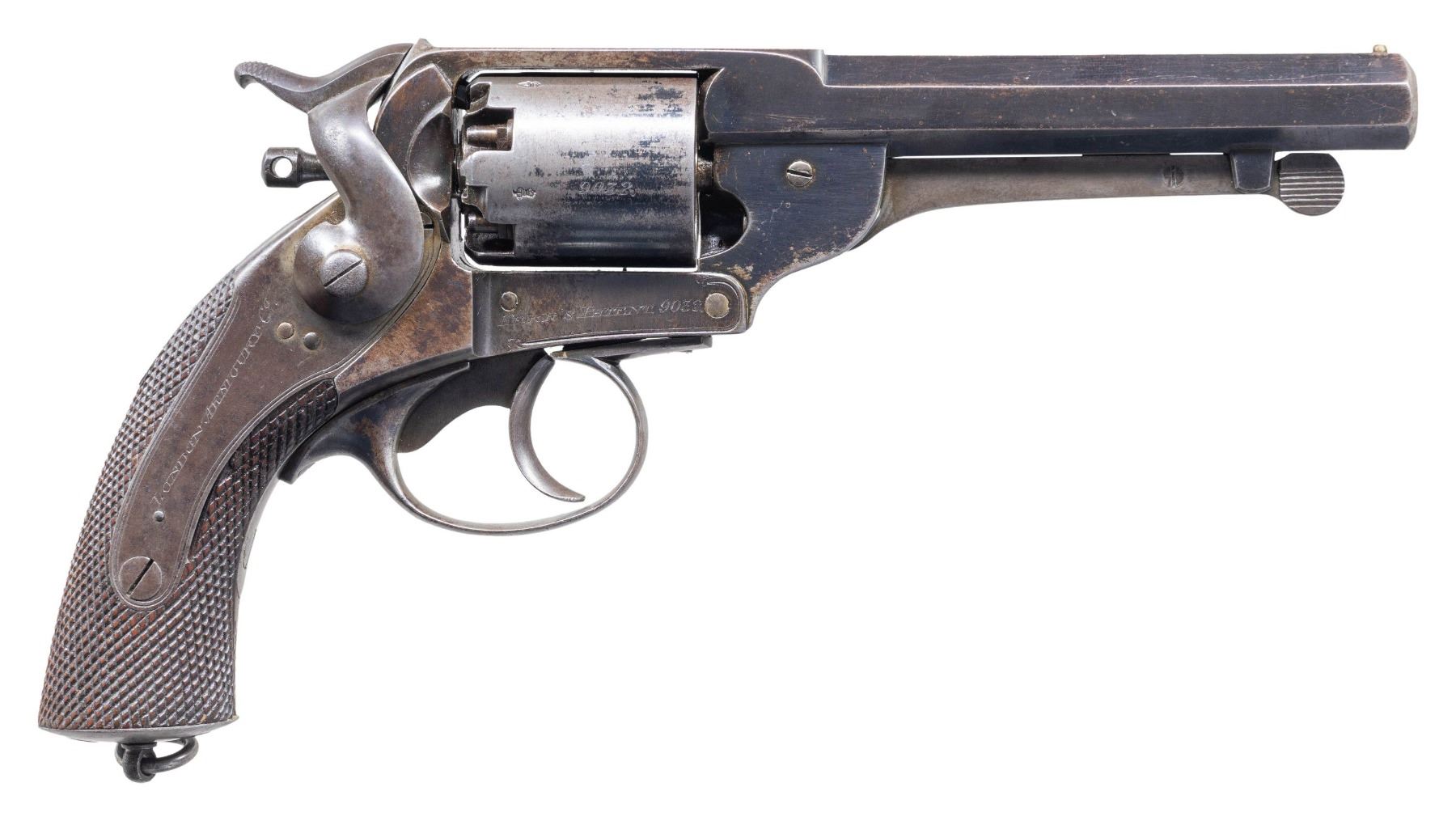 Cal. 44. S# 9032. The London Armoury Co. produced about 11,000 large 54 bore revolvers from 1859-1866. The largest part of that production was purchased by the Confederacy, and most have the Confederate inspection mark of John Southgate, "JS/anchor" and this marking is especially crisp on this revolver. 7 Kerr revolvers are known by S# used by Company H, 18th Virginia Cavalry listed on the squad roll of Lt. Julian Pratt, July 1864. The 7 guns on Pratt's list are in S# range 9240-9974. This is a beautiful and high condition example of a normally well-worn Confederate revolver. UNATTACHED ACCESSORIES: file of provenance & research. CONDITION: fine overall, original & matching, frame retains 80%+ bright original blue, frame & cylinder retain 10-20% original blue, crisp markings. Grip has crisp checkering, "JS/anchor" is very crisp. Mechanics are fine, crisp rifled bore. PROVENANCE: ex-Dr. Zack Catterton collection, James Julia Auction April 11, 2017, Estate Collection of John "Jack" Dhooghe. (01-28222/JS). ANTIQUE. $5,000-7,000.