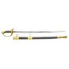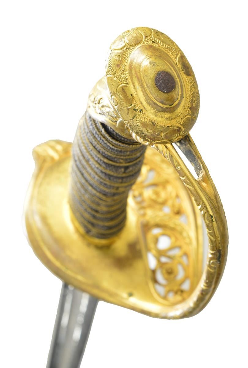 CONDITION: very fine overall, blade retains virtually all its original polish and luster with light staining. leather scabbard body is sound retaining most of its polished finish, seam unsewn not affecting aesthetic. brass hilt, pommel, and scabbard mounts retain much of their original gold wash. All in all a beautiful sword that was very expensive when it was purchased. (02-19181/JS). $3,000-5,000.