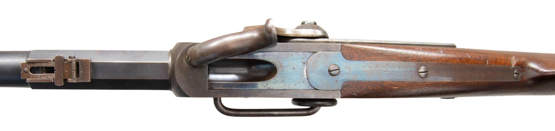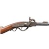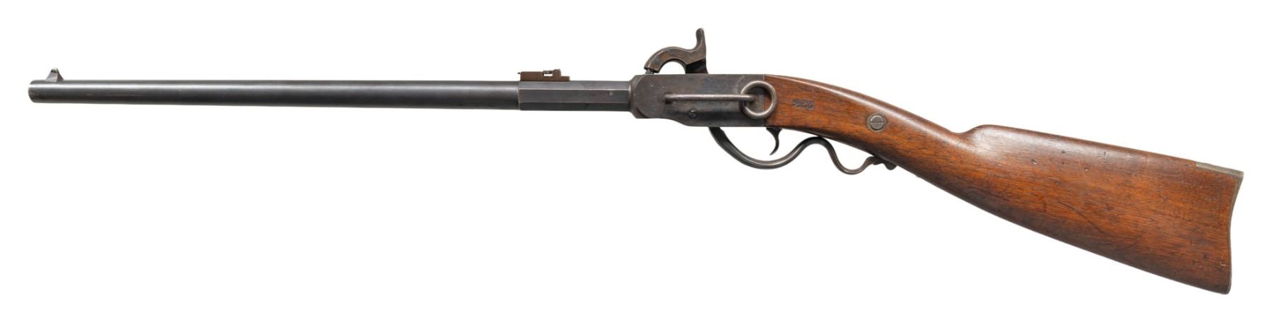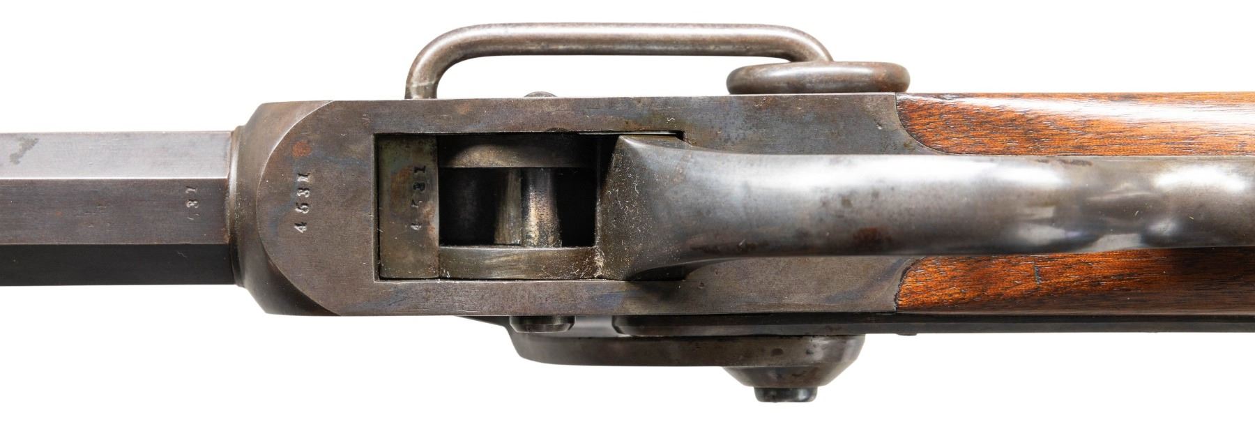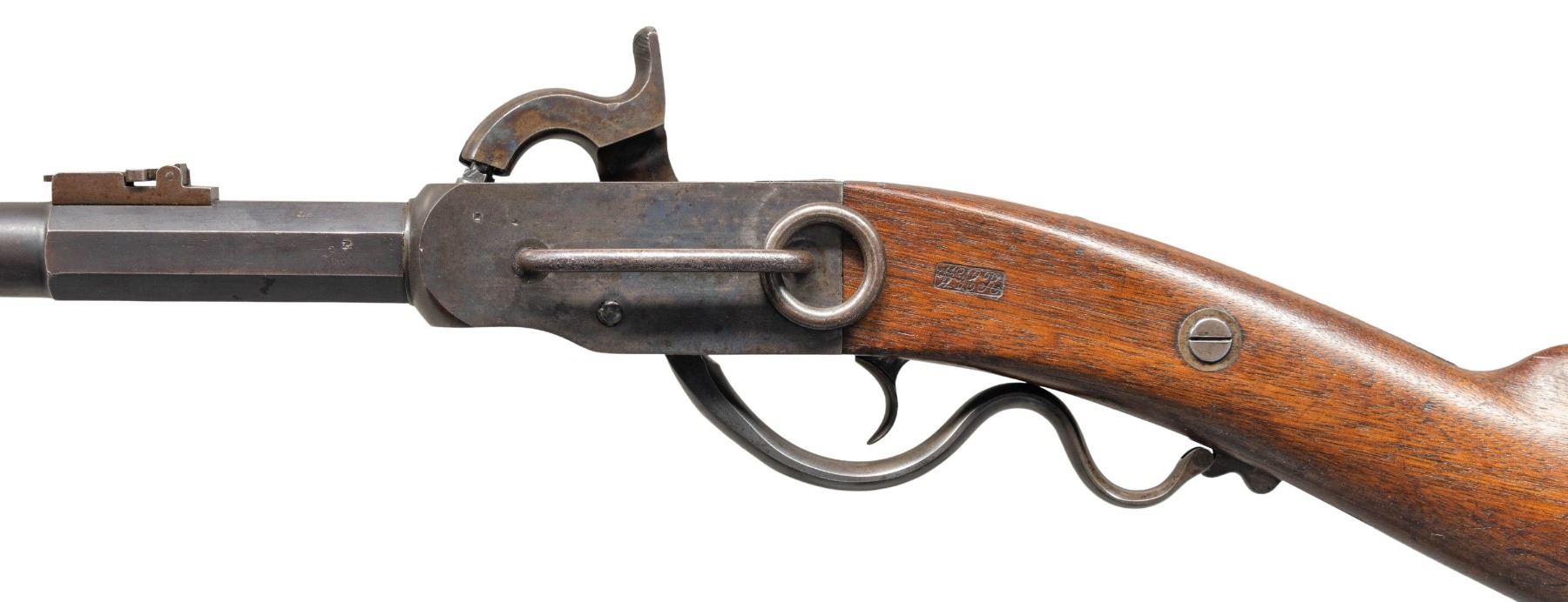 CARBINE. Cal. 52. S# 4531. These carbines were nicknamed the "grapevine" carbine because of the snake like curves of the trigger guard lever & long ungainly hammer. About 8000 carbines made 1863-1864, this is standard 2nd model which had all the improvements of earlier models, heavy flat supported hammer and sturdier trigger guard with less curve. Cavalry units in Arkansas, Missouri, Iowa, Kansas, Wisconsin & Tennessee received these carbines. This is a beautiful survivor retaining most of its original finish showing little use. CONDITION: fine to excellent overall, matching, complete & original. Barrel retains 95% thinning factory blue finish. Frame, hammer, & lock retain about half their muted case colors, crisp markings, stock has raised grain with crisp inspection cartouche. Mechanically fine, bright shiny rifled bore. PROVENANCE: Estate Collection of John "Jack" Dhooghe. (01-28267/JS). ANTIQUE. $2,000-3,000.