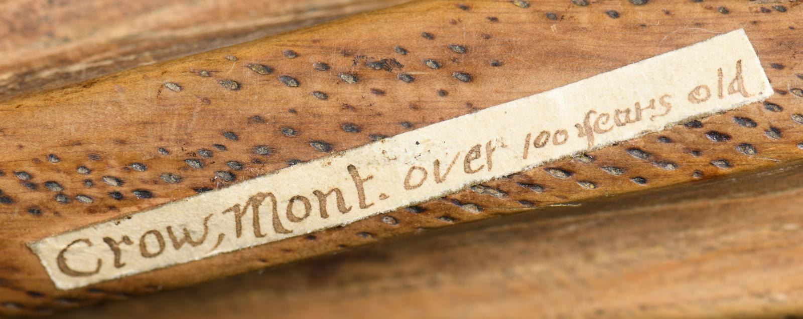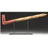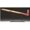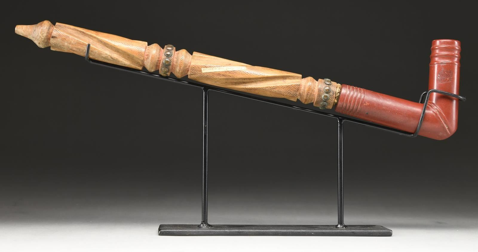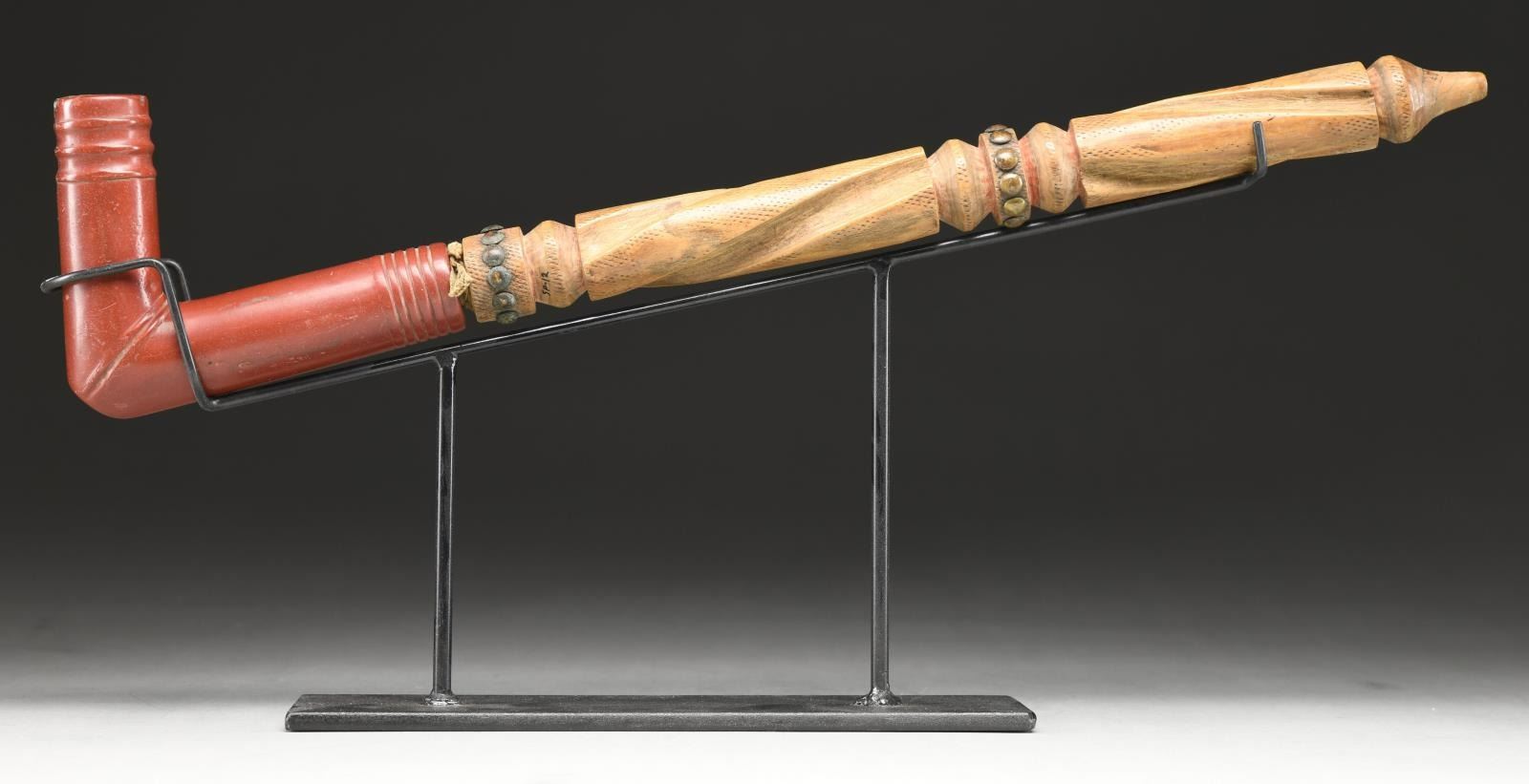ORIGINAL CARVED WOOD STEM. Pictured on page 26 of John Baldwin's 2007 book, "RED PIPES", 19.5" overall with attached stem which is carved in stages with raised rings and long swirled sections, two of the rings are studded with well patinaed brass tacks. Old brown ink skinny 2" paper label pasted reads: "Crow, Mont. Over 100 years old". UNATTACHED ACCESSORIES: custom wrought iron stand presents pipe beautifully. CONDITION: very good overall, pipe has been smoked a lot based on tarry concretion in bowl, stem has hand worn patina with traces of red paint in protected areas, old pasted ink label is fine. PROVENANCE: From the Lifelong Collection of Glen E. Mattox. (02-18784/JS). (02-18784/JS). $800-1,200.