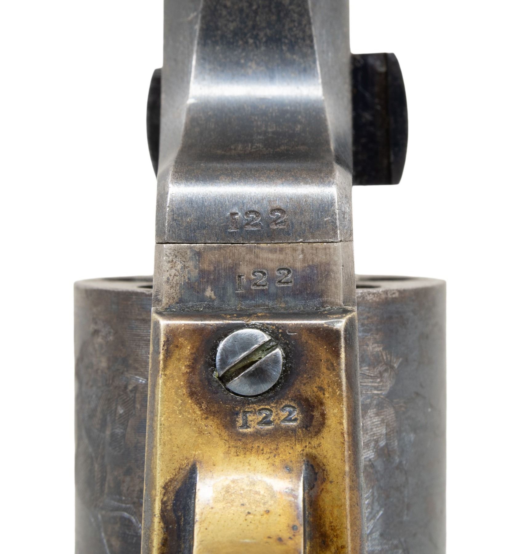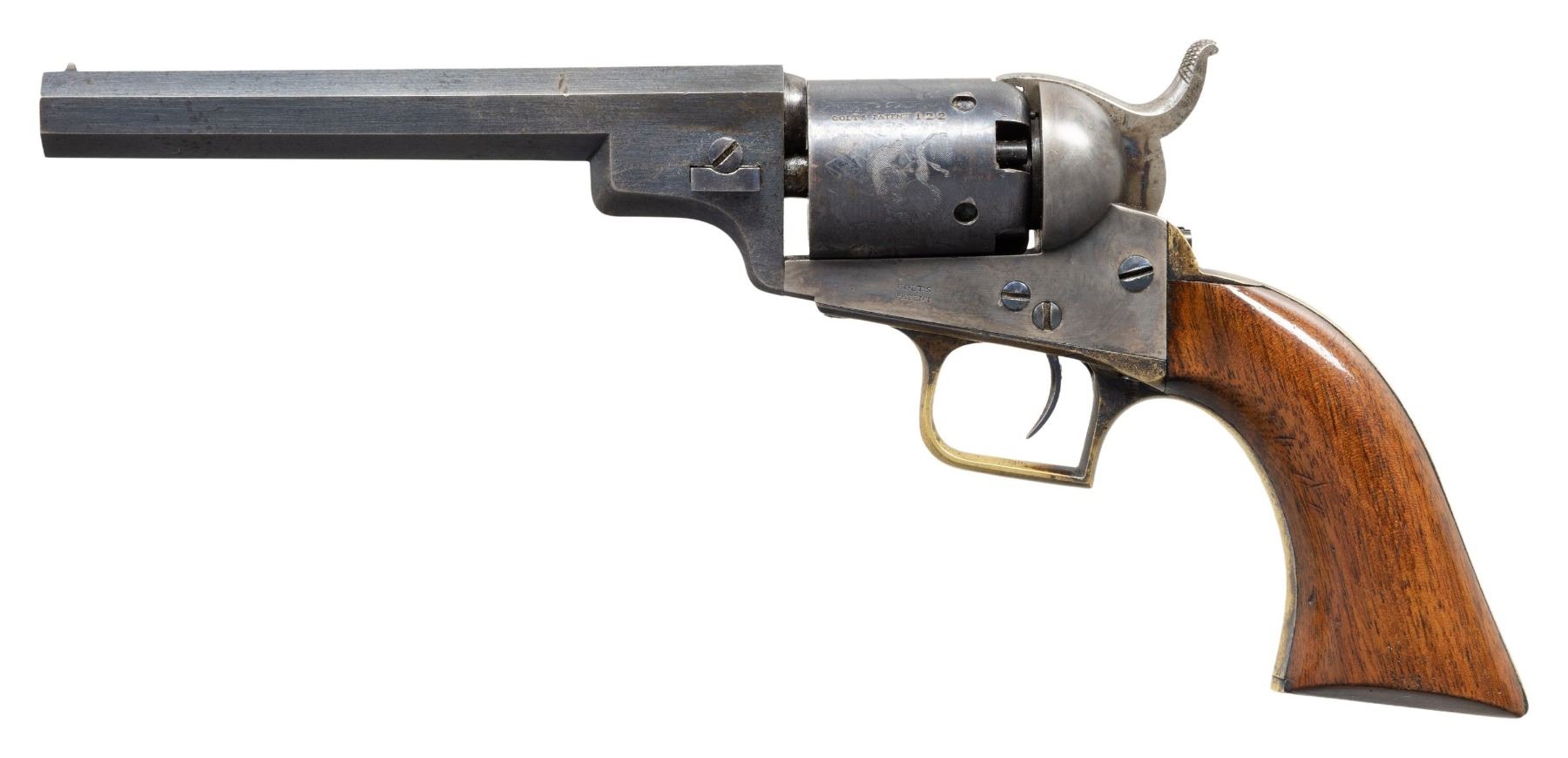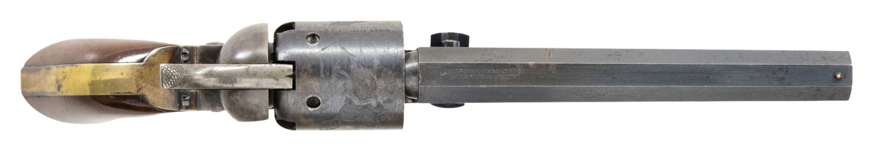 REVOLVER. Cal. 31. S# 122. The baby dragoon was the first revolver made by Colt after Paterson production ended and this is the finest example known of this earliest production. Earliest features include left hand address, highest S# with left hand address is 767. Earliest hammer with long hand filed knurling, & earliest hammer face with drilled hole to accept the tiny safety pin on back of cylinder, highest S# with this feature is 415. Revolver was made in 1848 with longest 6" barrel, 5-shot cylinder with "Dragoon & Indian Fight" rolled scene with small 1-line "COLT'S PATENT" stamped before S#, a single tiny safety pin is still crisp and rarely seen as so fragile and changed early to larger diameter pin with slotted hammer to fit. Case hardened frame has earliest "COLT'S / PATENT" marking with apostrophe. Brass back strap & trigger guard are silver plated and hold 1-piece walnut grips. Revolver is housed in an original Colt beveled Paterson style case fitted for pistol, 2-cavity brass "COLT'S PATENT" mold, "COLT'S PATENT" double sided eagle & arms flask, yellow label COLT PISTOL cap tin, nipple wrench, & cartridge pack. This is by far the finest early 1848 baby dragoon with early features. UNATTACHED ACCESSORIES: pertinent pages from Jordon & Watt's text "Colt's Pocket '49, its Evolution including the Baby Dragoon" showing this revolver. CONDITION: excellent overall, complete & matching, crisp markings. Revolver retains 80%+ original blue & muted case color, cylinder has complete cylinder, complete functional single safety pin, grips are fine, grip frame retains strong traces of silver wash. Mechanics are fine, bright rifled bore. Casing is fine overall, flask retains most of its original varnish, mold is fine. PROVENANCE: Martin Lane Lifelong collection. (01-28173/JS). ANTIQUE. $25,000-45,000.
