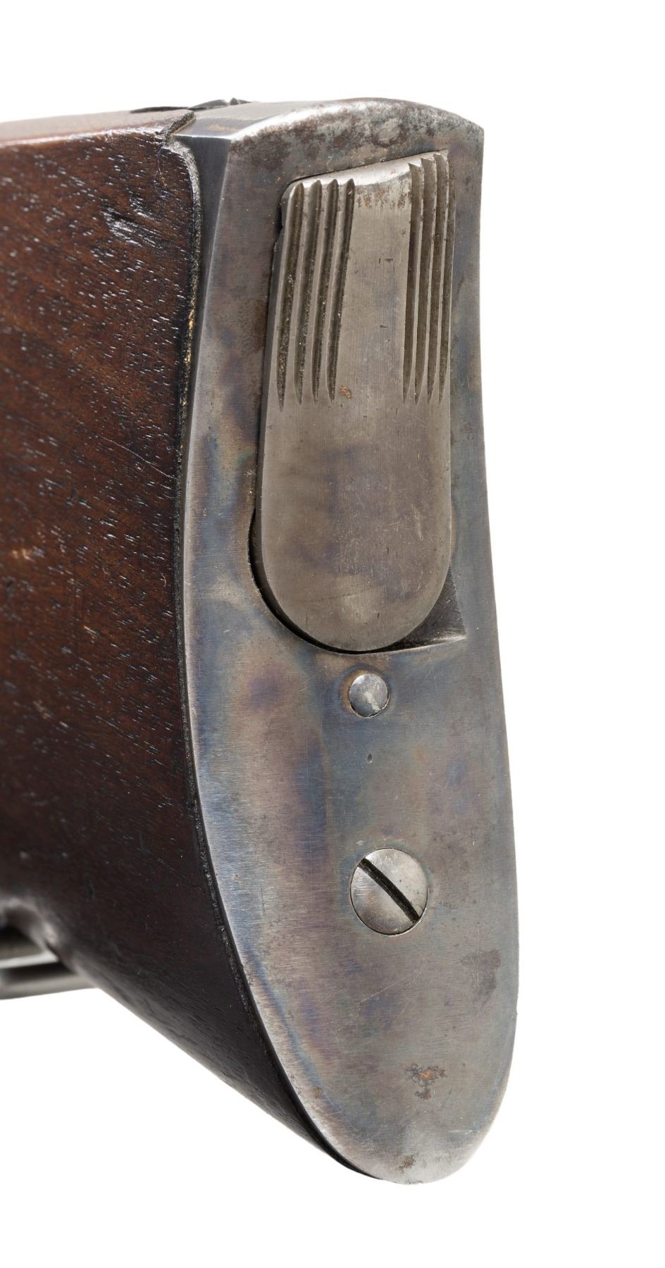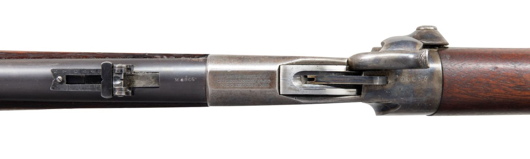 Cal. 50. S# 91677. Standard configuration of rifle made 1865-1867. 30" 6-land & groove rifled barrel stamped "M 1865", 4 line address "SPENCER REPEATING / RIFLE CO. BOSTON / PAT'D MARCH 6 1860" stamped on breech. This is a very fine survivor retaining most of its original finish and shows little if any use. CONDITION: excellent overall, barrel retains 95%+ thinning blue finish, frame & breech retain good muted case colors, stocks are excellent with few cosmetic dents & scratches, mechanics are crisp, sharp shiny rifled bore. PROVENANCE: Estate Collection of John "Jack" Dhooghe. (01-28264/JS). ANTIQUE. $3,000-4,000.