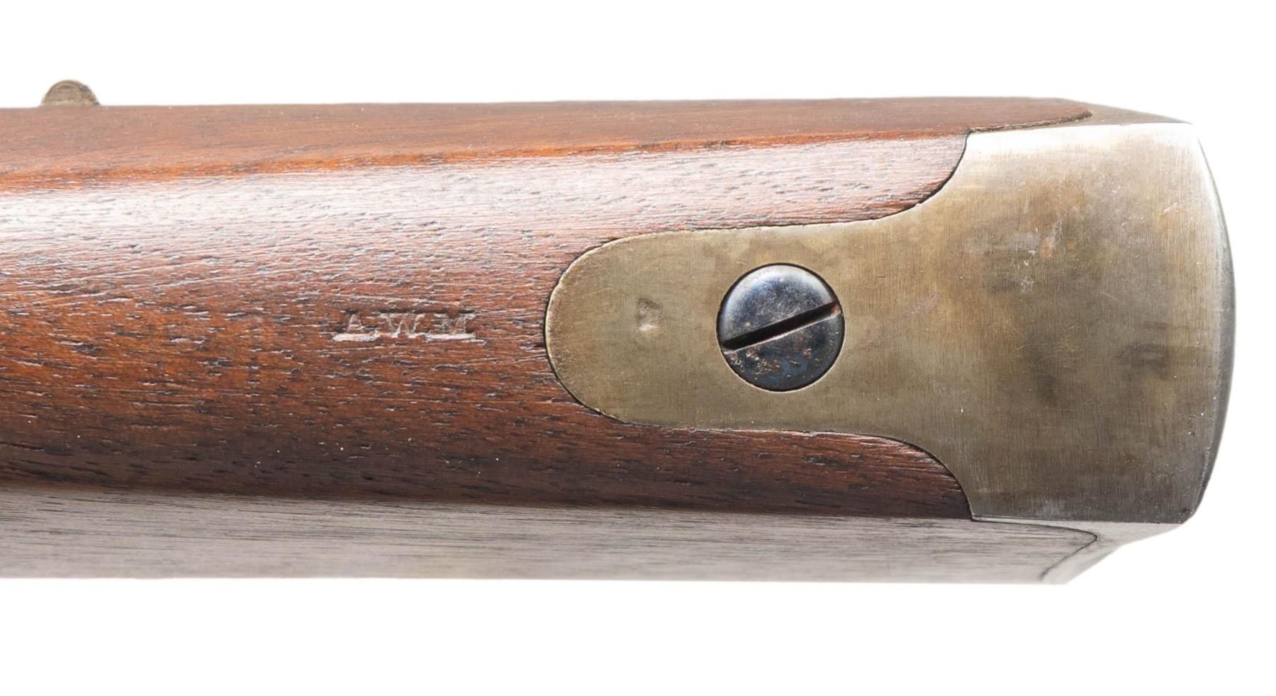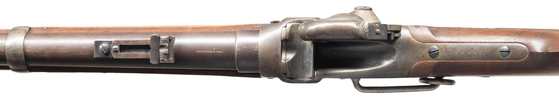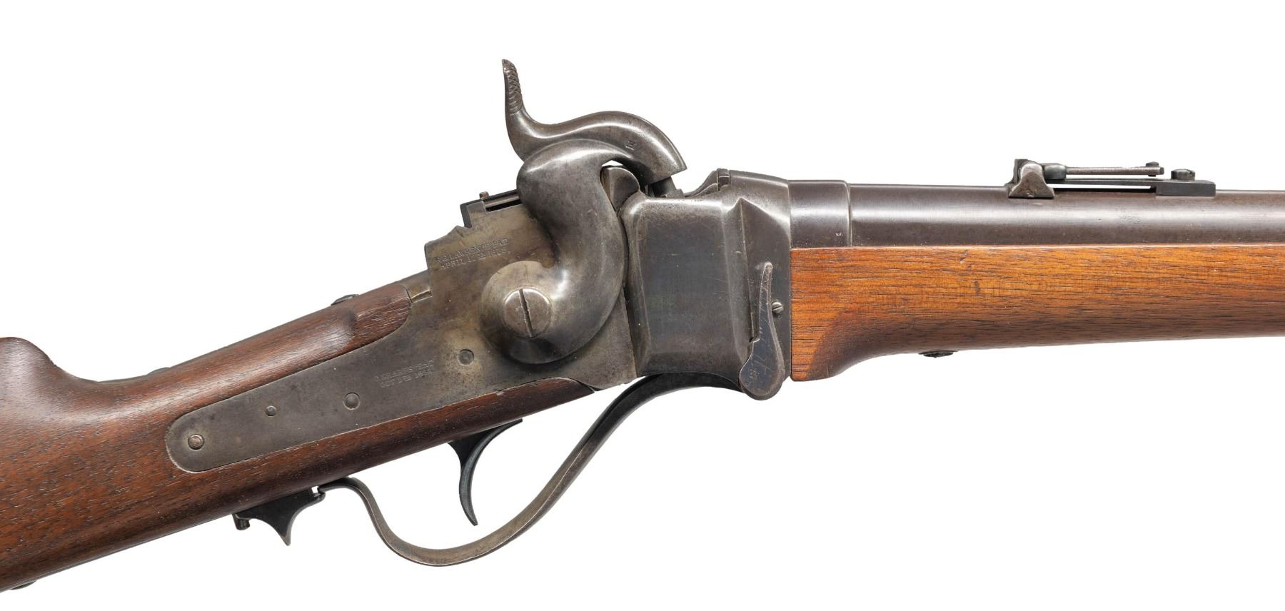 Cal. 52. S# 58135. Standard configuration 1859 New Model Sharps carbine with hinged iron toolbox, 39" overall with 22" barrel, adjustable Sharps rear sight, Sharps patent markings on barrel, lock, and frame. Carbine has been arsenal refinished with new wood. Buttstock has 2 bright late war cartouches "AWM" and "TWB". Small "AWM" inspection on top of comb, and "DFC" postwar cartouche on left buttstock rear of sling bar. This is a very fine survivor of both Civil War and Indian War era. CONDITION: excellent overall, complete & matching, metal has traces of blue and case colors, stocks with raised grain, crisp inspection marks, mechanics fine, fine rifled 6 land & groove bore. PROVENANCE: Estate Collection of John "Jack" Dhooghe. (01-28268/JS). ANTIQUE. $2,500-3,500.